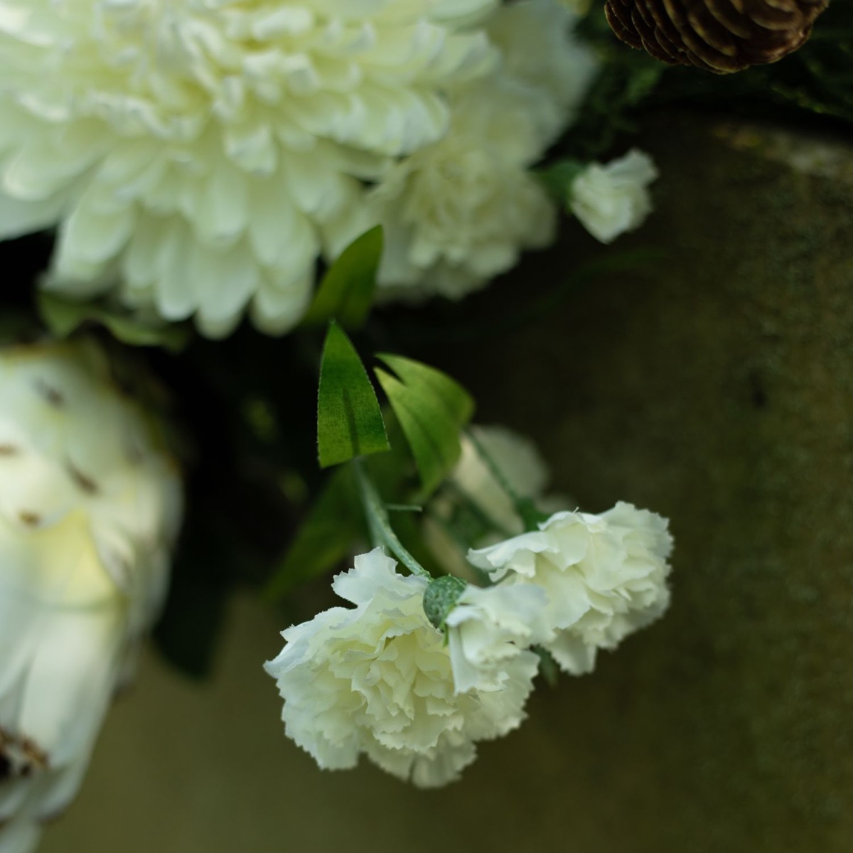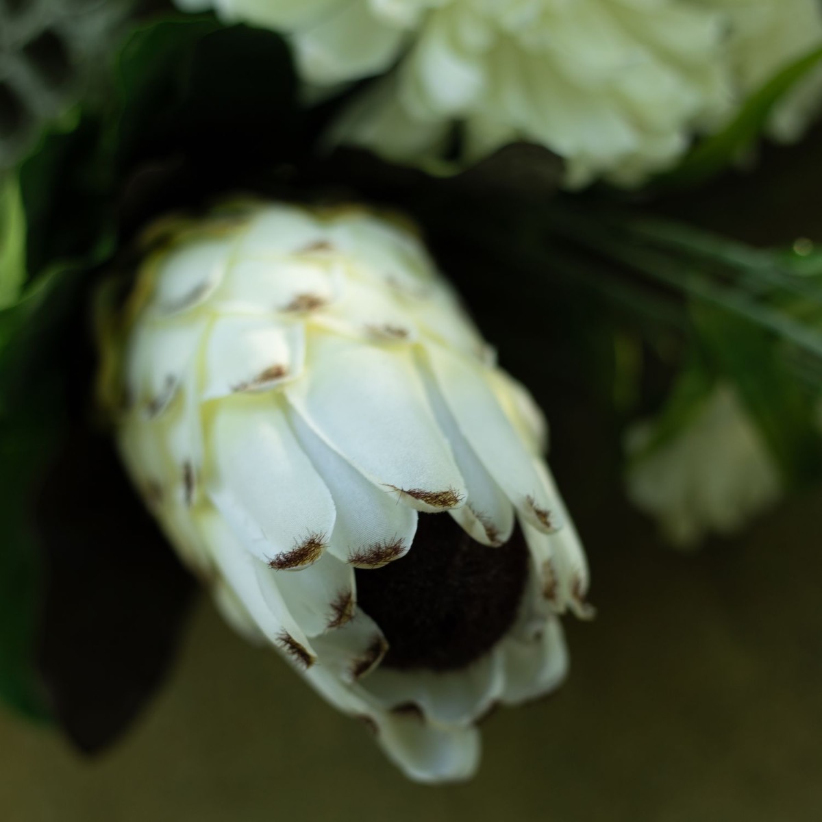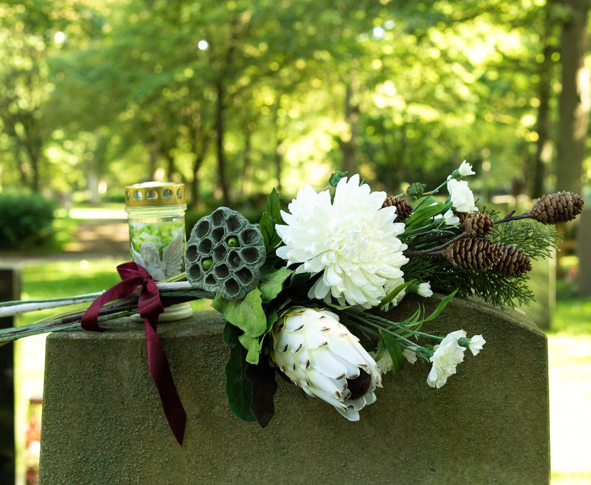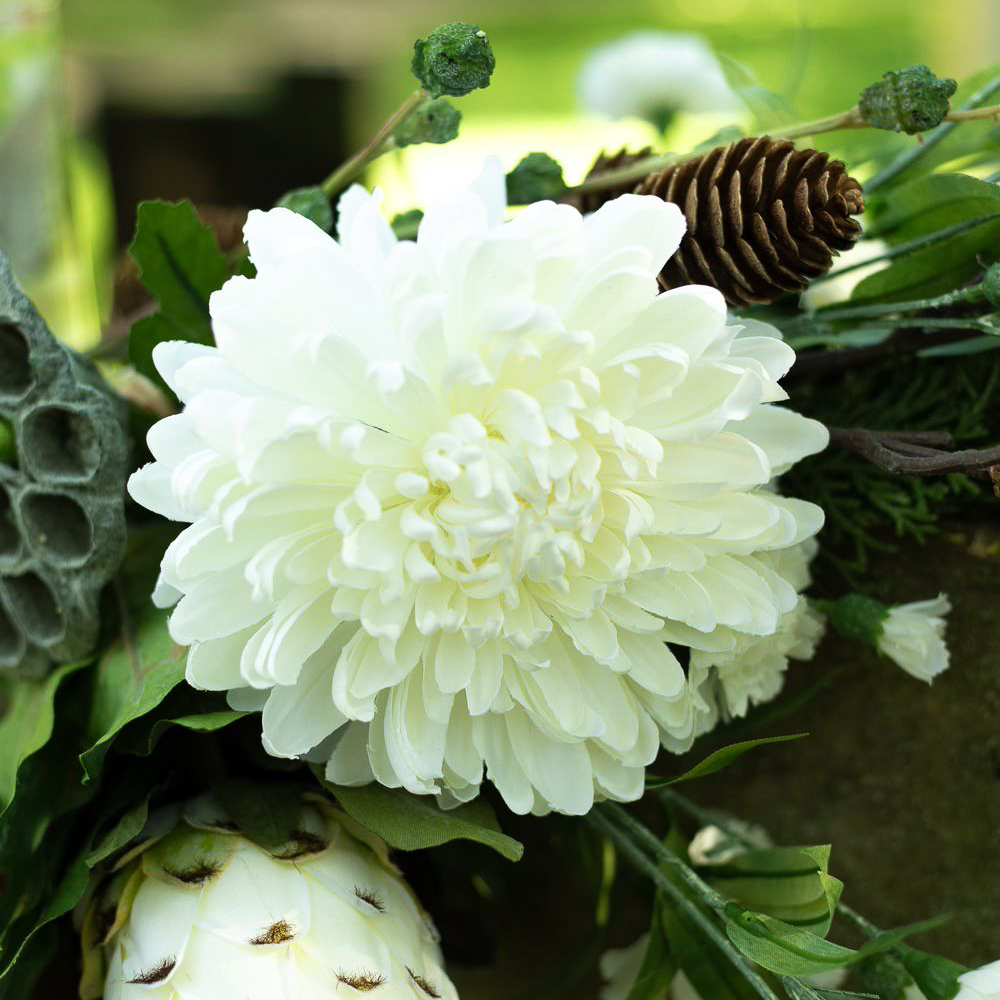 Die Farben der Trauer! Wenn man einen geliebten Menschen verliert, verändert sich das Leben bedeutsam. Was bleibt ist die Erinnerung. An Allerheiligen gedenken wir den Verstorbenen und erinnern uns an wundervolle Lebzeiten. Die Grabstätten werden gepflegt und mit neuem Blumenschmuck versehen. Da ist es doch richtig praktisch, wenn die Blumen nicht verblühen und die Grabstätte dauerhaft verschönern. Kein welken, kein gießen – und eine richtig natürliche Wirkung. Die Farbe Weiß wurde hier als Symbol der Reinheit eingesetzt und steht für die unverfälschte Liebe und Trauer. Die majestätische Protea, die weiße Chrysantheme und der Lotusfruchtstand ergeben einen außergewöhnlichen Strauß, gut genug, um einen außergewöhnlichen Menschen zu ehren. Shop the Look!