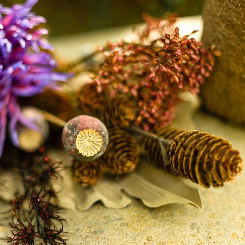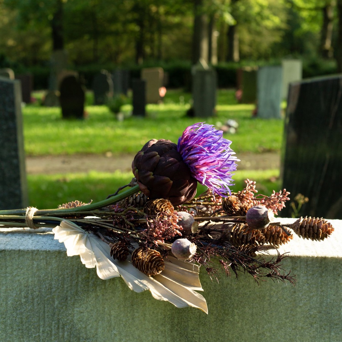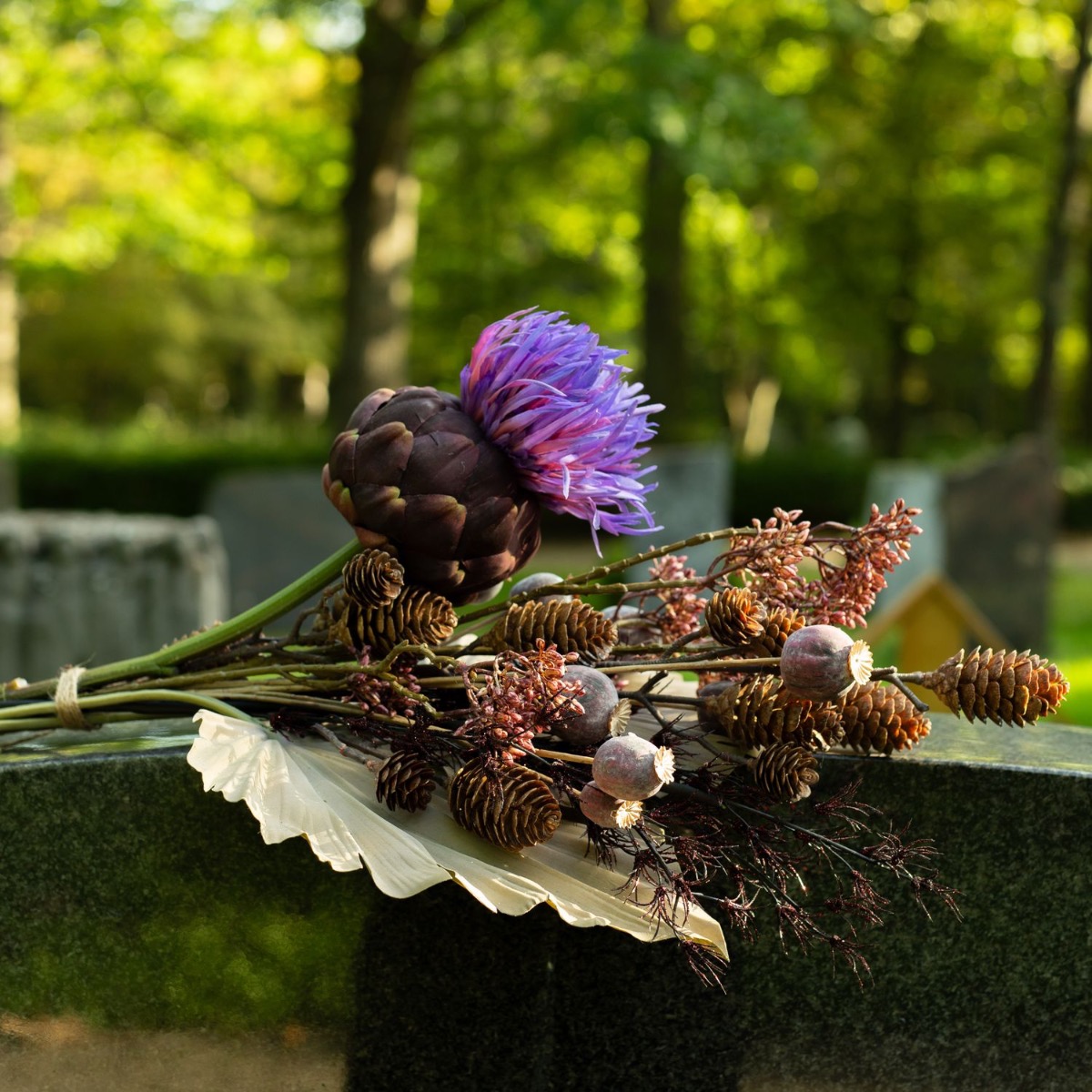 Die Farben der Trauer! Wenn man einen geliebten Menschen verliert, verändert sich das Leben bedeutsam. Was bleibt ist die Erinnerung. An Allerheiligen gedenken wir den Verstorbenen und erinnern uns an wundervolle Lebzeiten. Die Grabstätten werden gepflegt und mit neuem Blumenschmuck versehen. Da ist es doch richtig praktisch, wenn die Blumen nicht verblühen und die Grabstätte dauerhaft verschönern. Kein welken, kein gießen – und eine richtig natürliche Wirkung. Das geheimnisvolle Violett der Artischockenblüte leuchtet im Dunkel der Friedhofsatmosphäre und wirkt vor dem taupe-farbenen Palmwedel modern und zeitlos zugleich. Shop the Look!