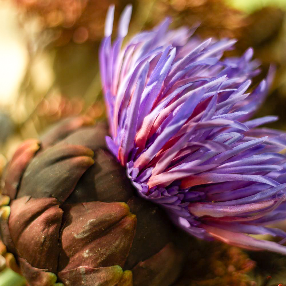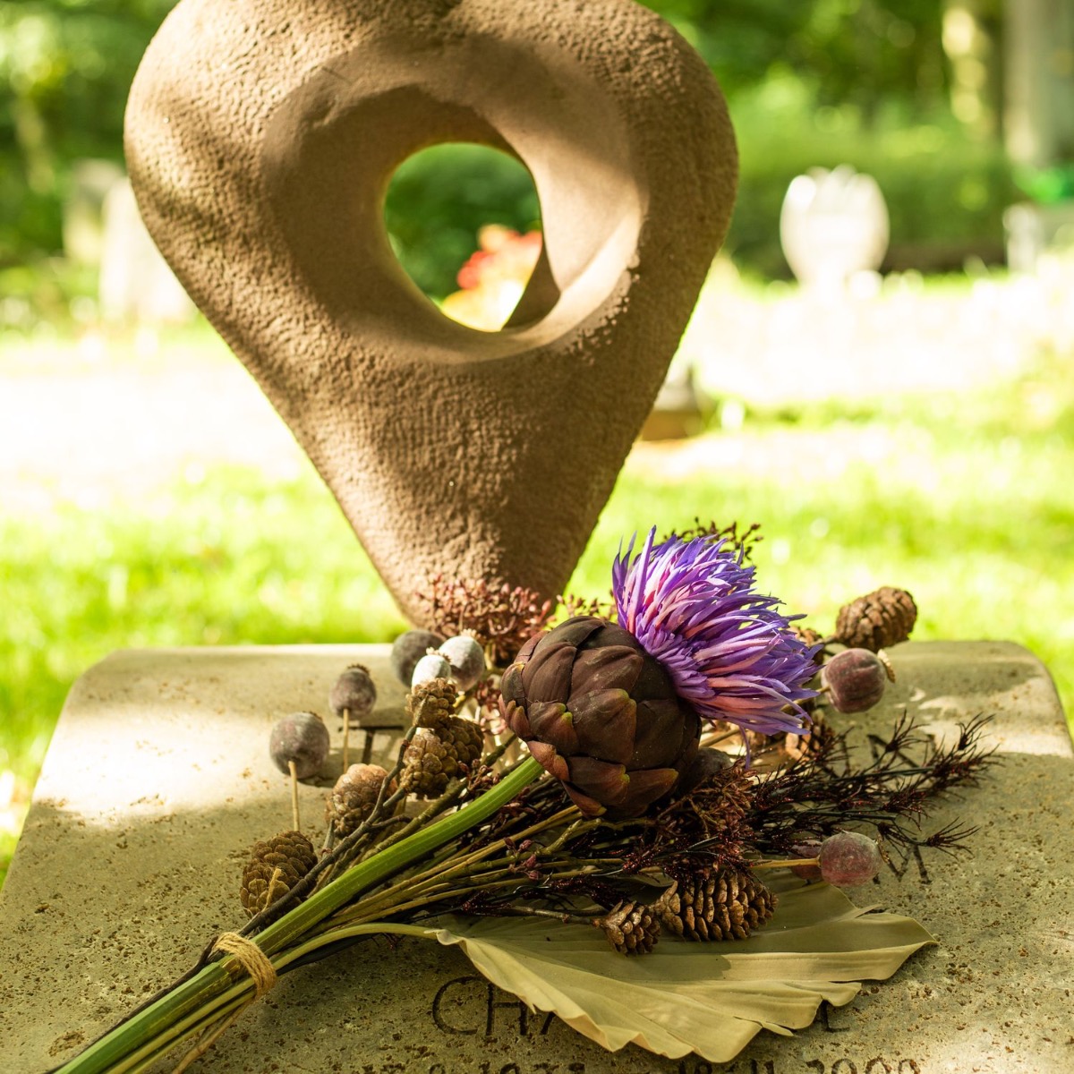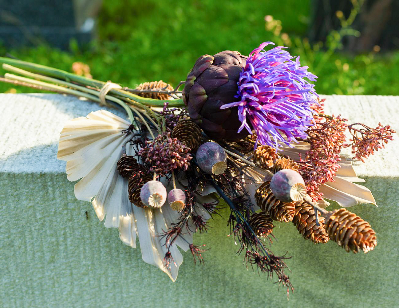 Die Farben der Trauer! Wenn man einen geliebten Menschen verliert, verändert sich das Leben bedeutsam. Was bleibt ist die Erinnerung. An Allerheiligen gedenken wir den Verstorbenen und erinnern uns an wundervolle Lebzeiten. Die Grabstätten werden gepflegt und mit neuem Blumenschmuck versehen. Da ist es doch richtig praktisch, wenn die Blumen nicht verblühen und die Grabstätte dauerhaft verschönern. Kein welken, kein gießen – und eine richtig natürliche Wirkung. Das geheimnisvolle Violett der Artischockenblüte leuchtet im Dunkel der Friedhofsatmosphäre und wirkt vor dem taupe-farbenen Palmwedel modern und zeitlos zugleich. Shop the Look!
