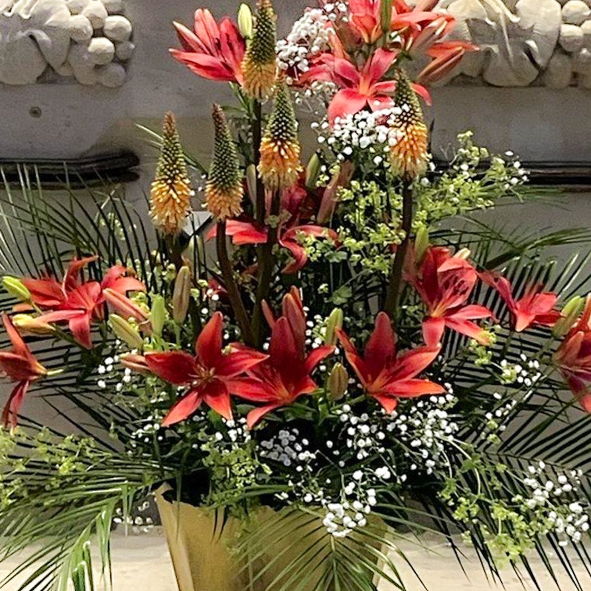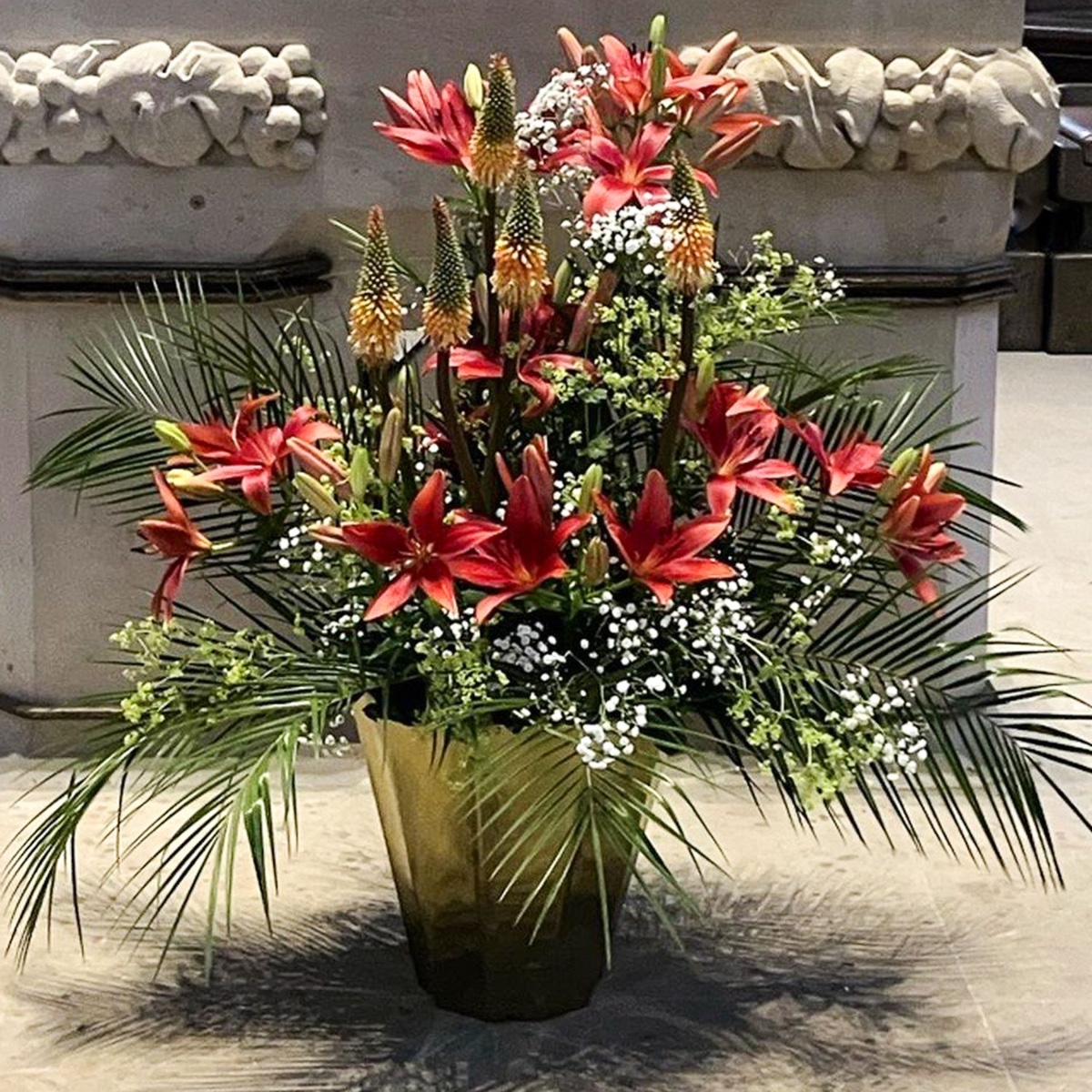 Blüten für die Seele - Church Flowers! Ein üppiges Gesteck vor dem Altar, kunstvoll arrangiert mit Lilien als Symbol der Wiedergeburt und Fackellilien, die für Mut und Stärke stehen. Ausladend ergänzt durch Palmwedel und zartes weißes Schleierkraut entsteht ein harmonisches Gesamtbild. Die Altarblumen erinnern an die Schönheit und Fülle von Gottes Schöpfung – ein florales Zeichen der Hoffnung, des Glaubens und der Verbundenheit. Shop the Look!