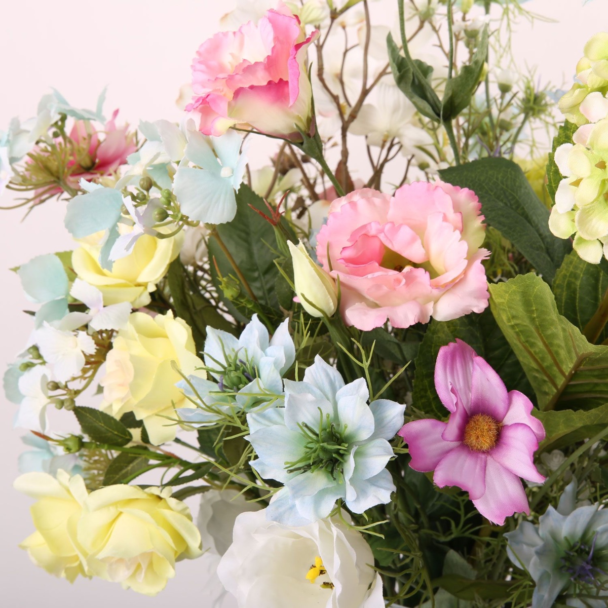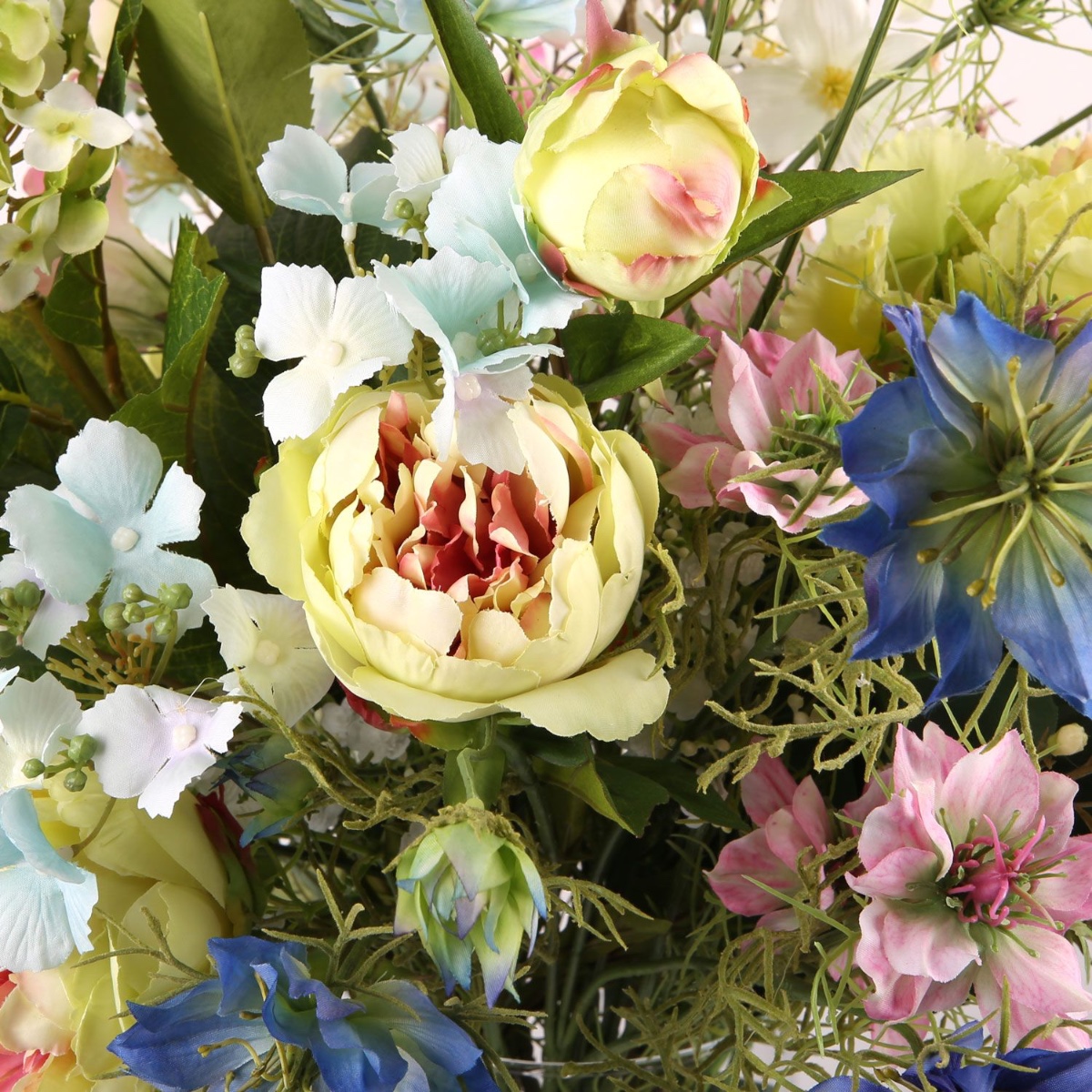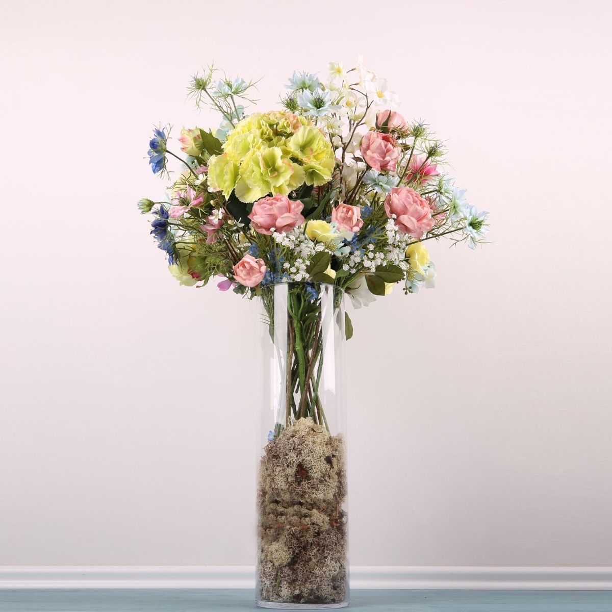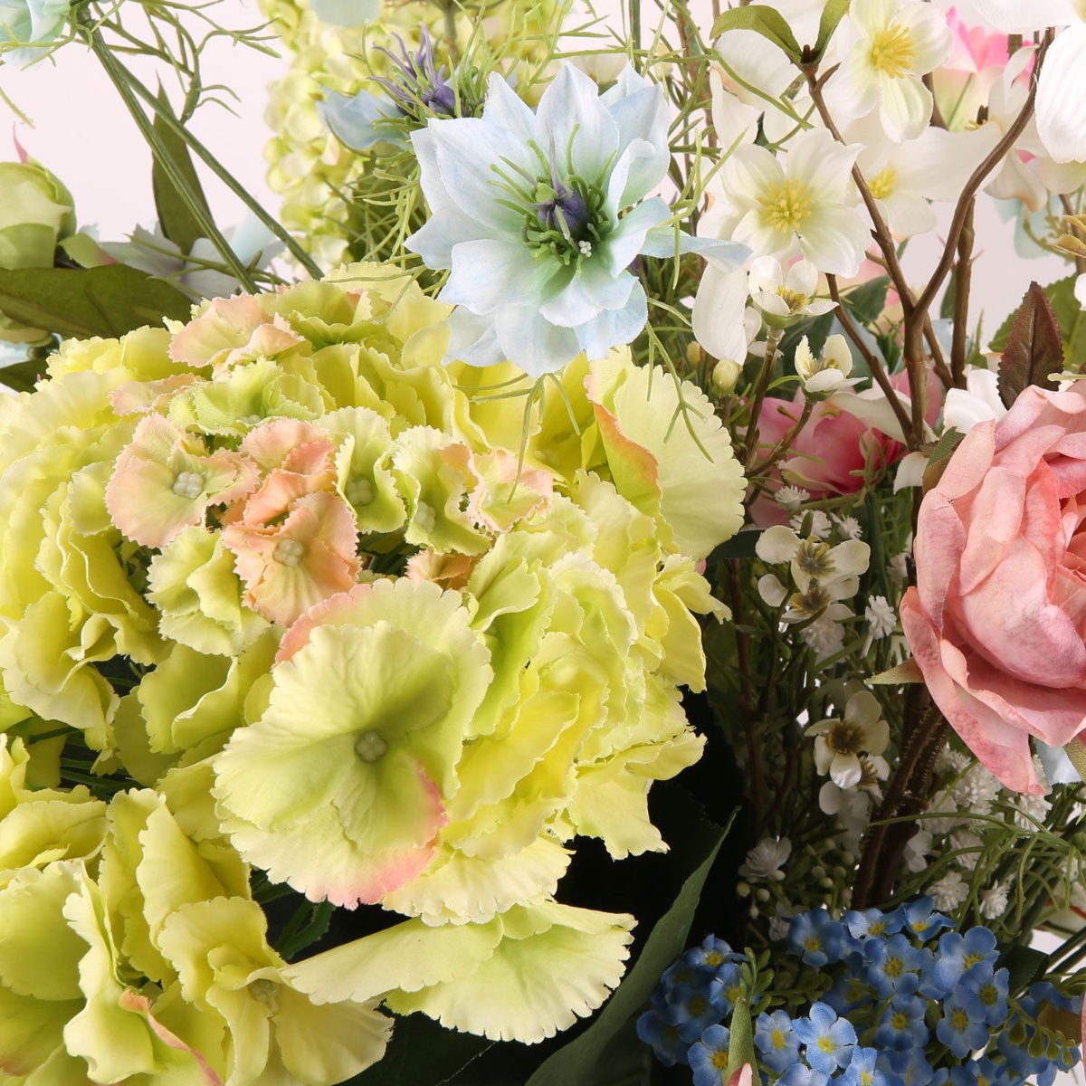 Rosa, Gelb und Blau! Anne schrieb uns: Ich habe eine klare Glasvase auf dem Boden, die ich gerne bestücken möchte. Sie ist allerdings recht groß: Innendurchmesser oben sind etwa 16cm und die Höhe beträgt etwa 50cm. Gerne hätte ich darin ein Mischung an Blumen aus meinem standesamtlichen und kirchlichen Brautstraußes. Nichts leichter als das! Unsere Silke hatte sofort eine tolle Idee wie sie diese große Vase mit den gewünschten Blumen ausschmücken kann, als Erhöhung für die Stiele diente Isländisches Moos. Und, es war nicht anders zu erwarten, Anne war gleich begeistert. Wir hoffen, dass dieser Strauß Dein Zuhause für lange Zeit erhellt.Die zarten Farben und Blütenformen in diesem Strauß bieten dem Betrachter einen märchenhaften Anblick, der zum Träumen einlädt. Schwarzkümmel, Rosen, Lisianthus und andere Blümchen wirken, als hätte man sie direkt von Dornröschen gepflückt bekommen. Die zartgrüne Hortensie ist die Königin in diesem Bouquet. Shop the Look!