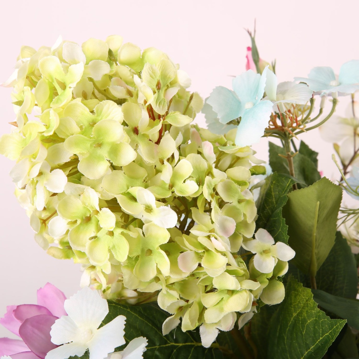 Gestaltungstipp: Die Blumen zu einem natürlichen Strauß zusammenfügen. Die Hortensie sollte sich in der vorderen Mitte befinden. Mit einer Juteschnur oder einem Draht fest zusammenbinden und die Stiele auf gleiche Längen schneiden.