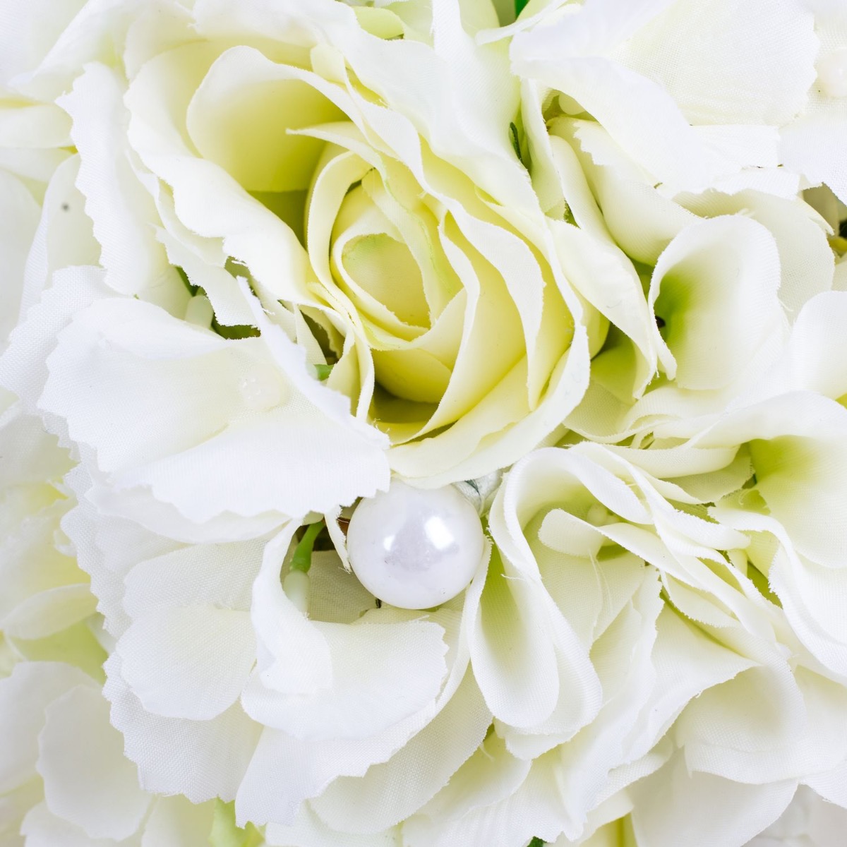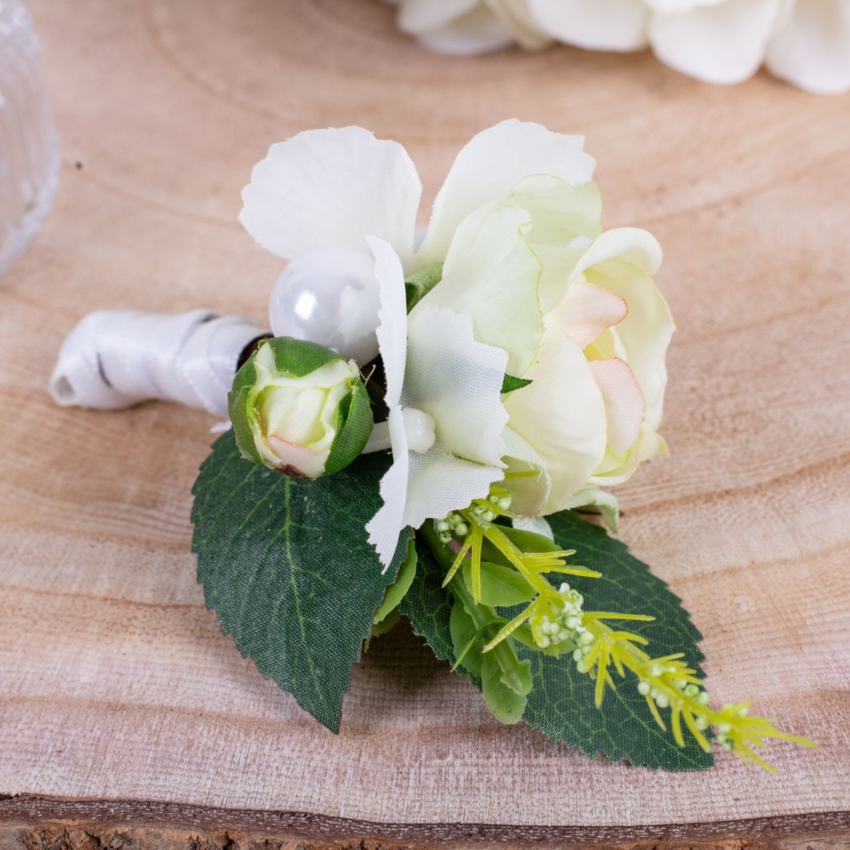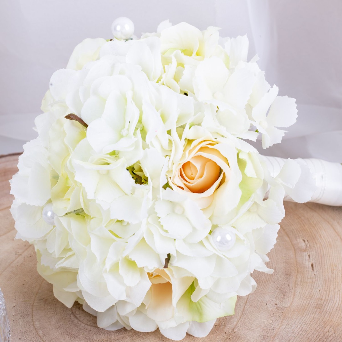 Glamorous Passion! Die zarten Rosen und die cremefarbenen Hortensien verschmelzen harmonisch miteinander und verleihen dem Strauß eine romantische Note. Die Perlen, die in den Strauß eingearbeitet sind, fügen eine subtile, aber luxuriöse Note hinzu. Sie glänzen sanft im Licht und verleihen dem Strauß einen Hauch von Glamour und Raffinesse. Passend zum Brautstrauß trägt der Bräutigam einen Anstecker, der aus einer cremefarbenen Rose, feinen Hortensienblüten, sowie einer Perle besteht. Diese koordinierten Details verbinden das Brautpaar auf subtile Weise und vervollständigen das elegante Erscheinungsbild der Hochzeitsgesellschaft. Insgesamt strahlt dieser Brautstrauß eine Aura der Romantik und der Eleganz aus, die das Herz berührt und die Augen verzaubert. Ein wahrhaft bezaubernder Begleiter für die Braut auf ihrem Weg zum Altar. Wollen auch Sie einen künstlichen Hochzeitsstrauß? Shop the Look!