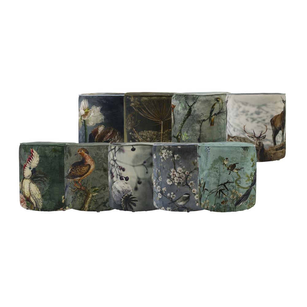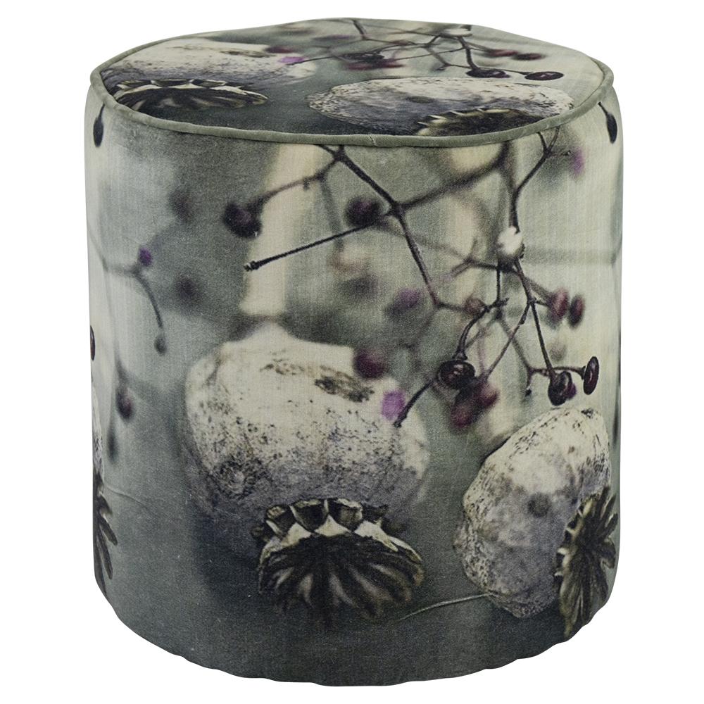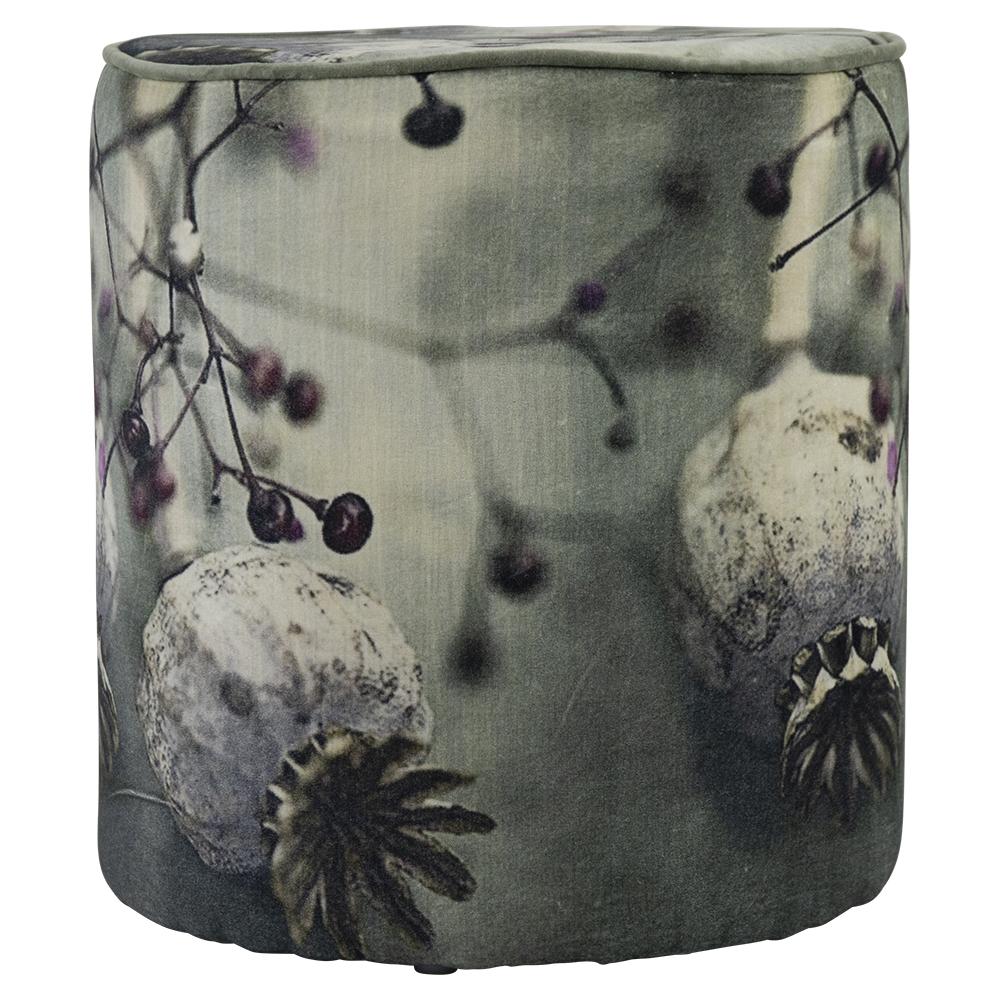 Samt Hocker SARON, Mohnblumen Motiv, grau-lila-weiß, 45cm, Ø40cm