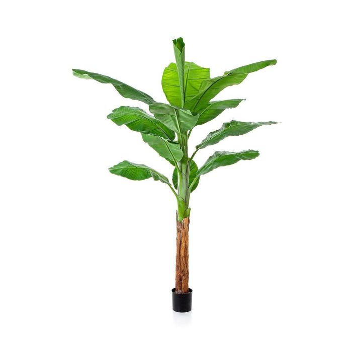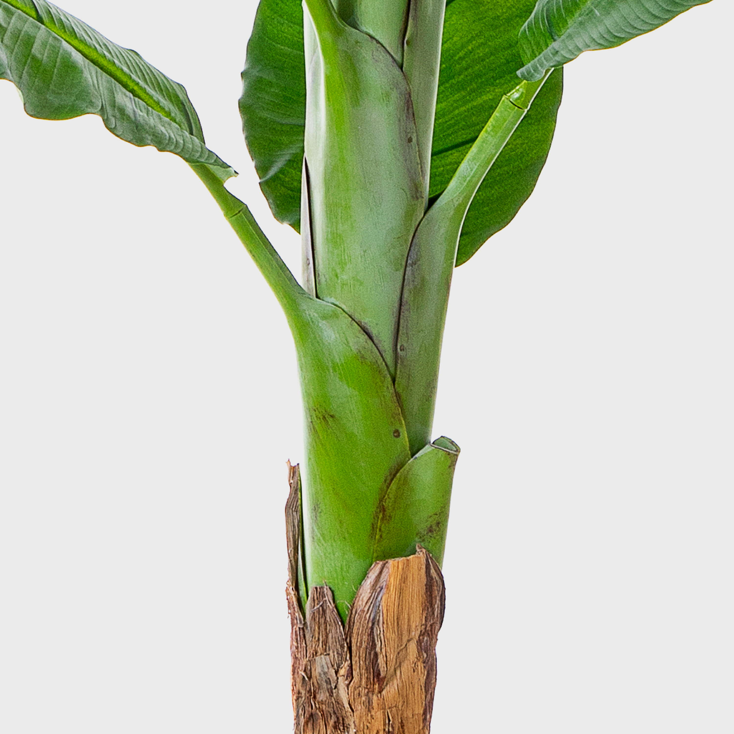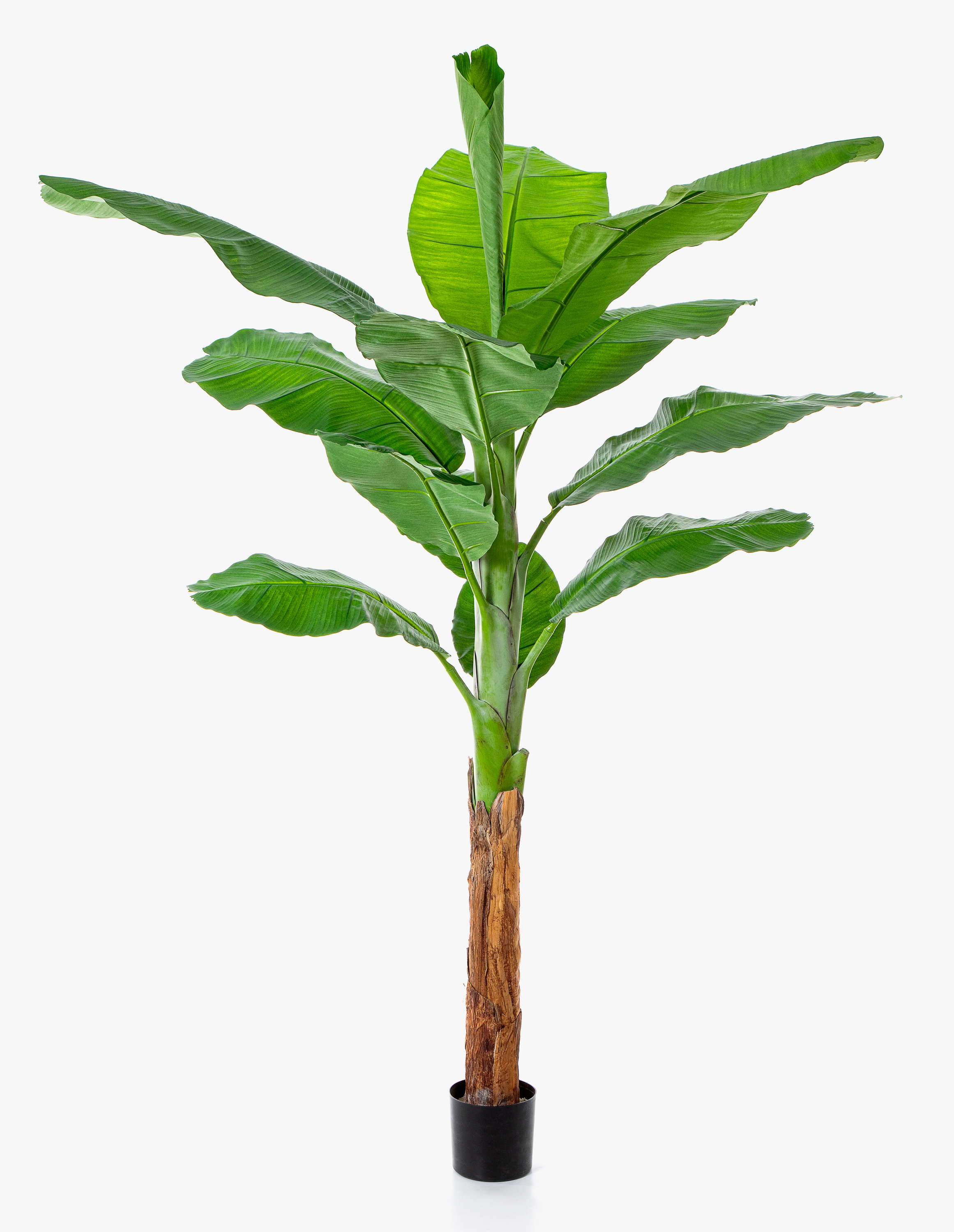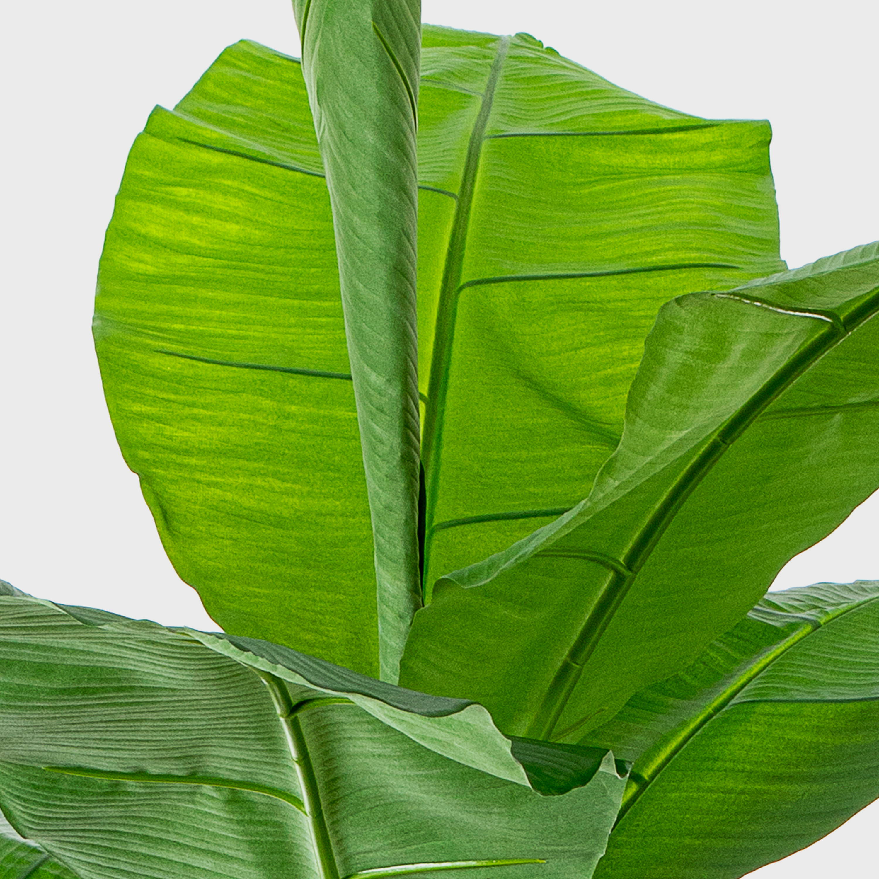 - Die ca. 13 imposanten Blätter aus hochwertigem Material bilden einen Scheinstamm, der unten braun eingefärbt ist. Die Blätter haben eine deutliche Ader, oben in der Mitte der Pflanze befindet sich ein eingerolltes Blatt