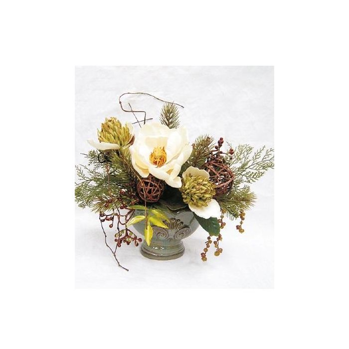 Deko Blumen Gesteck Magnolie, Protea, Beeren TORWI, Übertopf, weiß-grün, 31cm, Ø34cm