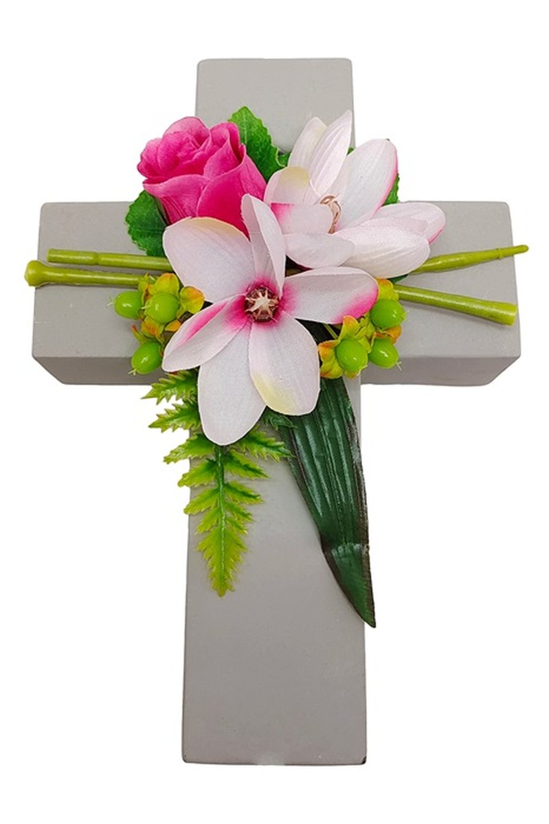 - Das geschmackvolle Blumengesteck auf einem Kreuz ist eine schöne Bereicherung z.B. für den Grabschmuck, bitte beachten Sie das wir für die Verwendung im Außenbereich keine Garantie auf die Langlebigkeit und Beständigkeit geben können, die Kunstblumen können sich durch die UV-Strahlung verfärben, brüchig werden oder durch Wind abreißen!