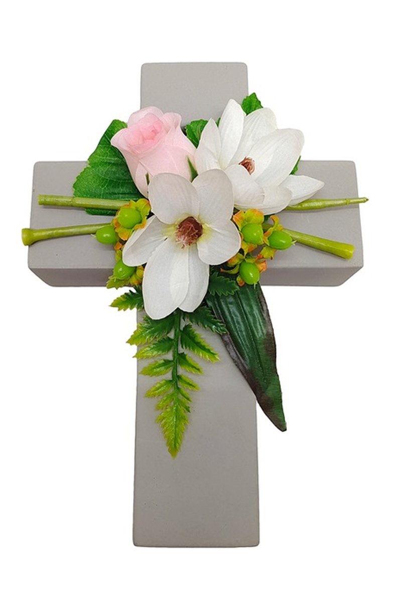 Deko Blumengesteck Magnolie, Rose, Johanniskraut TORVI, Pflanzkreuz, weiß-rosa, 26x18x10cm