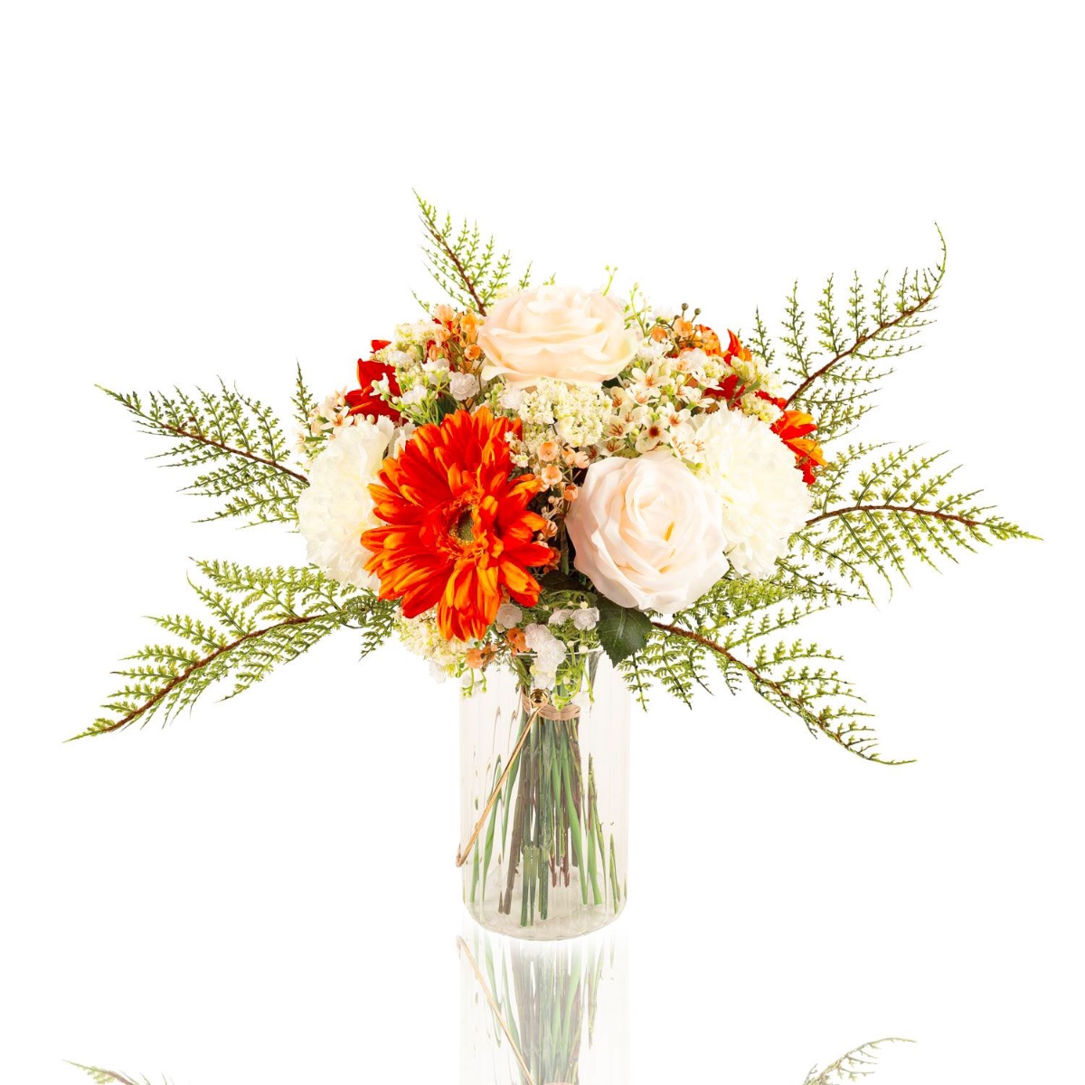 In Deutschland handgebundener künstlicher Strauß MALIA aus einer perfekt aufeinander abgestimmten Blütenkombination. Das Blumenbukett wird von Schafgarbe und Schleierkraut umspielt, ein Abschluss bildet die Blattmanschette aus Asparagus plumosus (Zierspargel / Feder-Spargel). Das Blumenarrangement bietet sich für viele Anlässe wie etwa für den Muttertag, Frauentag, Geburtstag oder einfach als kleine Aufmerksamkeit an.