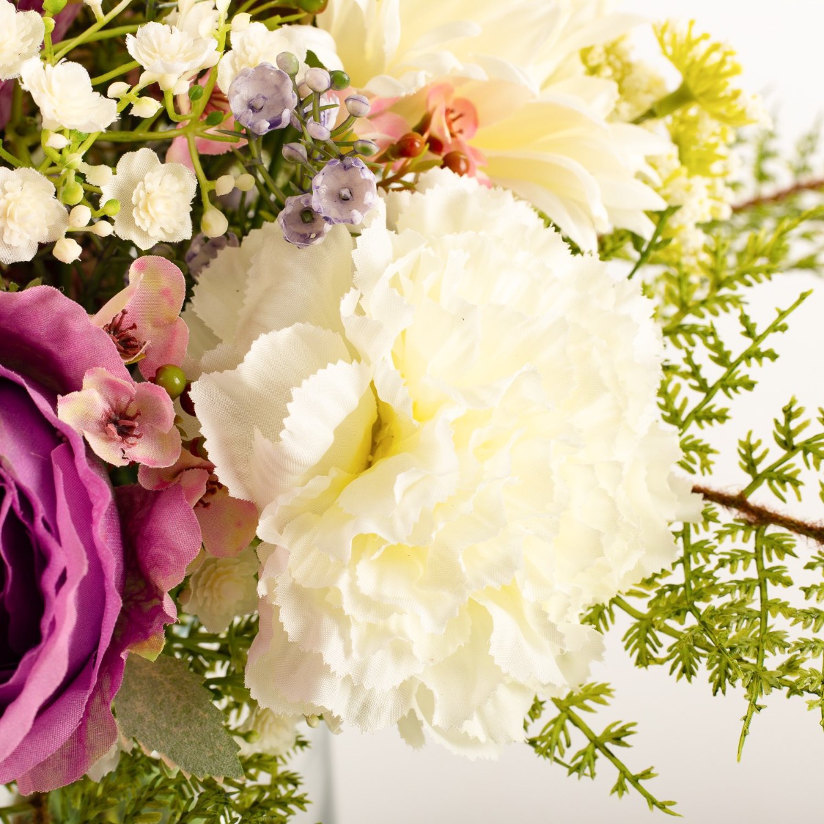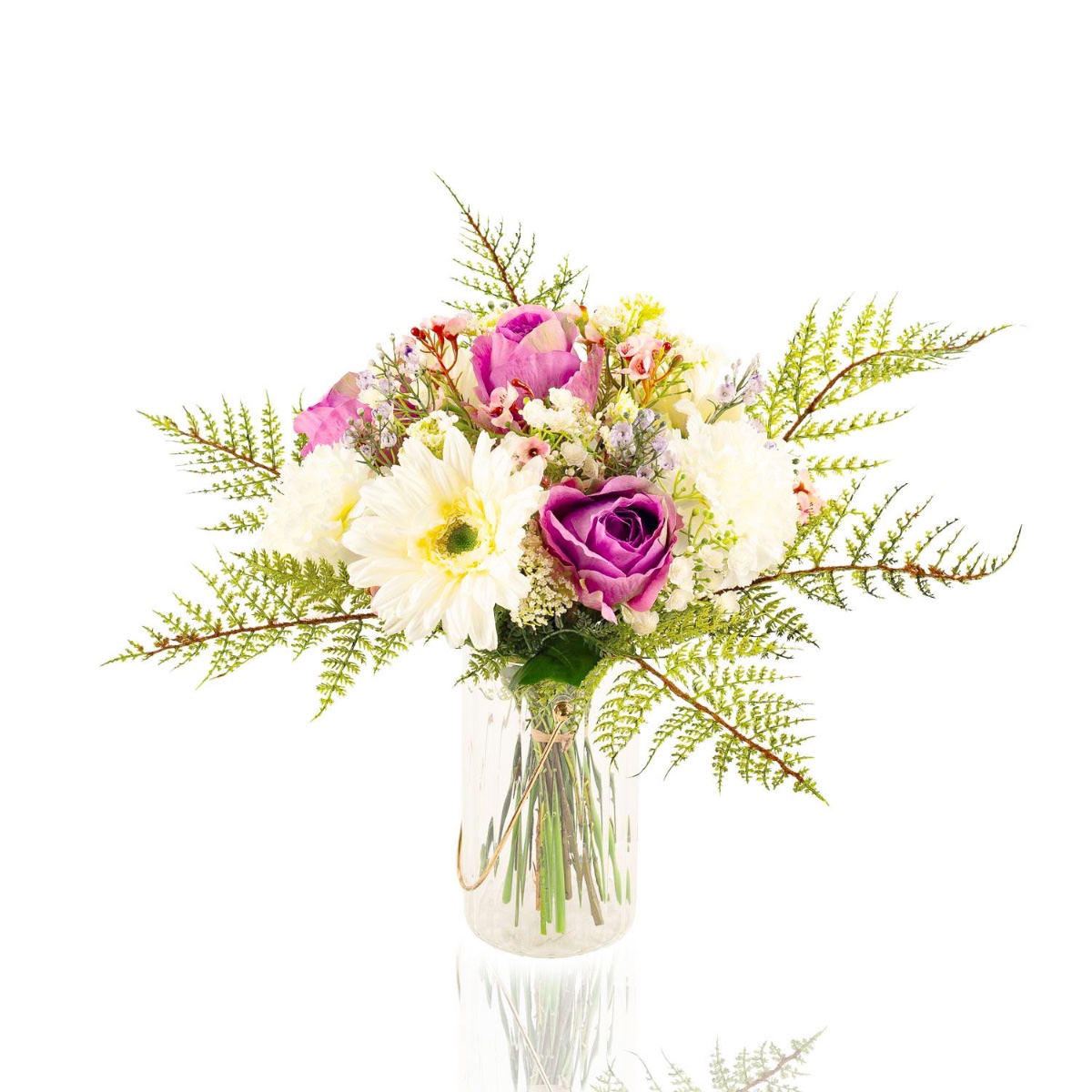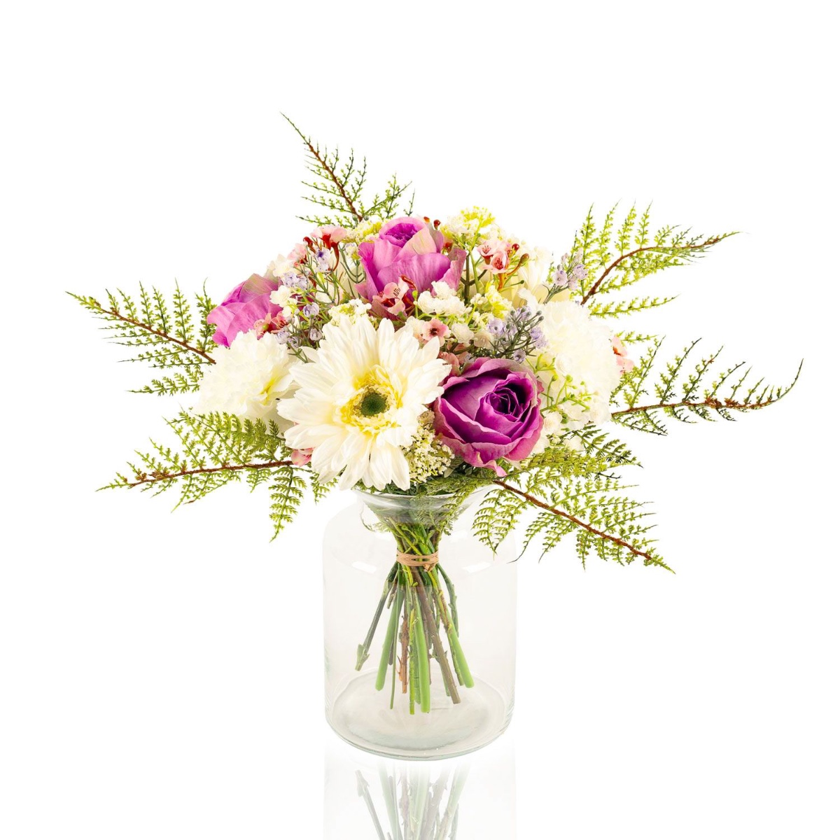In Deutschland handgebundener künstlicher Strauß MALIA aus einer perfekt aufeinander abgestimmten Blütenkombination. Das Blumenbukett wird von Schafgarbe und Schleierkraut umspielt, ein Abschluss bildet die Blattmanschette aus Asparagus plumosus (Zierspargel / Feder-Spargel). Das Blumenarrangement bietet sich für viele Anlässe wie etwa für den Muttertag, Frauentag, Geburtstag oder einfach als kleine Aufmerksamkeit an.