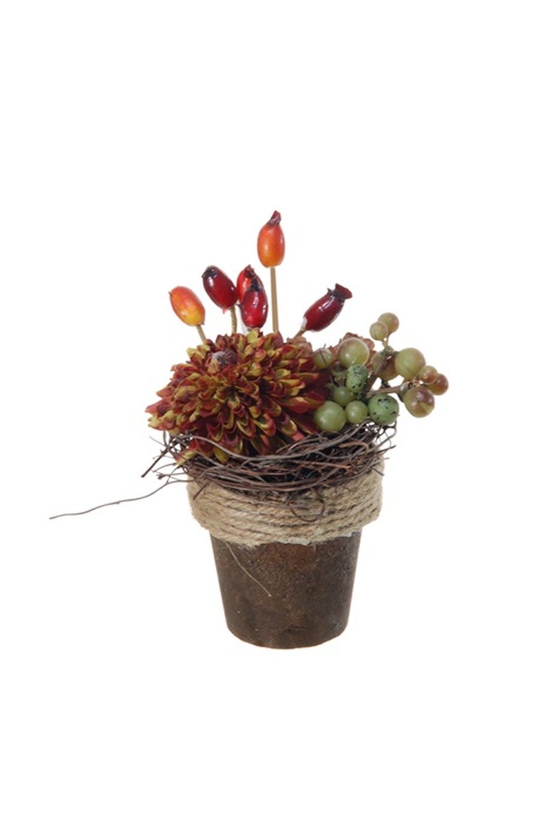 Deko Gesteck Dahlie, Hagebutten, Trauben MUSAN, Dekotopf, rot-orange-grün, 10cm, Ø7cm