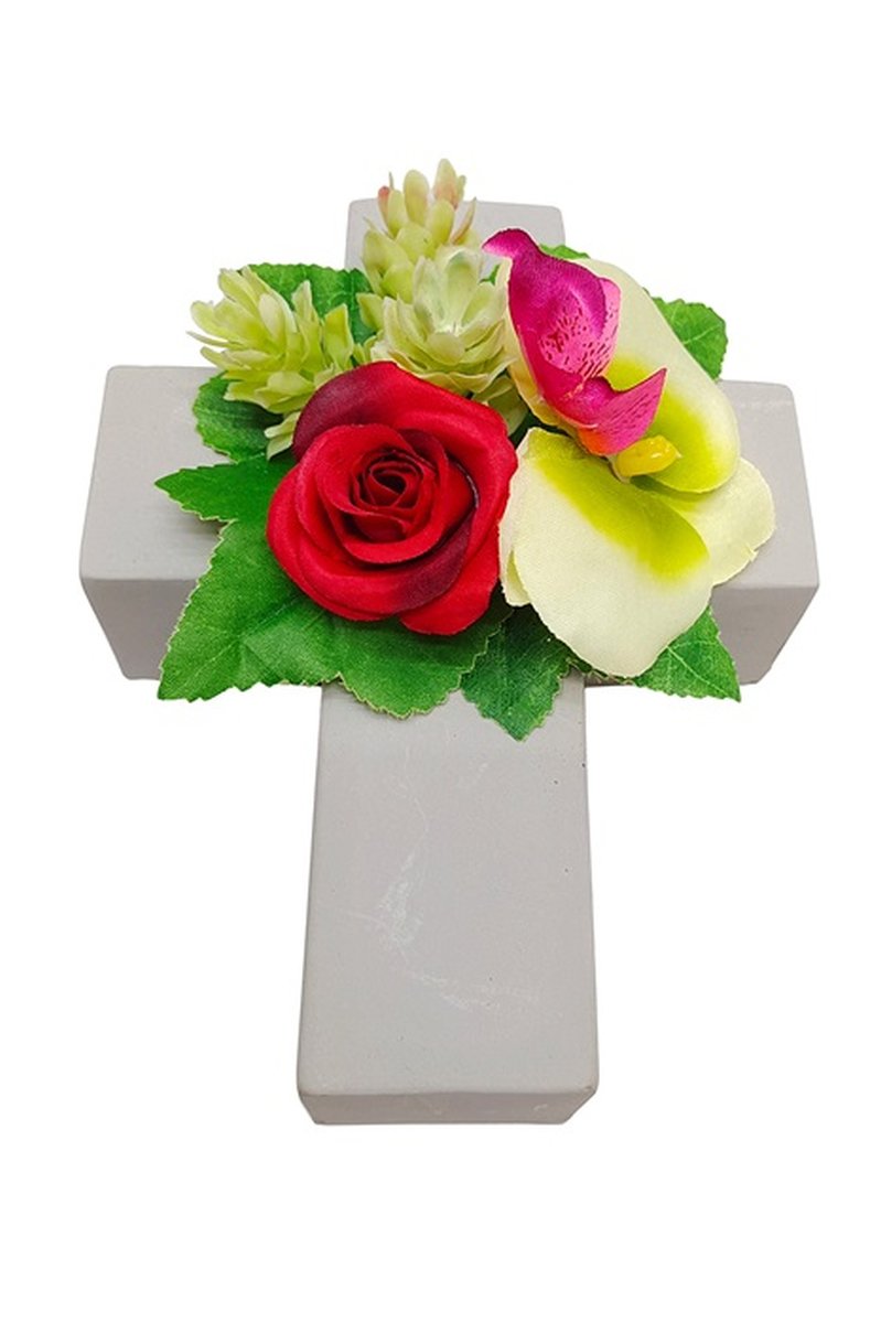 Das Plastik Blumengesteck ARIADNA ist auf einem Kreuz aus Beton befestigt. Es eignet sich perfekt z.B. für die Gestaltung einer Gedenkecke, oder Sie verwenden es als Grabschmuck. Bitte beachten Sie das wir für die Verwendung im Außenbereich keine Garantie auf die Langlebigkeit und Beständigkeit geben können, die Kunstblumen können sich durch die UV-Strahlung verfärben, brüchig werden oder durch Wind abreißen!