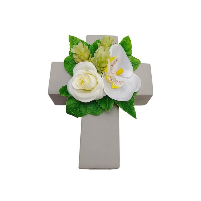 Deko Gesteck Rose, Orchidee, Hopfen ARIADNA, Pflanzkreuz, weiß, 20x15x9cm