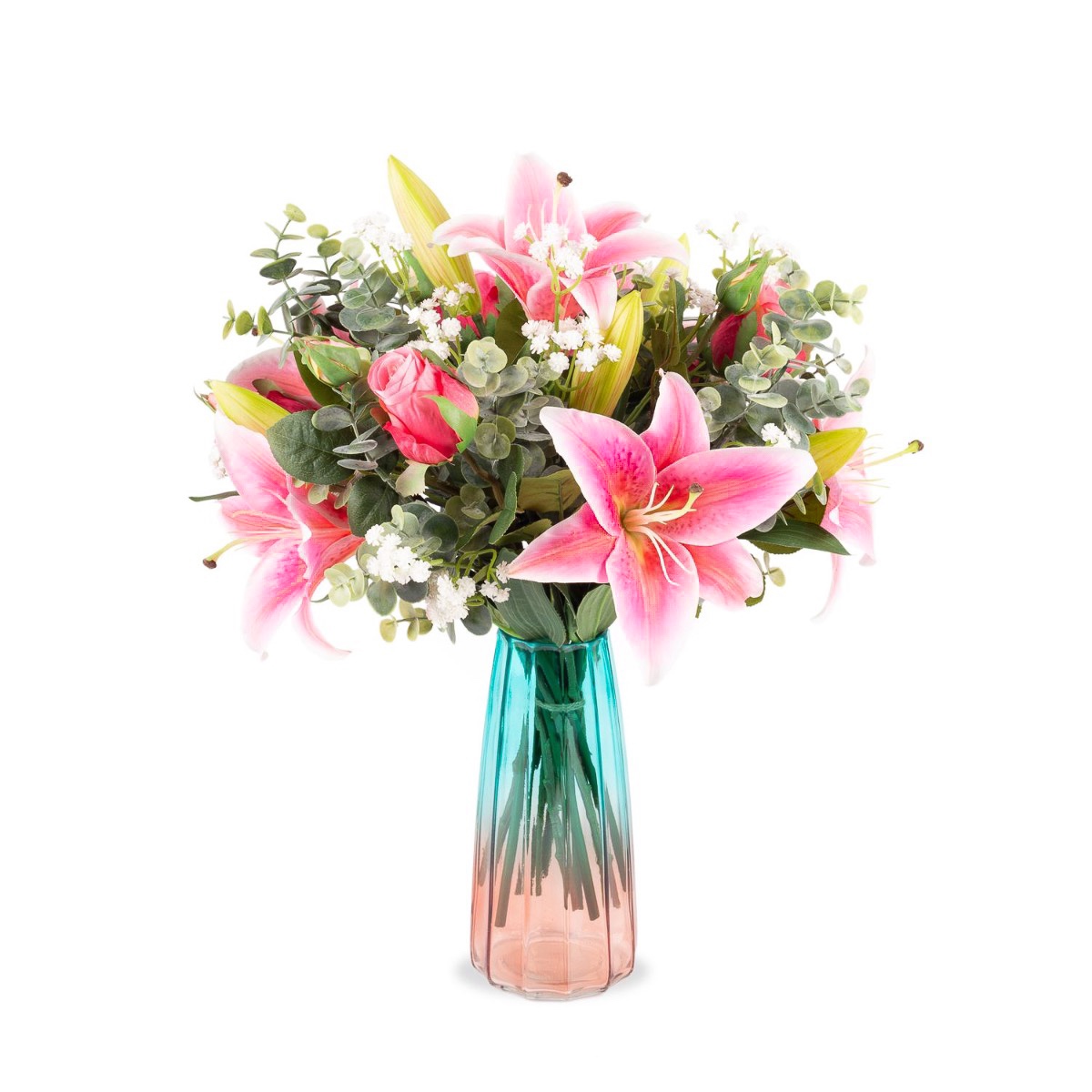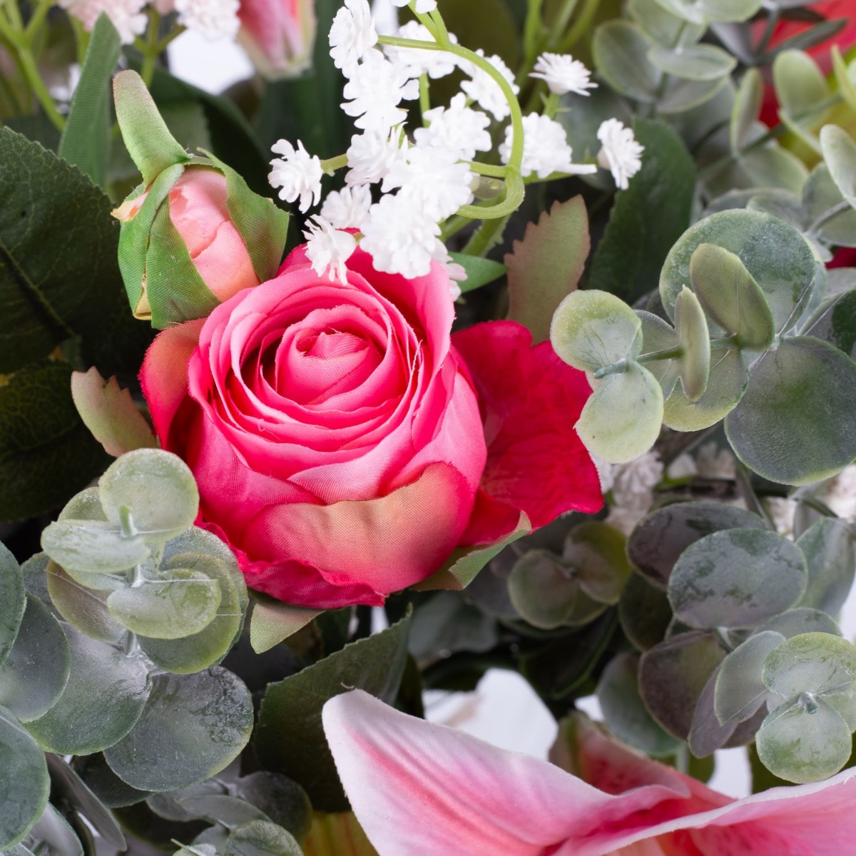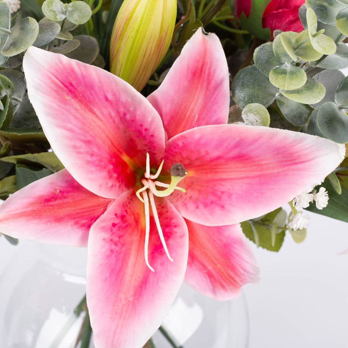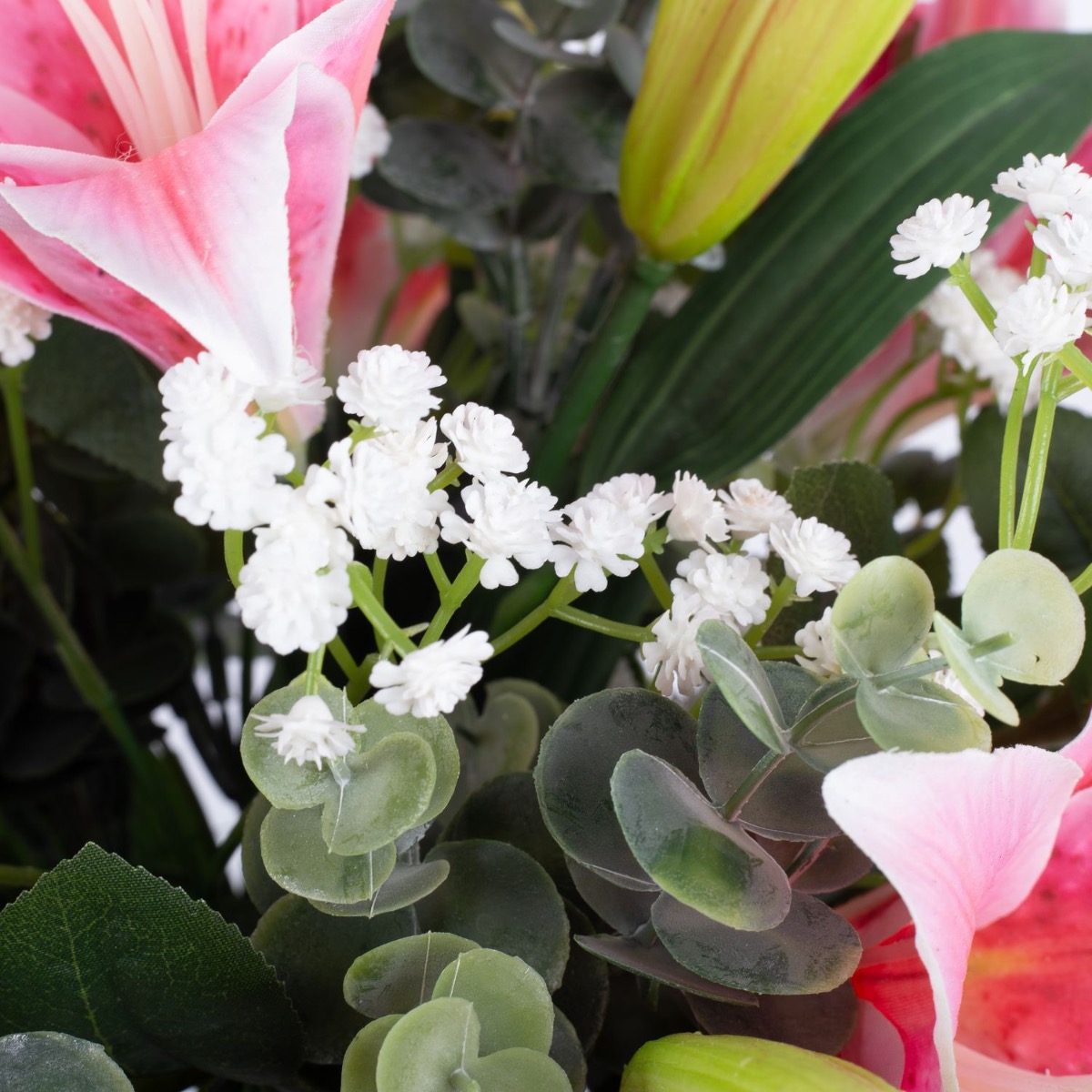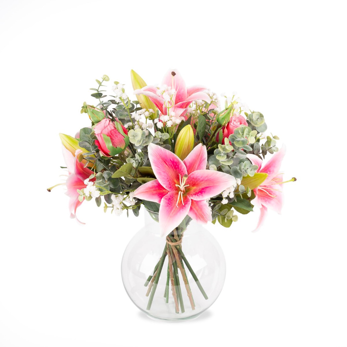 Der elegante künstliche Blumenstrauß MARIPOSA aus pinken Lilien und Rosen steht für Weiblichkeit und Bewunderung. Das Blumenensemble findet als Geschenk für die beste Freundin, Mutter, Oma oder Schwester Verwendung und wird durch modernen Eukalyptus und klassische Schleierkraut Zweige abgerundet.