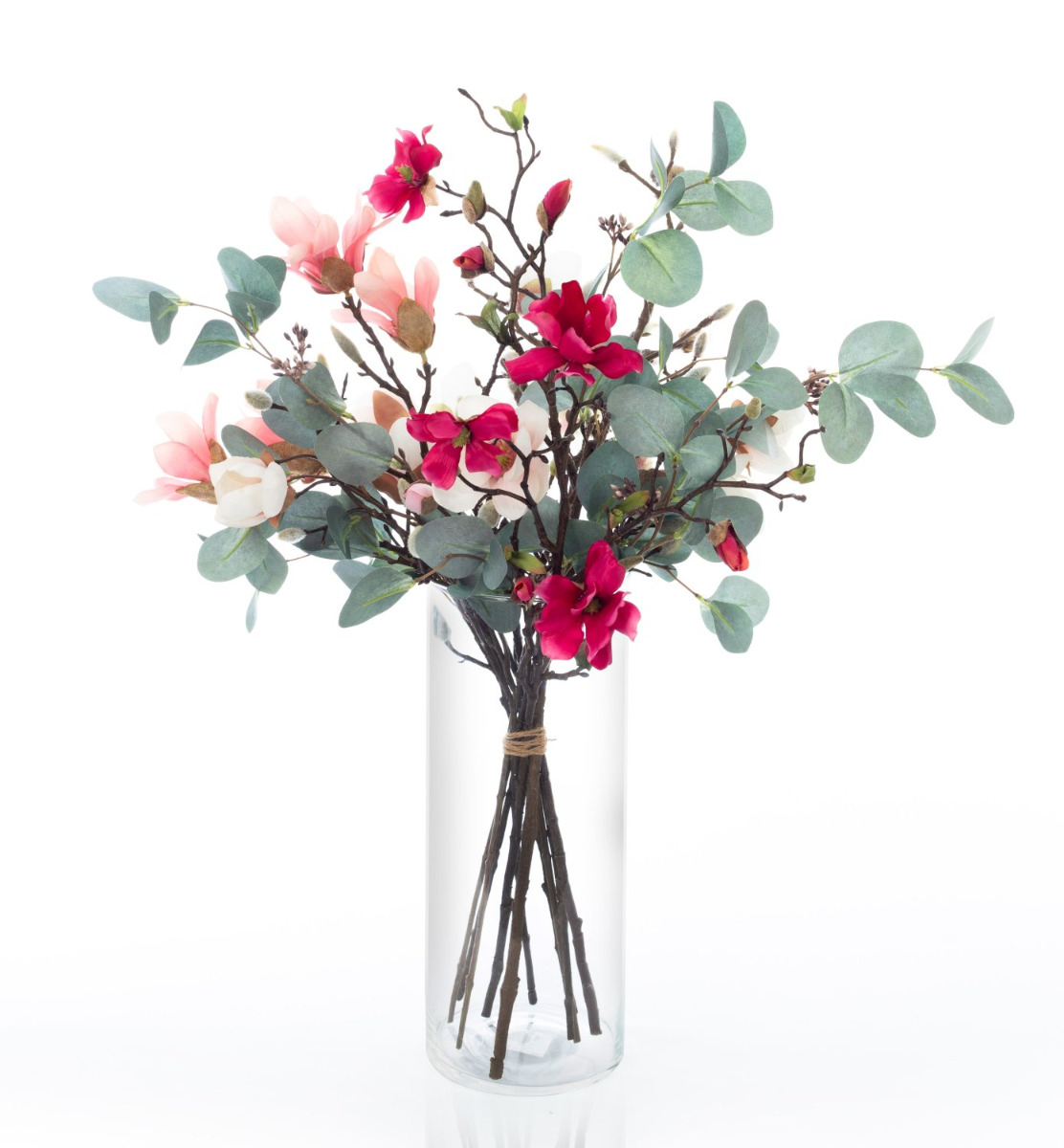 Einen hübschen Frühlingsgruß erhältst du mit unserem Magnolien Blumenstrauß MERISA. Der Strauß besteht aus einem großen Knospenzweig und unterschiedlich farbigen Magnolien und Sternmagnolien Zweigen. Aufgelockert wird die Blütenfülle von großen Eukalyptusblättern.