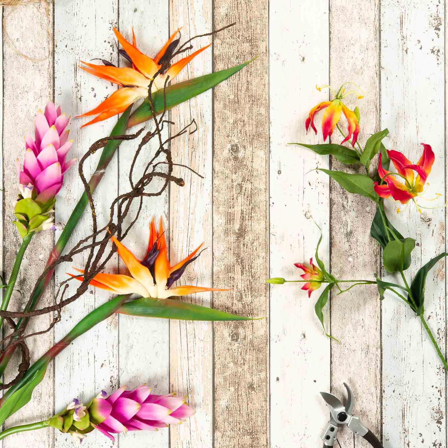 Die künstliche rundgebundene Pracht SALOA beträgt im Durchmesser ca. 40 cm. Das in Deutschland handgebundene, paradiesische Arrangement setzt sich zusammen aus Paradiesvogelblumen, Ruhmeskronen und Kurkumablüten umrahmt wird das ganze von einem braunen Korkenzieherzweig.