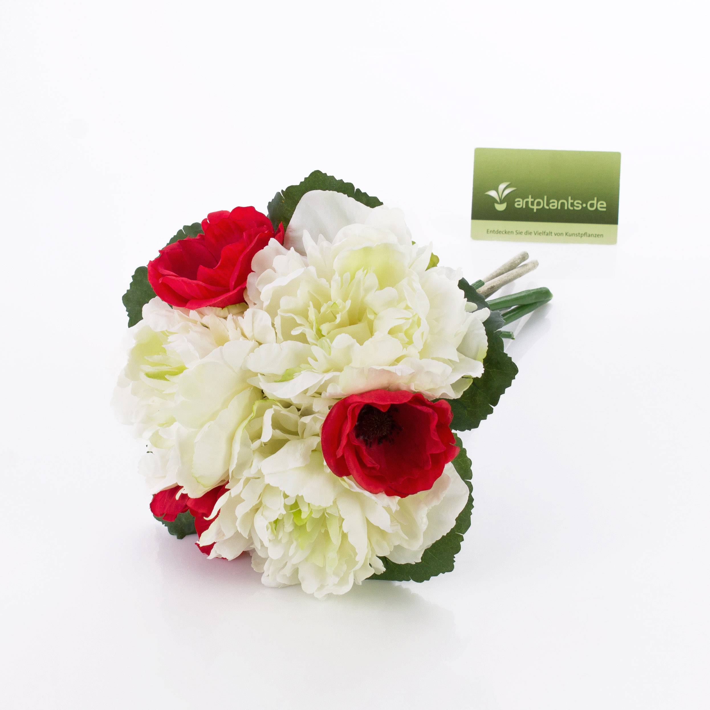 Künstlicher gemischter Strauß MADDIE von artplants mit einer Höhe von ca. 30 cm in Farbe weiß-rot. Der Kunst Blumenstrauß schmückt in einer Vase Ihre Esszimmer Fensterbank oder Wohnzimmer Tisch.