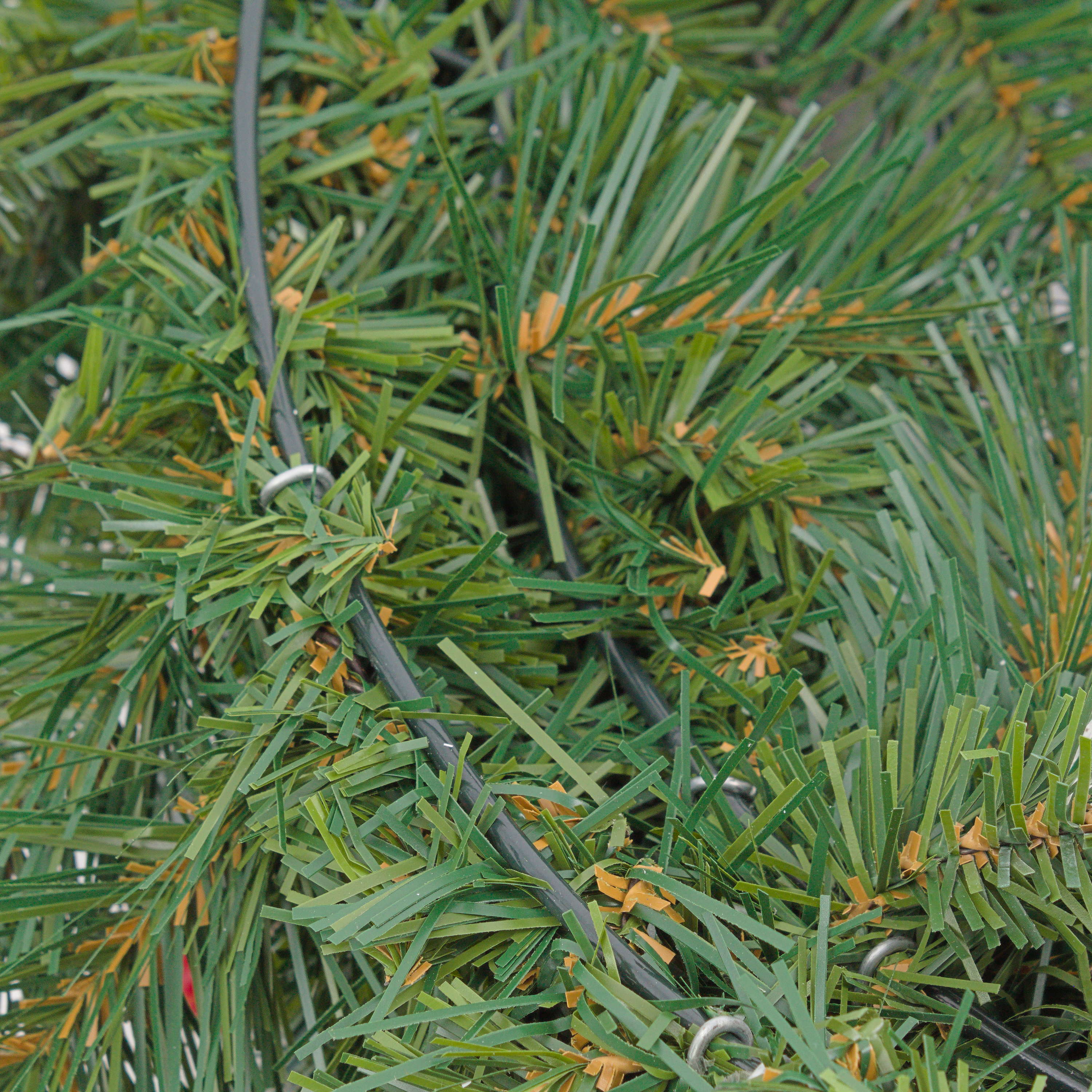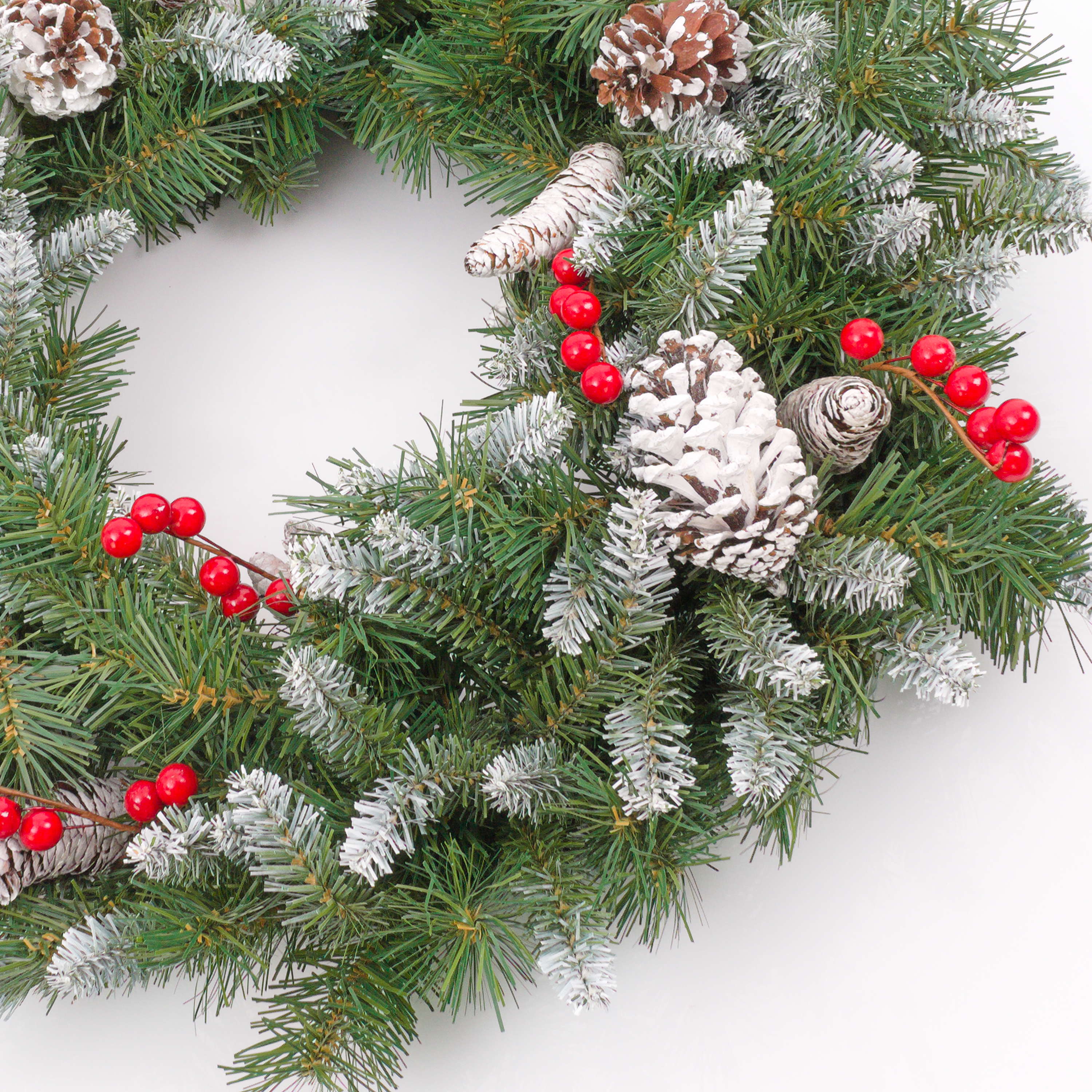 - Mit dichten Tannennadeln in Farbe dunkelgrün, teils beschneit aus hochwertigen Textilmaterial sowie einige Beerenzweige in Farbe rot und beschneite Tannenzapfen