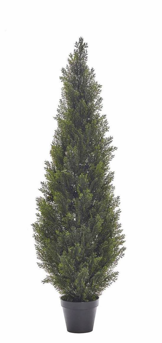 Künstlicher Zeder im schwarzen Kunststoff Topf. Die Kunststoff Konifere hat 125 Nadelzweige und ist 150 cm hoch.