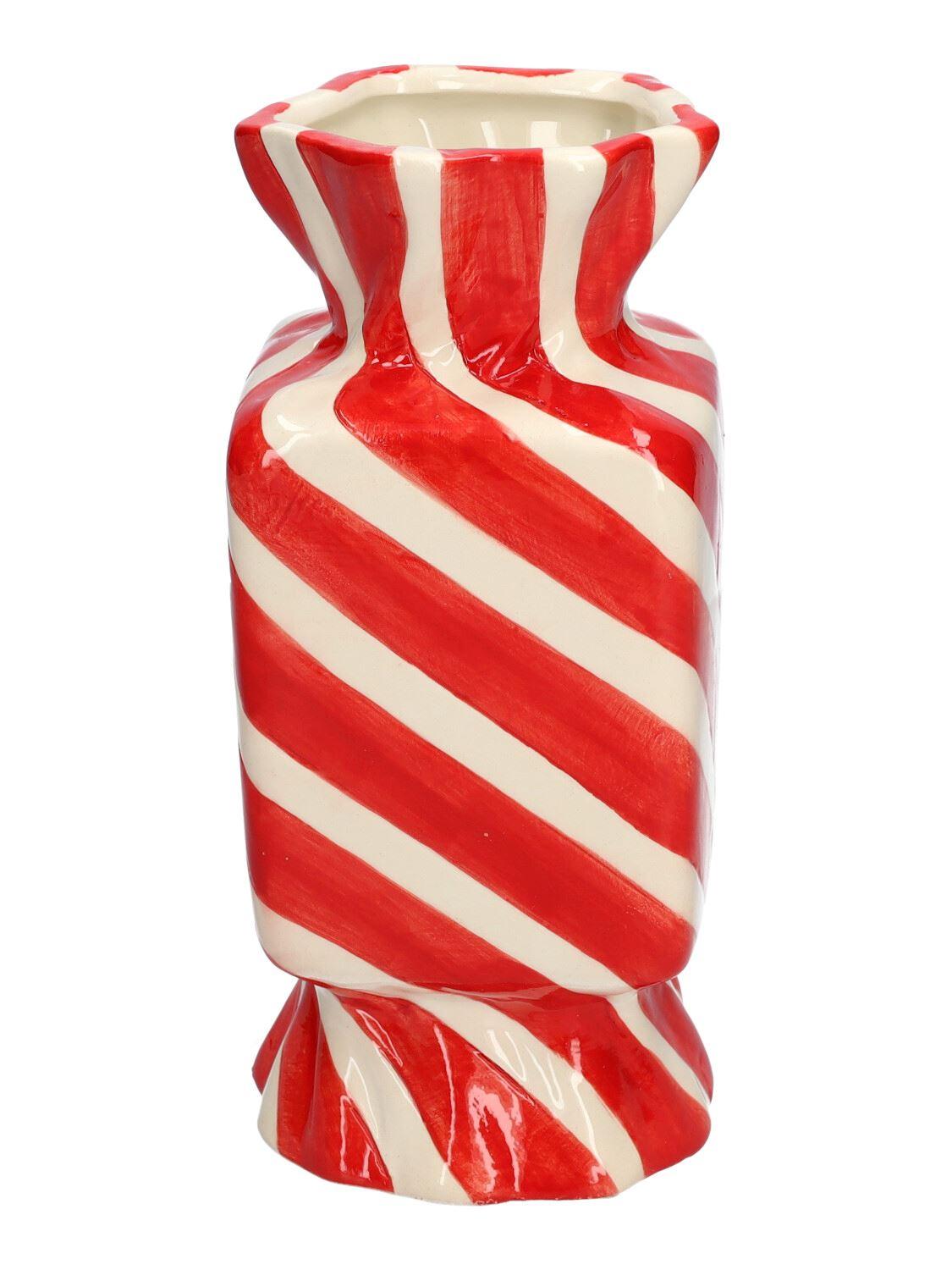 Eckige Einzelblumenvase Bonbon AMIEL aus Keramik, mit schrägen Linien, rot-weiß, 9x9x20cm