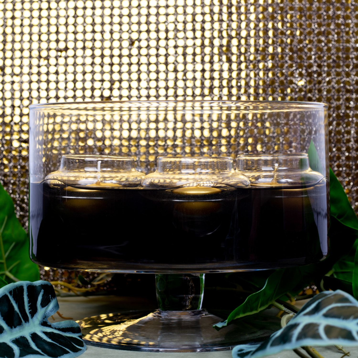 Elegante Schwimmkerzen! Die runde Glasschale mit edlem Fuß dekoriert stilvoll Ihr Badezimmer, Kommode oder Esstisch. Gefüllt mit gefärbtem schwarzem Wasser wird ein perfekter Kontrast zu den goldenen Kerzen hergestellt, die in schwimmenden kleinen Teelichthaltern sitzen. Die künstliche Alocasia Sanderiana Girlande, die um die Schale geschlungen ist, schmiegt sich mit den panaschierten Blättern geschmackvoll ein. Wollen auch Sie Ihrem Wohnraum neuen Glanz verleihen? Shop the Look!