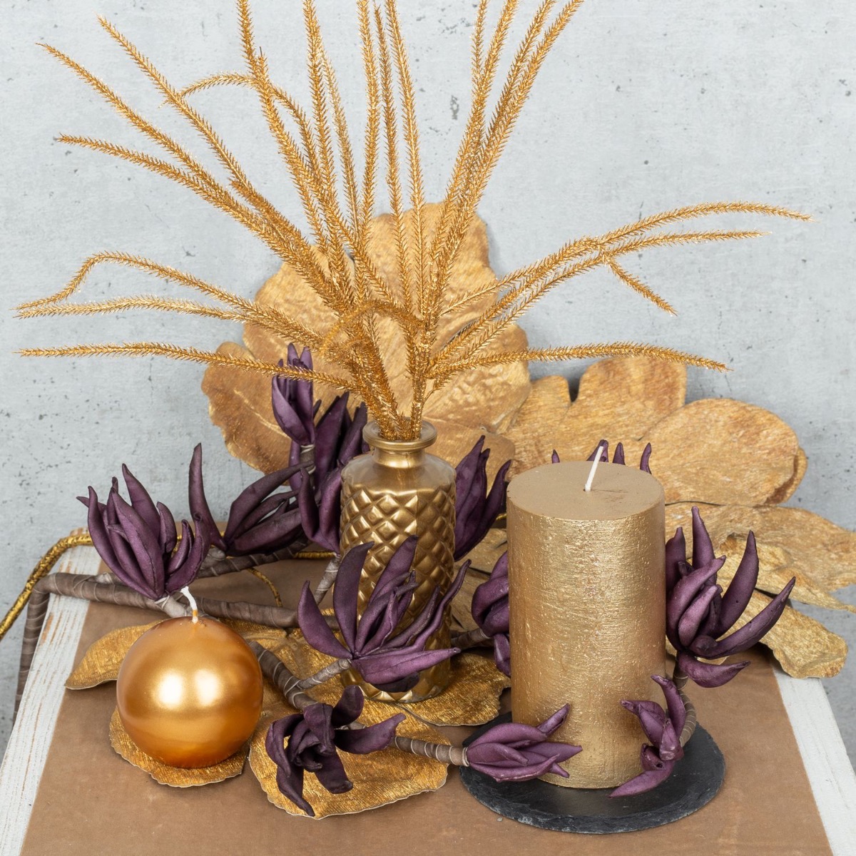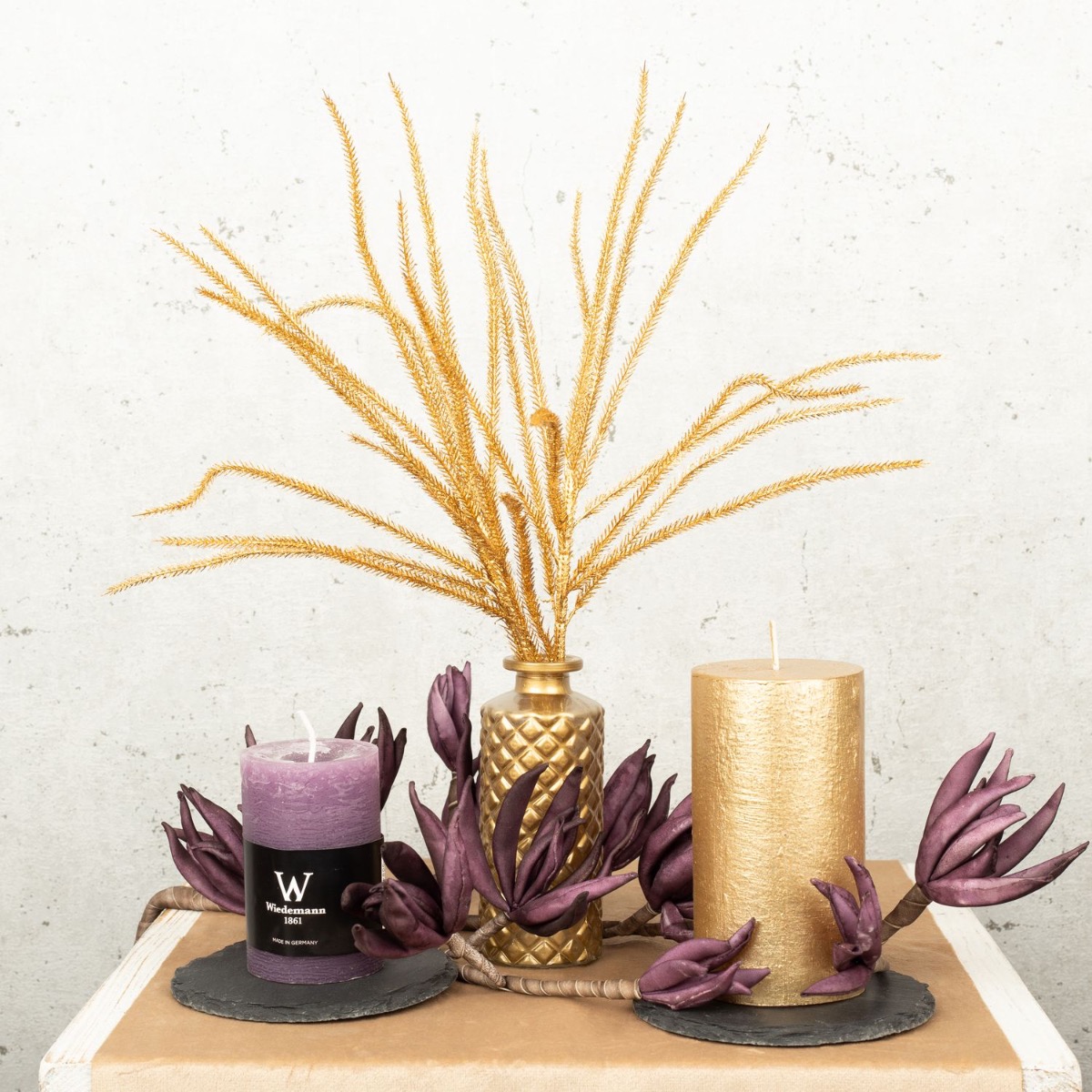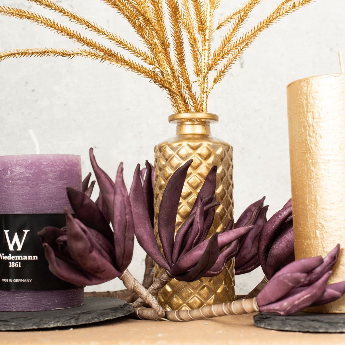 Violett und Gold! Eine stimmungsvolle Farbkombination, die besonders gut in die Winterzeit passt. Wenn es draußen kalt ist, dann möchte man Wärme in sein Zuhause bringen. Die warmen Goldtöne sind hier besonders gut geeignet, denn sie erzeugen auch eine festliche Stimmung für die bevorstehende Weihnachtszeit. Die Lilafarbenen Kunstschaumblüten ragen zwischen der Tischdeko hervor und umspielen die goldenen Elemente auf dem Tisch. Verzaubern auch Sie Ihre Gäste mit dieser traumhaften Deko. Shop the Look!