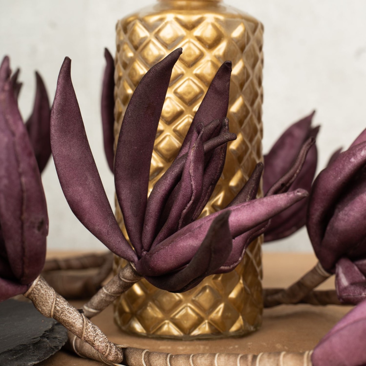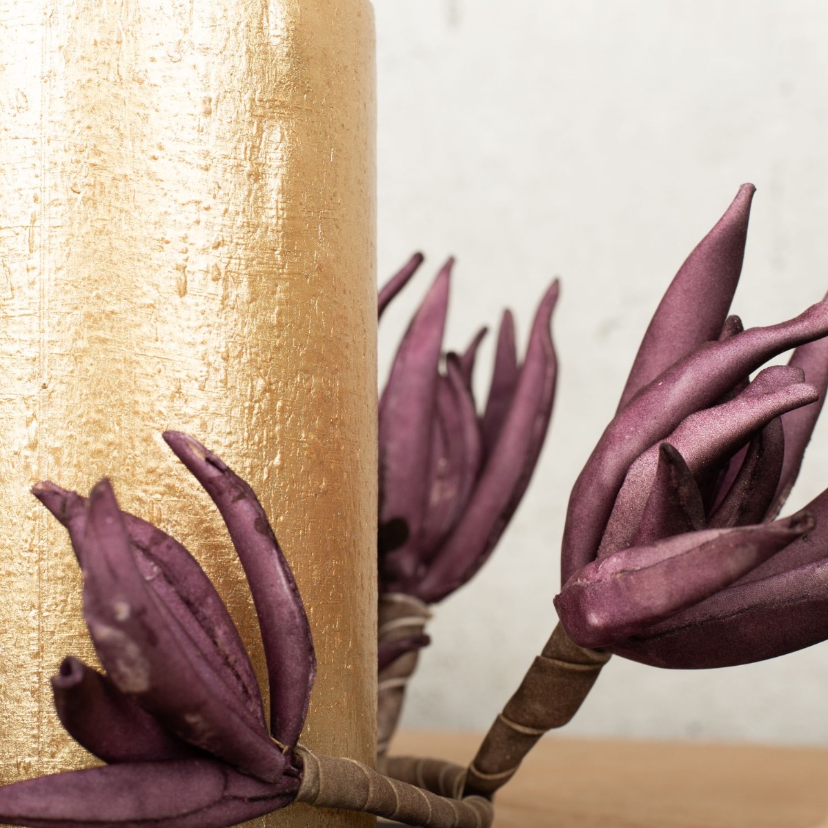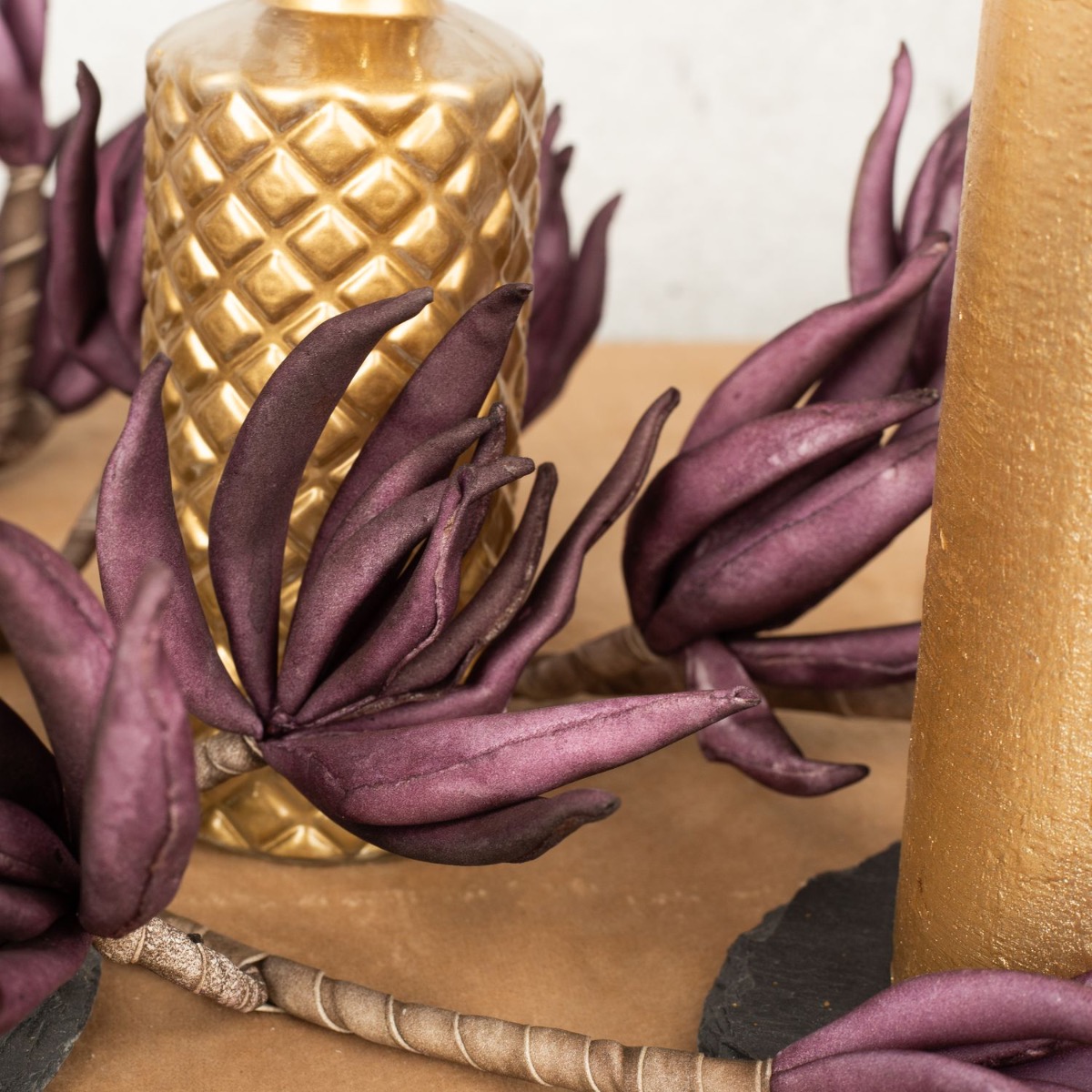 Violett und Gold! Eine stimmungsvolle Farbkombination, die besonders gut in die Winterzeit passt. Wenn es draußen kalt ist, dann möchte man Wärme in sein Zuhause bringen. Die warmen Goldtöne sind hier besonders gut geeignet, denn sie erzeugen auch eine festliche Stimmung für die bevorstehende Weihnachtszeit. Die Lilafarbenen Kunstschaumblüten ragen zwischen der Tischdeko hervor und umspielen die goldenen Elemente auf dem Tisch. Verzaubern auch Sie Ihre Gäste mit dieser traumhaften Deko. Shop the Look!