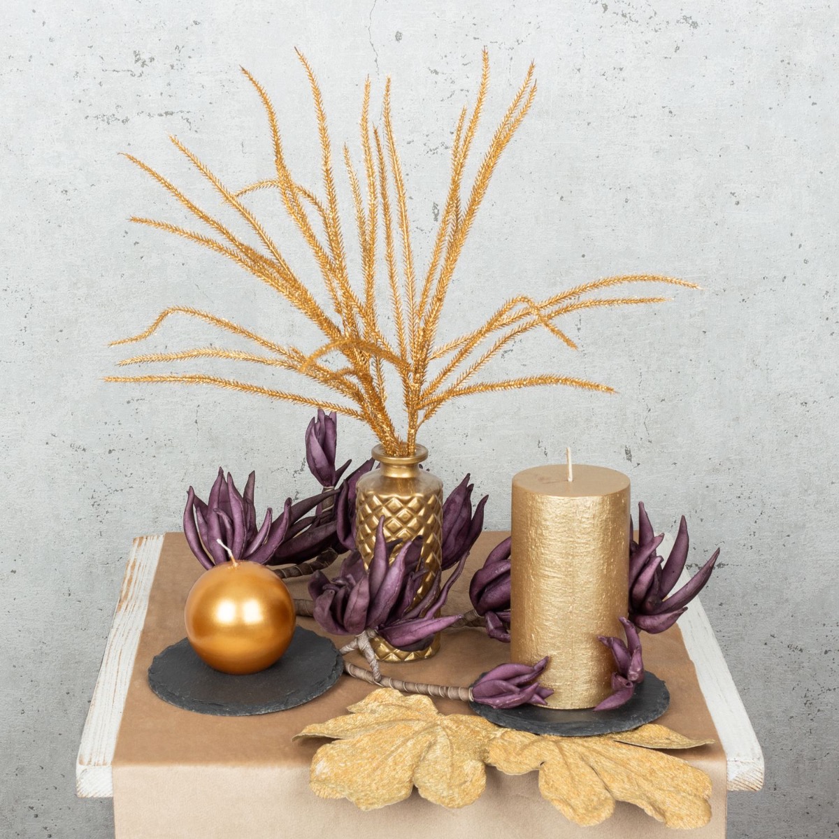 Gestaltungstipp: Das goldene Feigenblatt wurde zuerst auf den Tisch gelegt. Teilweise dienen die Blätter als Unterlage für Kerzen und Vasen. Man kann die Blätter auch vom Stiel entfernen, dann tut man sich bei der Gestaltung leichter. Der Zweig aus lila Kunstschaumblüten wird flach auf den Tisch gelegt und die Blüten werden nach oben gebogen. Man kann den Stiel einfach abschneiden oder um die Dekoelemente herumbiegen.