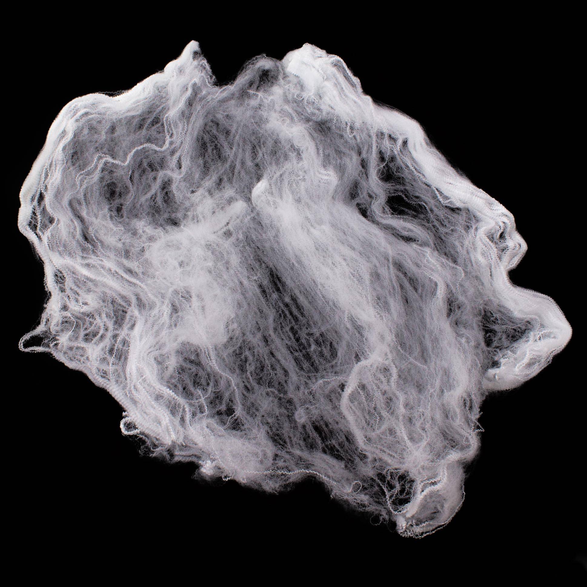 Künstliches, weißes Gewebe FORMIA, das im Dunklen leuchtet UV-Aktiv, in einer 50 g Packung. Aus dem feinen Material lassen sich realistische Spinnennetze gestalten ein Must Have auf jeder Halloween Party.