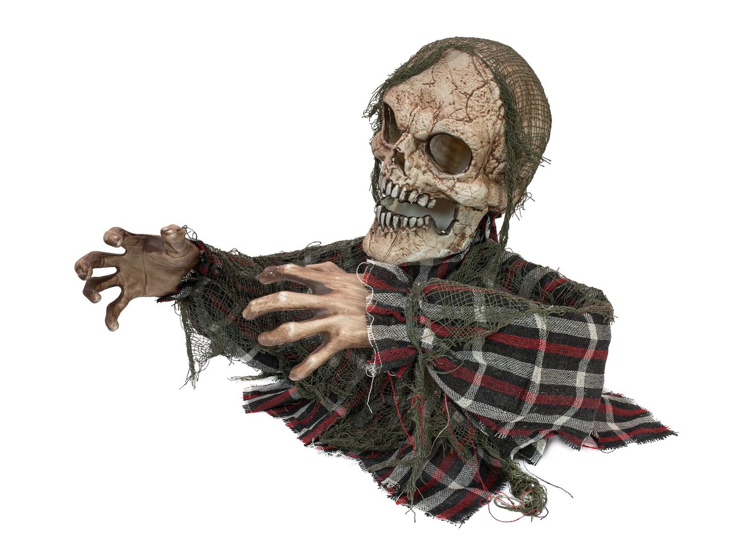 - Das Skelett sieht aus als wenn es gerade aus dem Boden steigt, es ist mit einem rotkarierten Hemd bekleidet über dem ein grober grüner Umhang liegt
