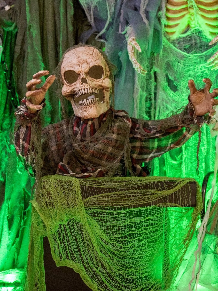 - Durch die motorisierte Mechanik bewegen sich die Arme auf und ab, der hole Kopf mit grün blinkender LED Beleuchtung wirft sich mit Ächzen und Stöhnen hin und her, außerdem ist das gerassel von schweren Ketten zu hören