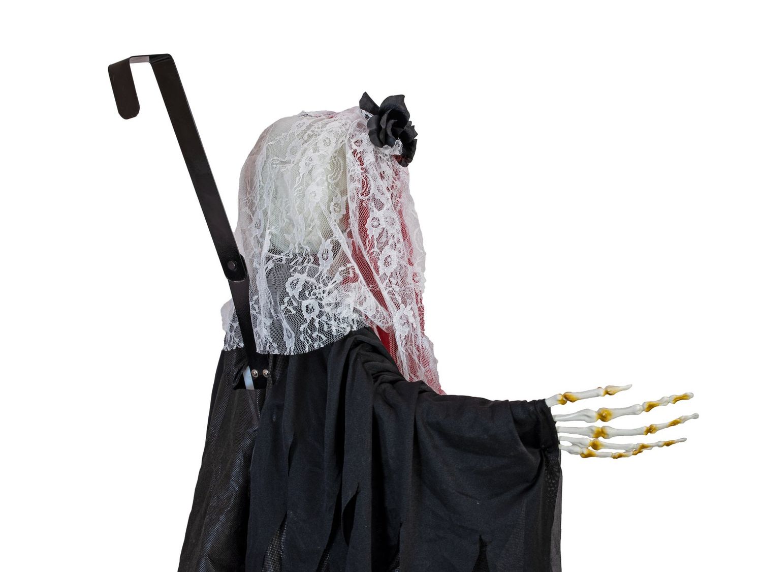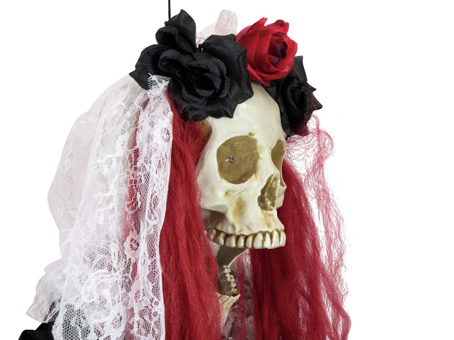 - Mit leuchtend roten Haaren, mit Schleier aus weißer Spitze, der durch drei Rosen in den Farben Schwarz und Rot festgehalten wird, im schwarzen Fetzengewand mit knochigen Händen, die Figur lässt sich mühelos z.B. an einem Schrank, Tür oder Gartenzaun befestigen, gleiche Technik wie bei einer Türgarderobe, um empfindliche Möbel zu schützen empfehlen wir den Hanken mit Filz zu bekleben