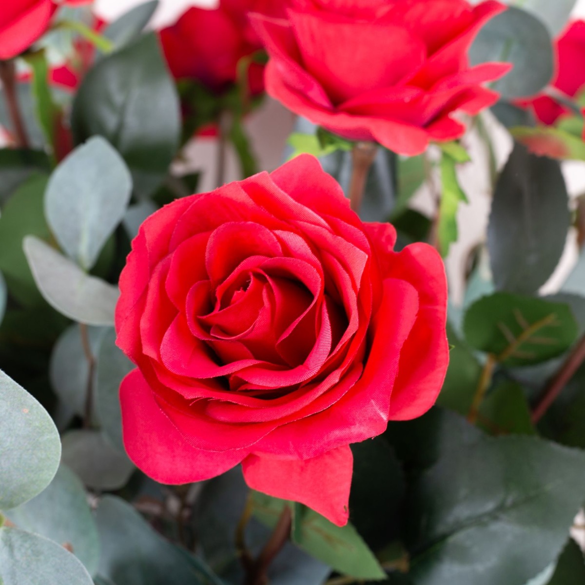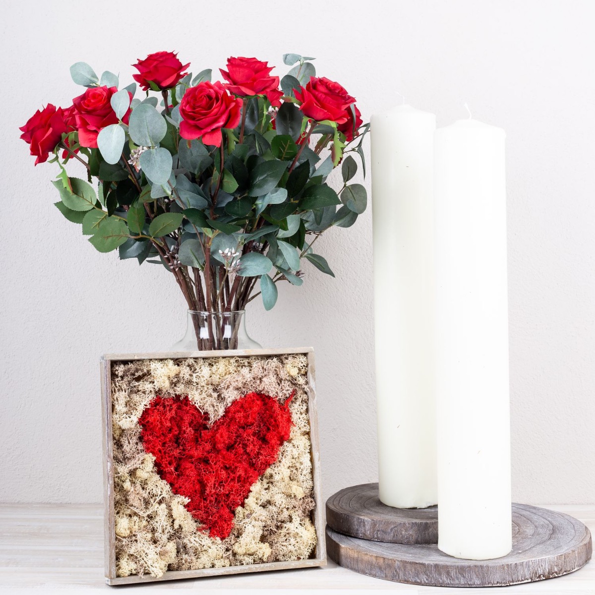 Ein Herz und rote Rosen! Eine bessere Liebeserklärung gibt es nicht. Der Rosenstrauß besteht aus 12 langstieligen Textilrosen, die in einer Glasvase im Apothekerstil stehen. Die Eukalyptuszweige bringen eine farblich frische Note in das Bouquet. Unser DIY-Herz aus Naturmoos ist nicht nur am Valentinstag oder Muttertag schön anzuschauen. Es erinnert jeden Tag an die Liebe und Zuneigung des Schenkenden. Zwei große, weiße Bodenkerzen sorgen eine lange Zeit für eine romantische Stimmung. Das hält locker bis Weihnachten. Shop the Look!