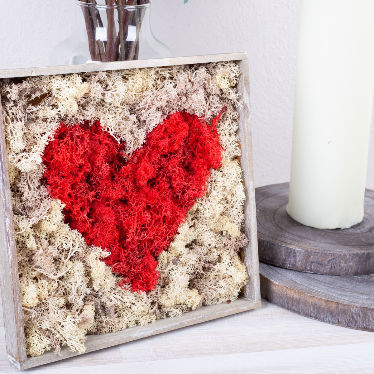Gestaltungstipp: Die Rosen etwas zurechtbiegen und zum Strauß binden. Eventuell auf Vasengröße kürzen. Für das Herz aus Naturmoos benötigt man eine Heißklebepistole. Man beginnt mit dem Herz und klebt das rote Naturmoos in Herzform auf das Holztablett, welches hier zum Bilderrahmen umfunktioniert wurde. Die Kontur des Herzes kann ruhig etwas ungenau sein, das macht den natürlichen Effekt. Ist man zufrieden mit der Herzform, dann füllt man den Rest des Holzrahmens mit der zweiten Farbe des Mooses.