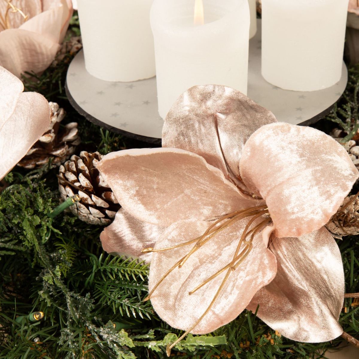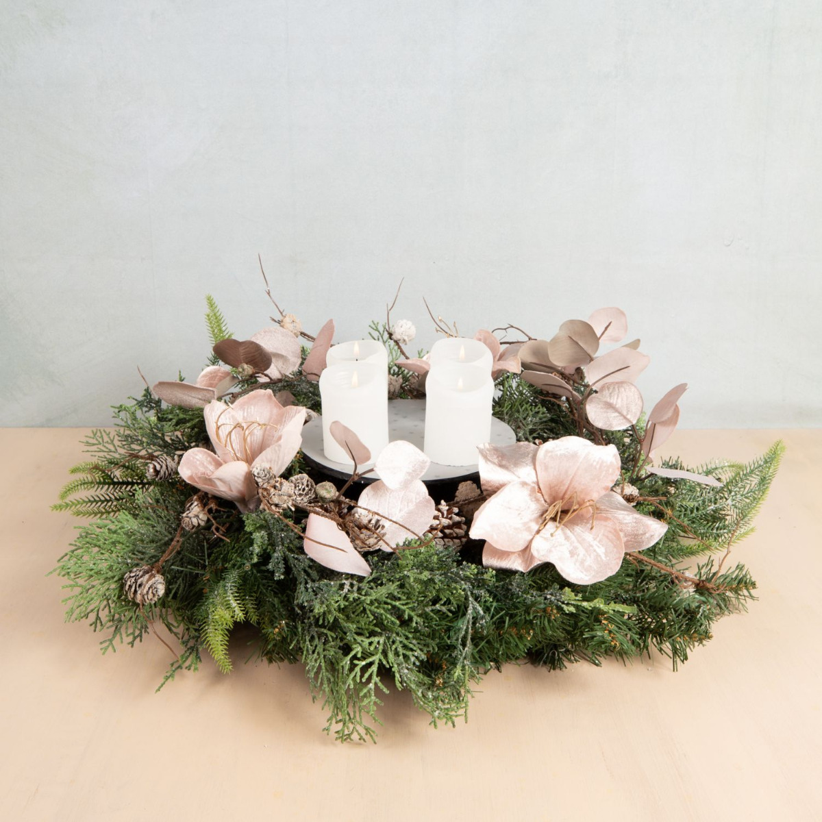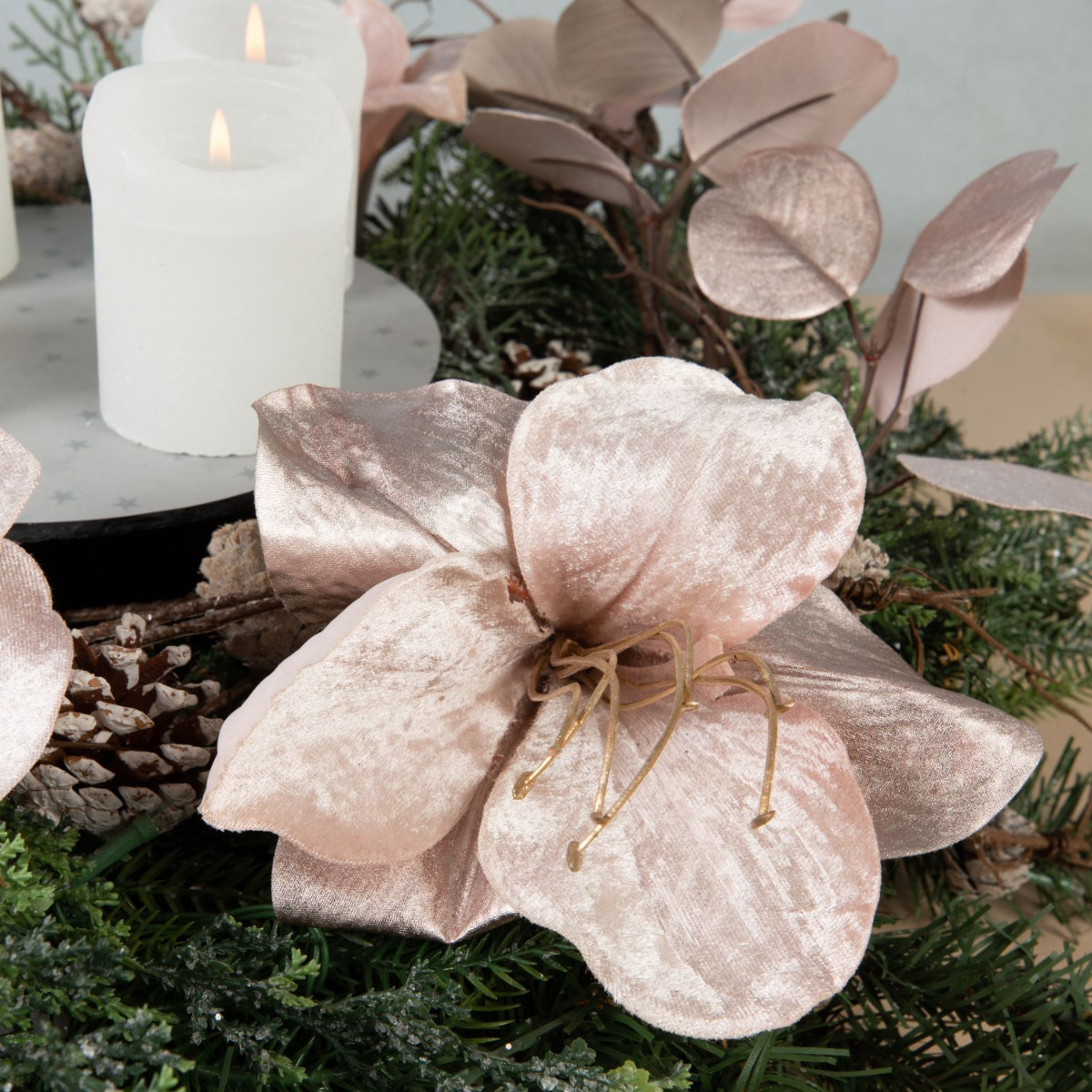 Traditionell und modern! Dieser Adventskranz wurde mit viel Liebe und Detailfreude zusammengestellt. Die Tannenzweige, Tannenzapfen und Zypressen des Kranzes mischen sich perfekt mit der samtigen Anmut der Amaryllis und des roséfarbenen Eukalyptus. Die moderne Anordnung der Kerzen in der Mitte des Kranzes gibt dem Look eine ganz neue Ausstrahlung. Da freut man sich doch auf Weihnachten. Shop the Look!