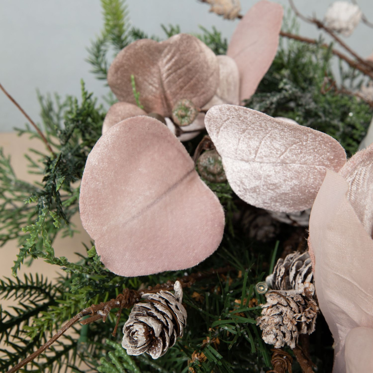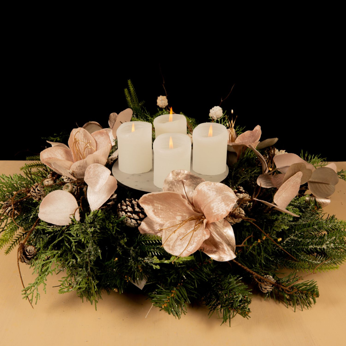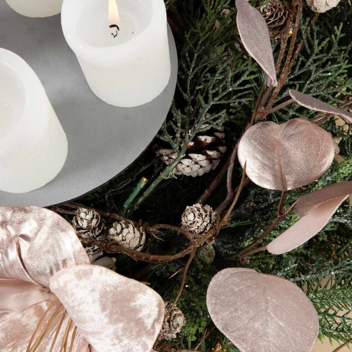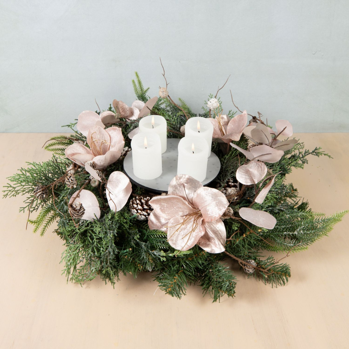 Traditionell und modern! Dieser Adventskranz wurde mit viel Liebe und Detailfreude zusammengestellt. Die Tannenzweige, Tannenzapfen und Zypressen des Kranzes mischen sich perfekt mit der samtigen Anmut der Amaryllis und des roséfarbenen Eukalyptus. Die moderne Anordnung der Kerzen in der Mitte des Kranzes gibt dem Look eine ganz neue Ausstrahlung. Da freut man sich doch auf Weihnachten. Shop the Look!