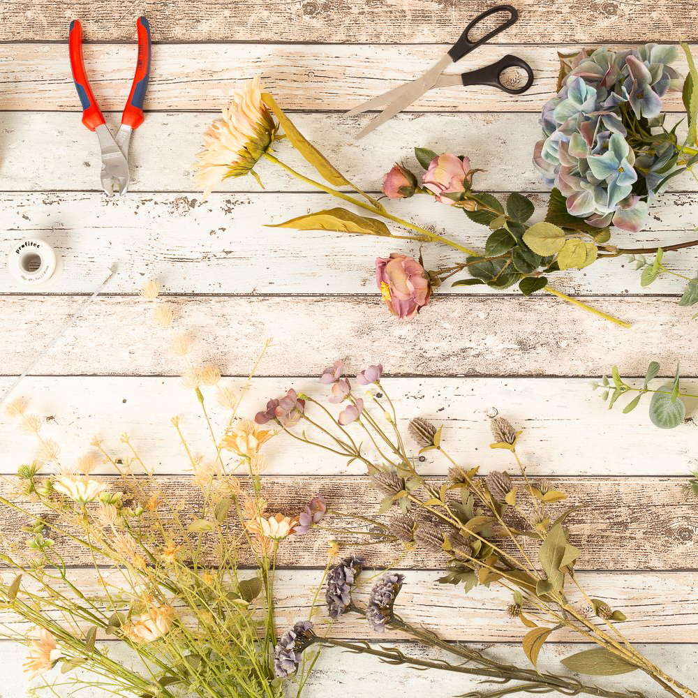 - Zusammengebunden mit einer Sisalschnur, die Blumen und Zweige können individuell gekürzt werden bzw. nach entfernen der Schnur auch einzeln für kreative Projekte verwendet werden