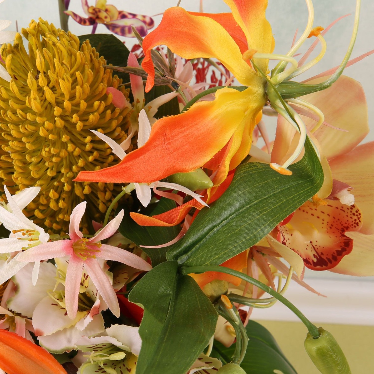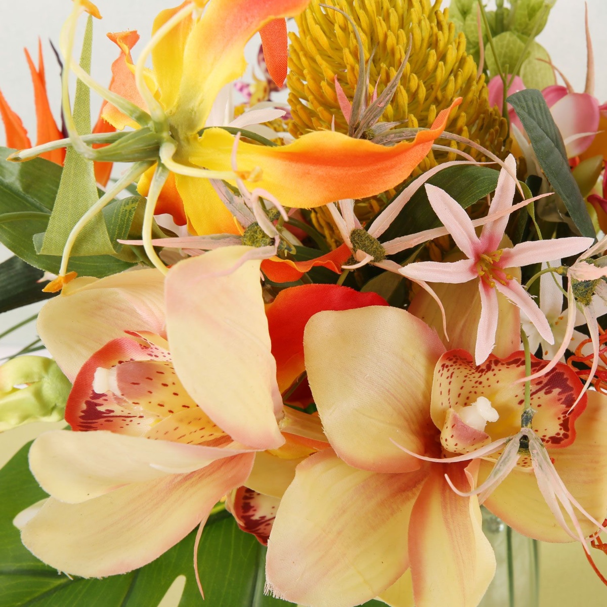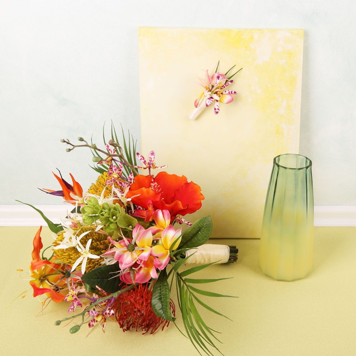 Feuerroter Hibiskus und knallorange Strelitzie! Ein Strauß aus exotischen Blumen gehört bei uns schon zu den Klassikern und erfreut sich hoher Beliebtheit. Deshalb kreieren wir auch immer wieder etwas Neues, denn an diesen außergewöhnlichen Blütenformen und den leuchtenden Farben kann man sich gar nicht satt sehen. Dieser Strauß sollte ein Brautstrauß werden. Also haben wir gleich eine hübsche Anstecknadel für den Bräutigam gezaubert. Der rote Hibiskus ist der Blickfang in diesem Bouquet, der von außergewöhnlichen Orchideen, Palmwedeln und Banksia Robur, auch bekannt als Sumpfbanksia, umgeben ist. Holen auch sie sich das exotische Feeling in Ihr Zuhause. Shop the Look!
