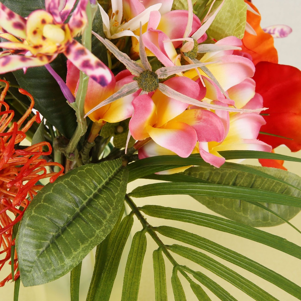 Gestaltungstipp: Die Blüten zu einem kompakten Strauß zusammenfügen, dazu mussten wir zum Teil die untersten Blüten am Zweig entfernen. Der rote Hibiskus sollte sich im vorderen Bereich befinden. Als letztes werden die Philodendronblätter und die Palmwedel dazugefügt. Sie bilden eine Manschette um den Strauß und sollten etwas nach unten gebogen werden. Den Strauß sehr fest zusammenbinden und auf gleiche Längen kürzen. Dann wird er mit einem Satinband umwickelt, damit er zum richtigen Brautstrauß wird. Mit einer Stecknadel das Ende des Satinbandes befestigen.