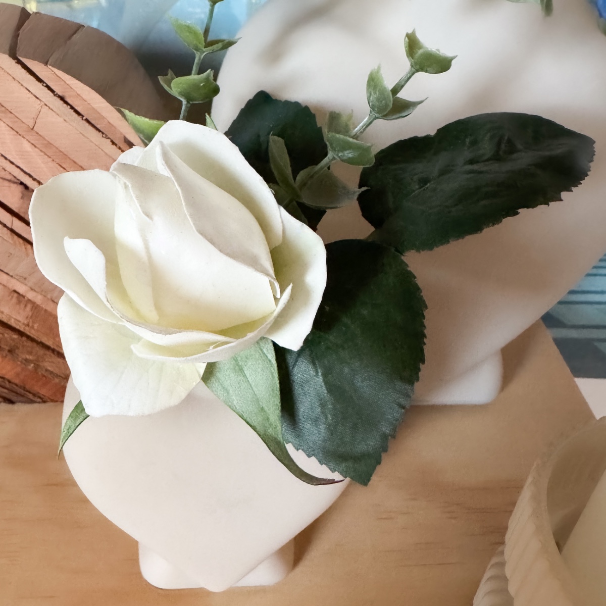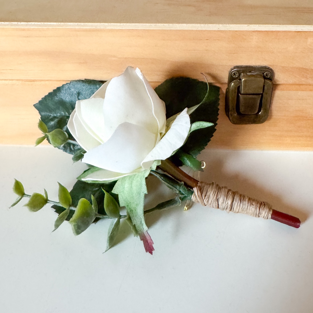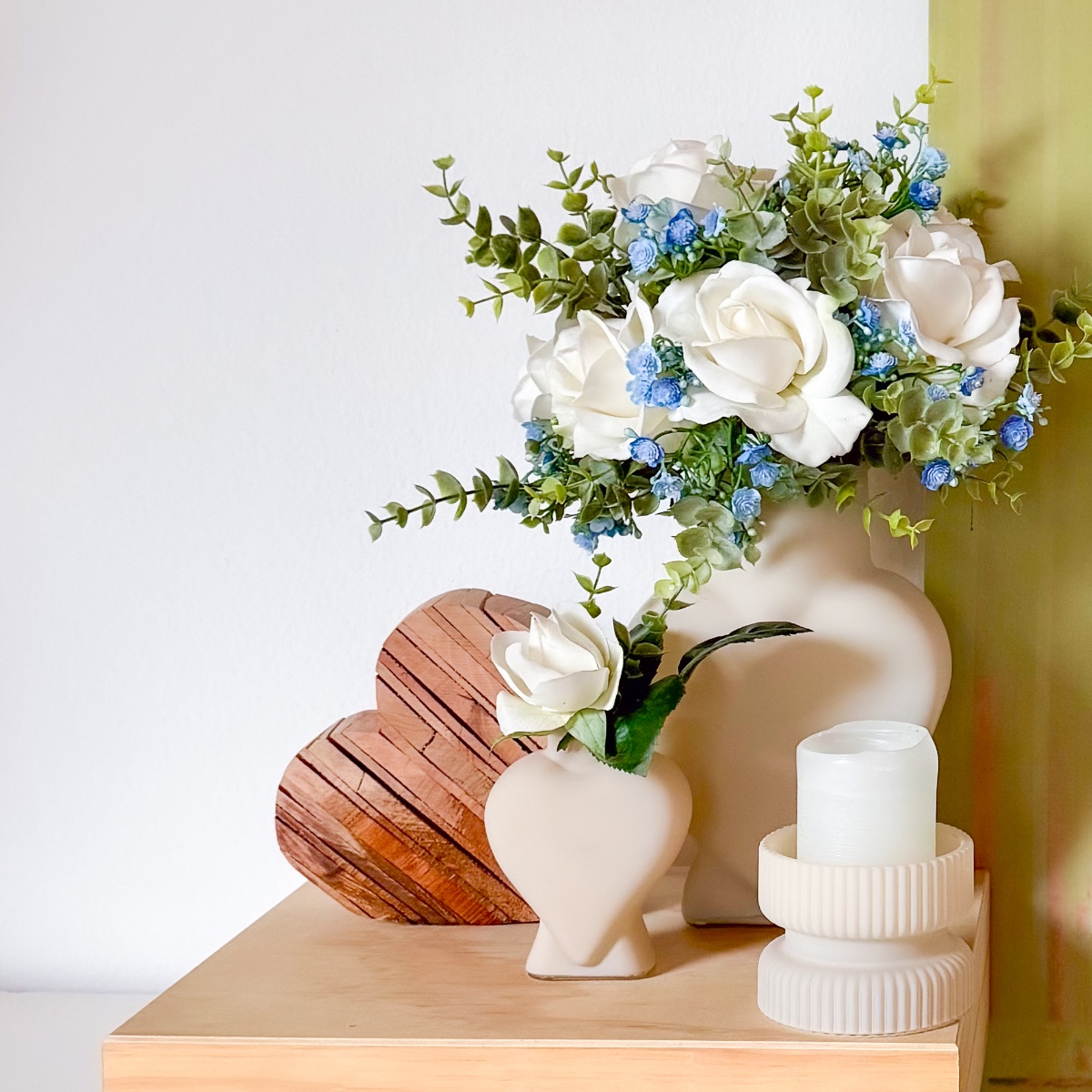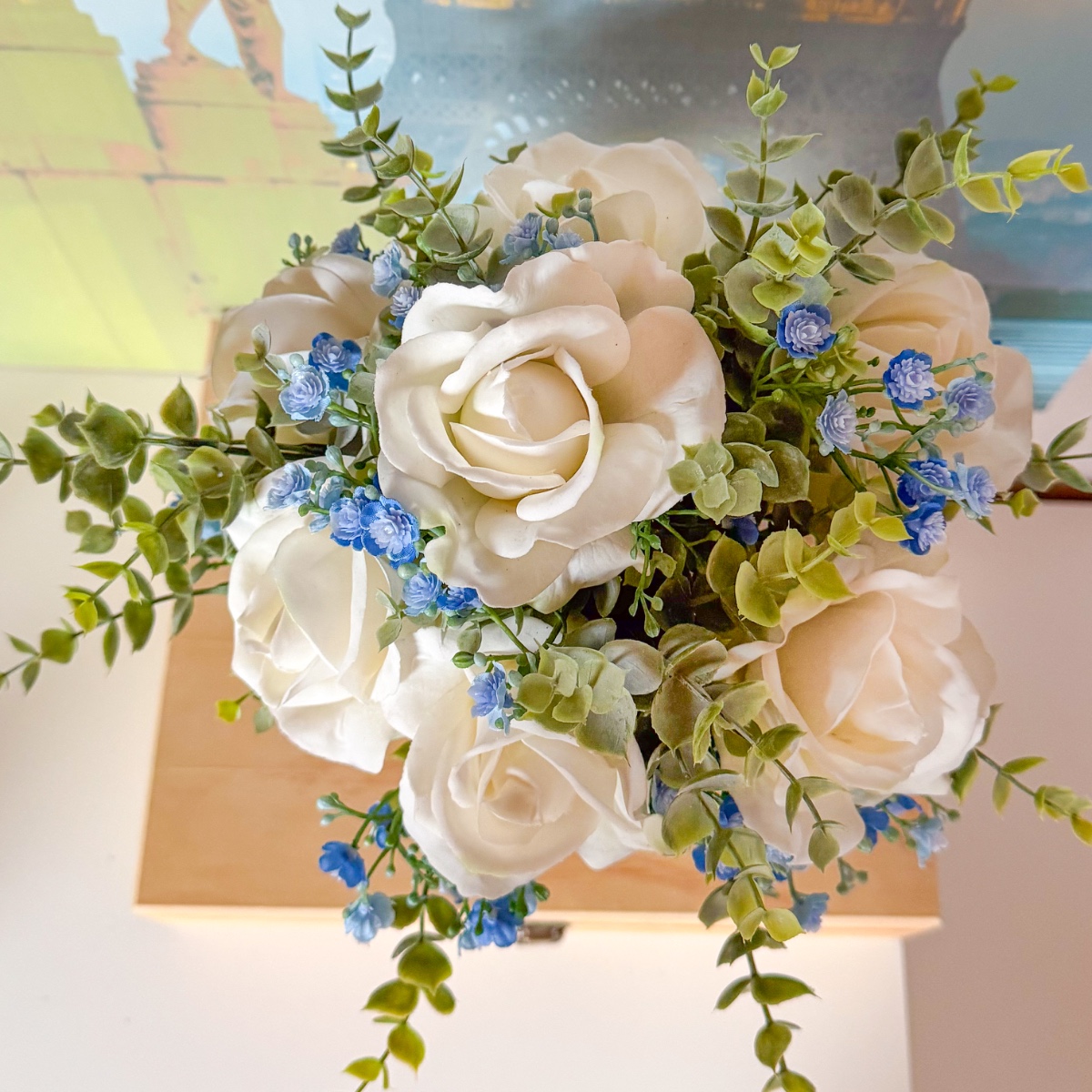 Blüten, die Liebe für immer festhalten! Für Andy und Janine haben wir einen Strauß für ihren großen Tag kreiert. Die cremefarbenen Rosen strahlen klassische Schönheit aus, sind besonders realistisch und fühlen sich fast wie echte Blumen an. Das Schleierkraut setzt sanfte hellbläuliche Farbtupfer, während der Eukalyptus die natürliche Frische unterstreicht. Passend dazu haben wir einen stilvollen Anstecker für den Bräutigam gefertigt, der den Look harmonisch abrundet. Ob für Fotos, den Gang zum Traualtar oder als Erinnerungsstück für die Ewigkeit – dieser Hochzeitsstrauß hält die schönsten Momente liebevoll fest. Shop the Look!