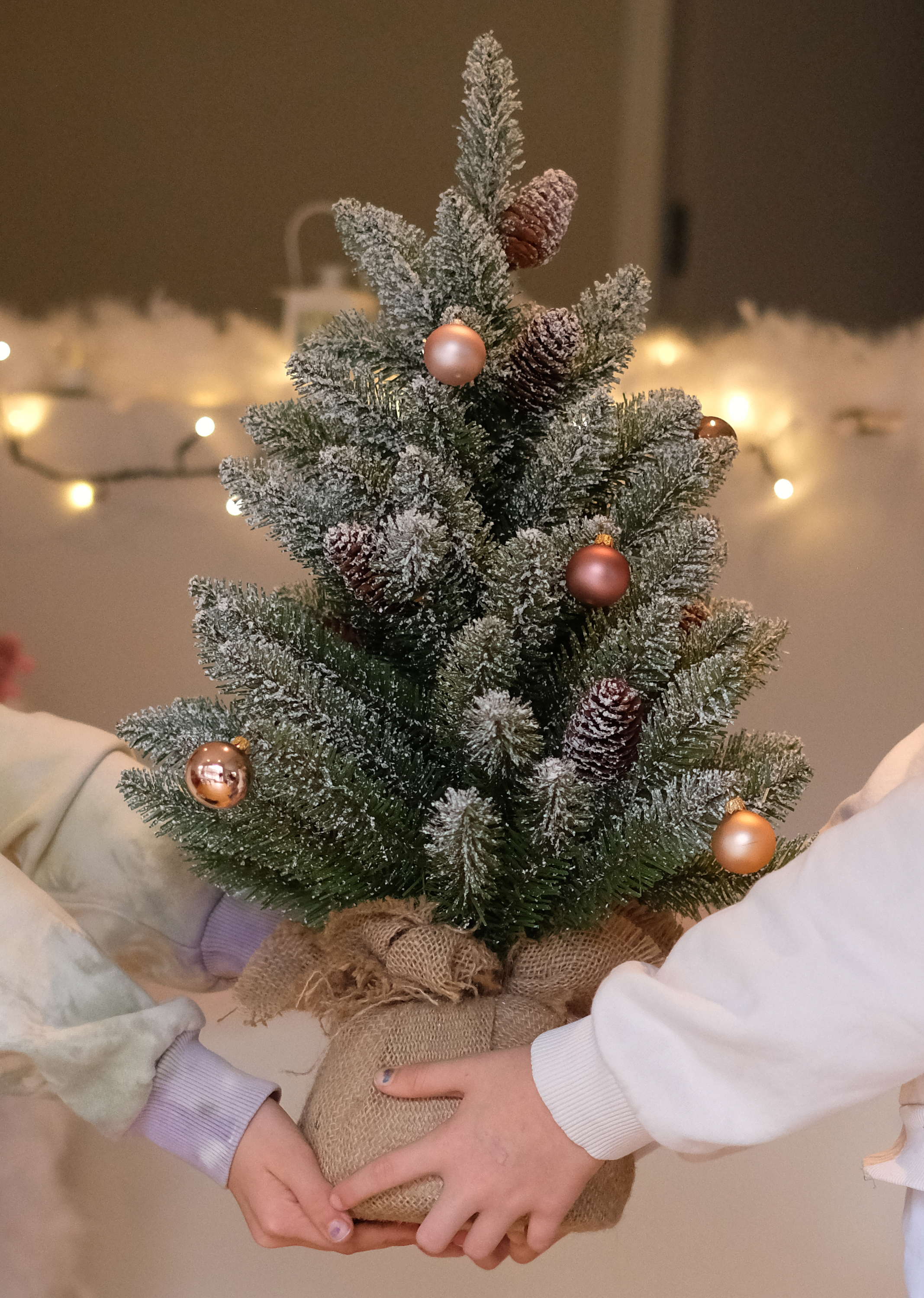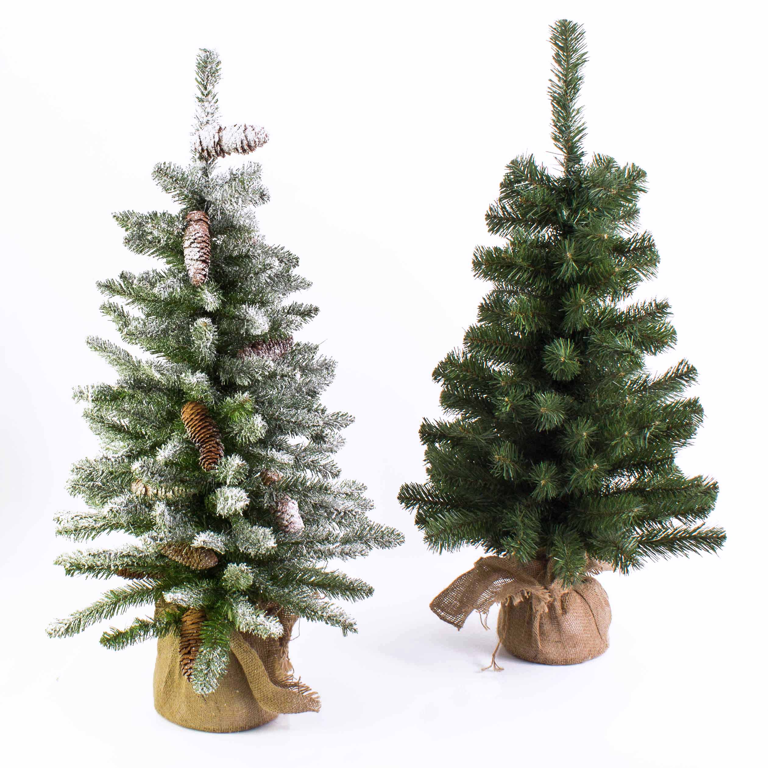 Kunst Christbaum WIEN mit Jutesack besteht aus PVC Nadeln und eignet sich als Deko für den Flur, auf dem Sideboard, Couchtisch, Empfangstresen, usw.