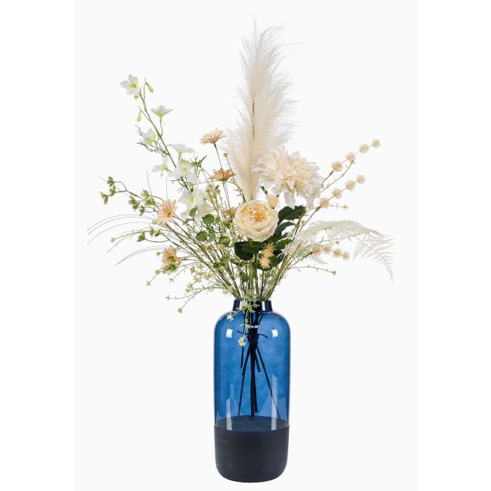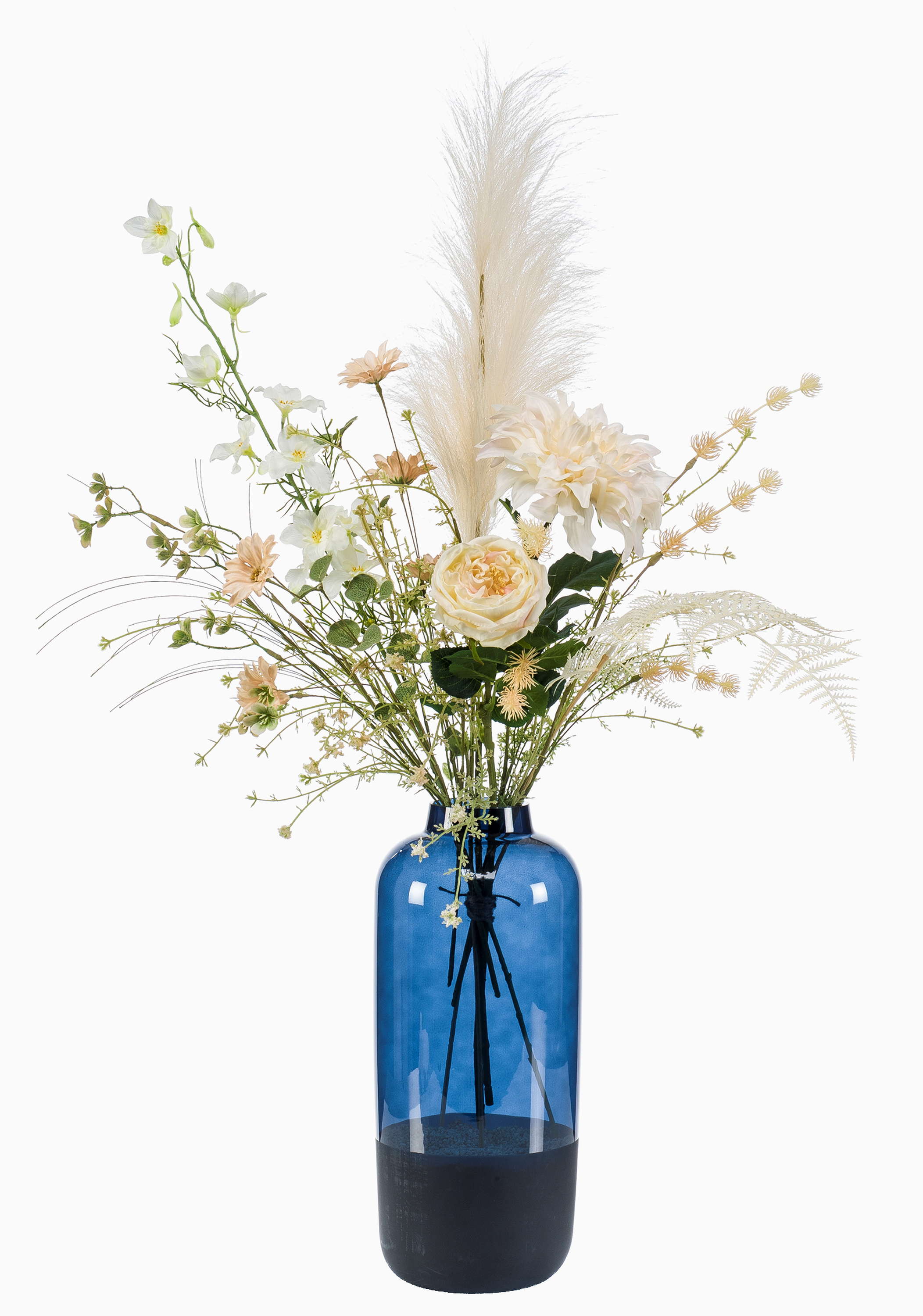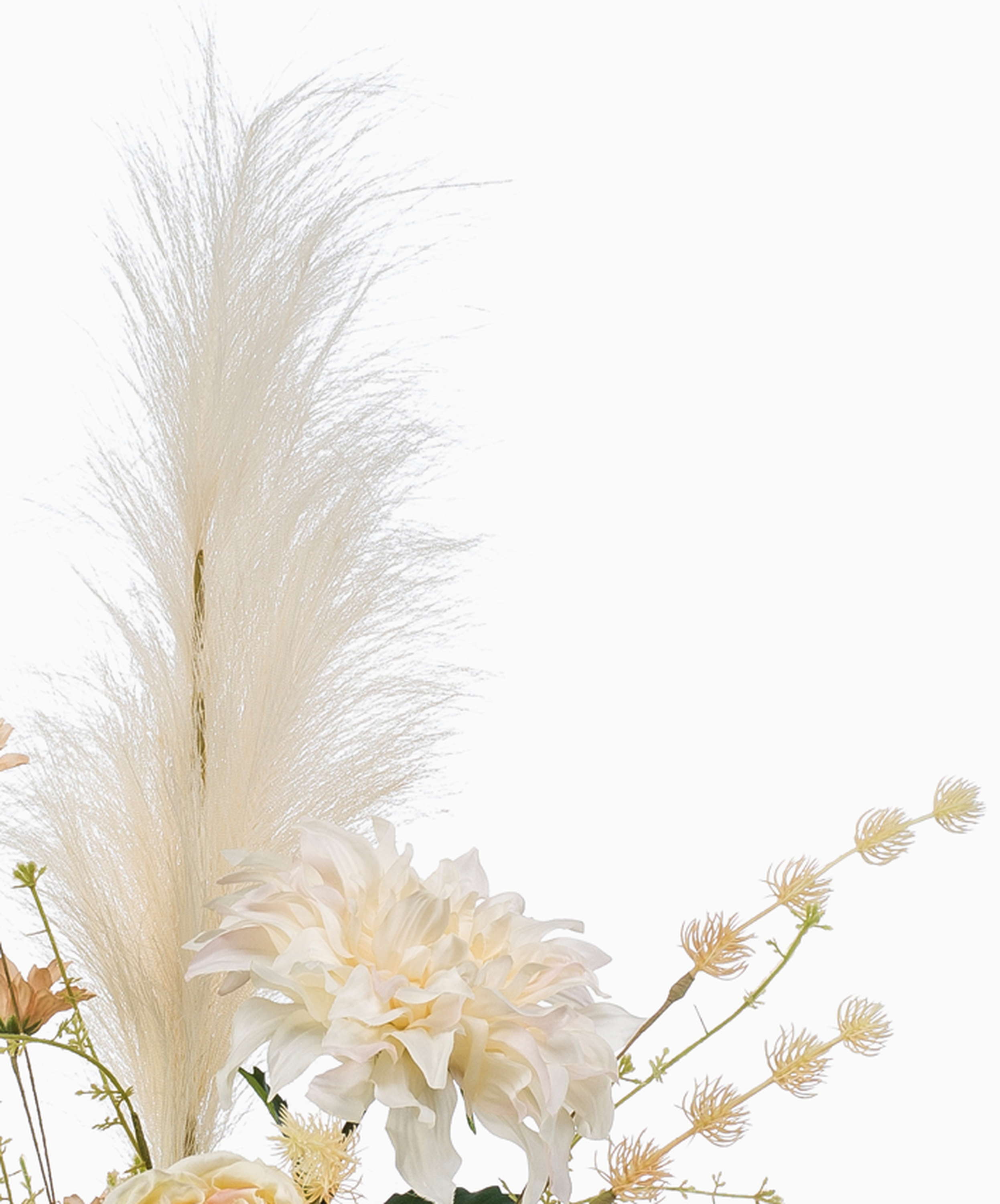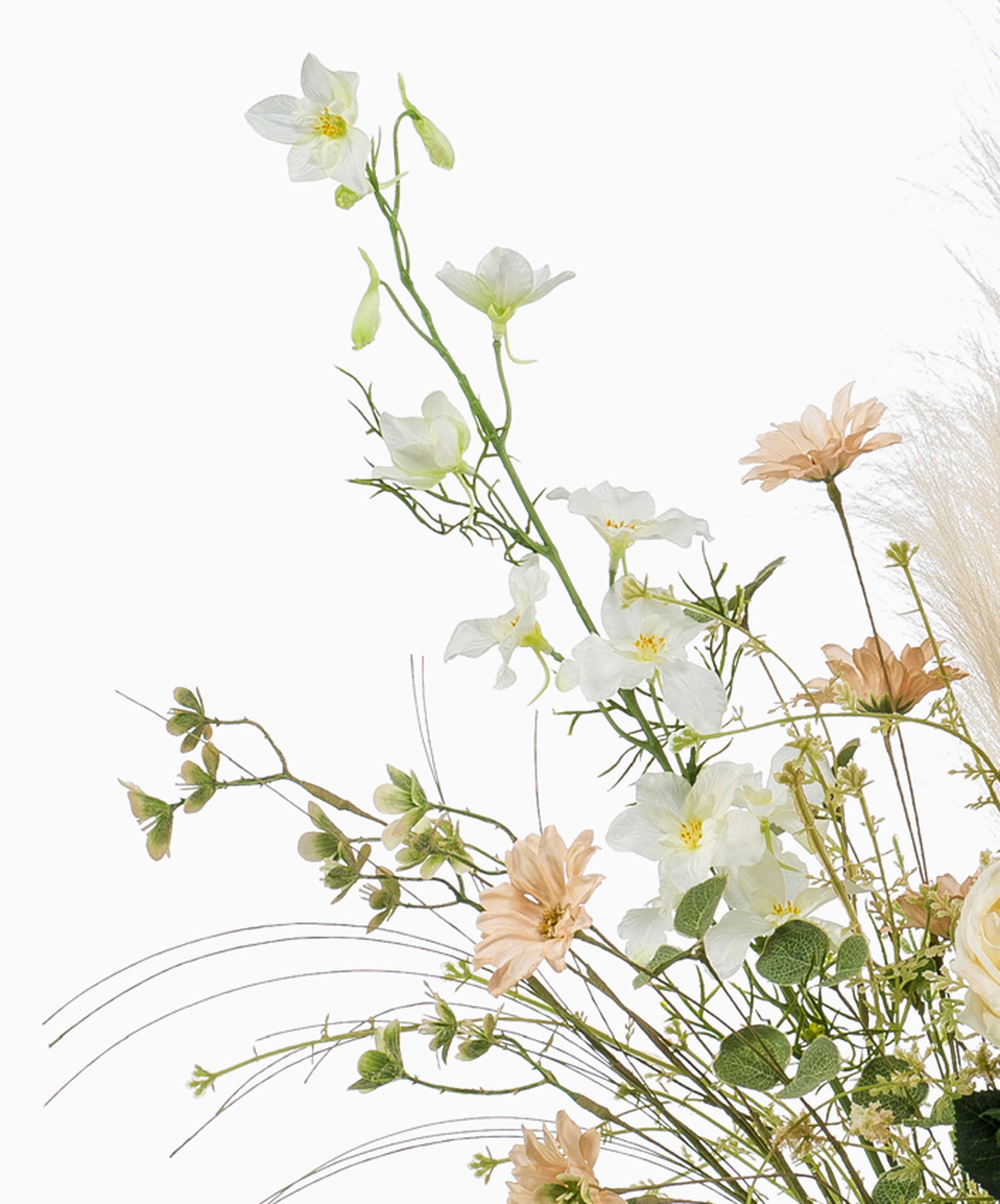 - Kunst Blumengesteck bestehend aus Rittersporn, Chrysantheme, Rose, Margerite, Pampasgras und Königsfarn in Farbe aprikose-creme