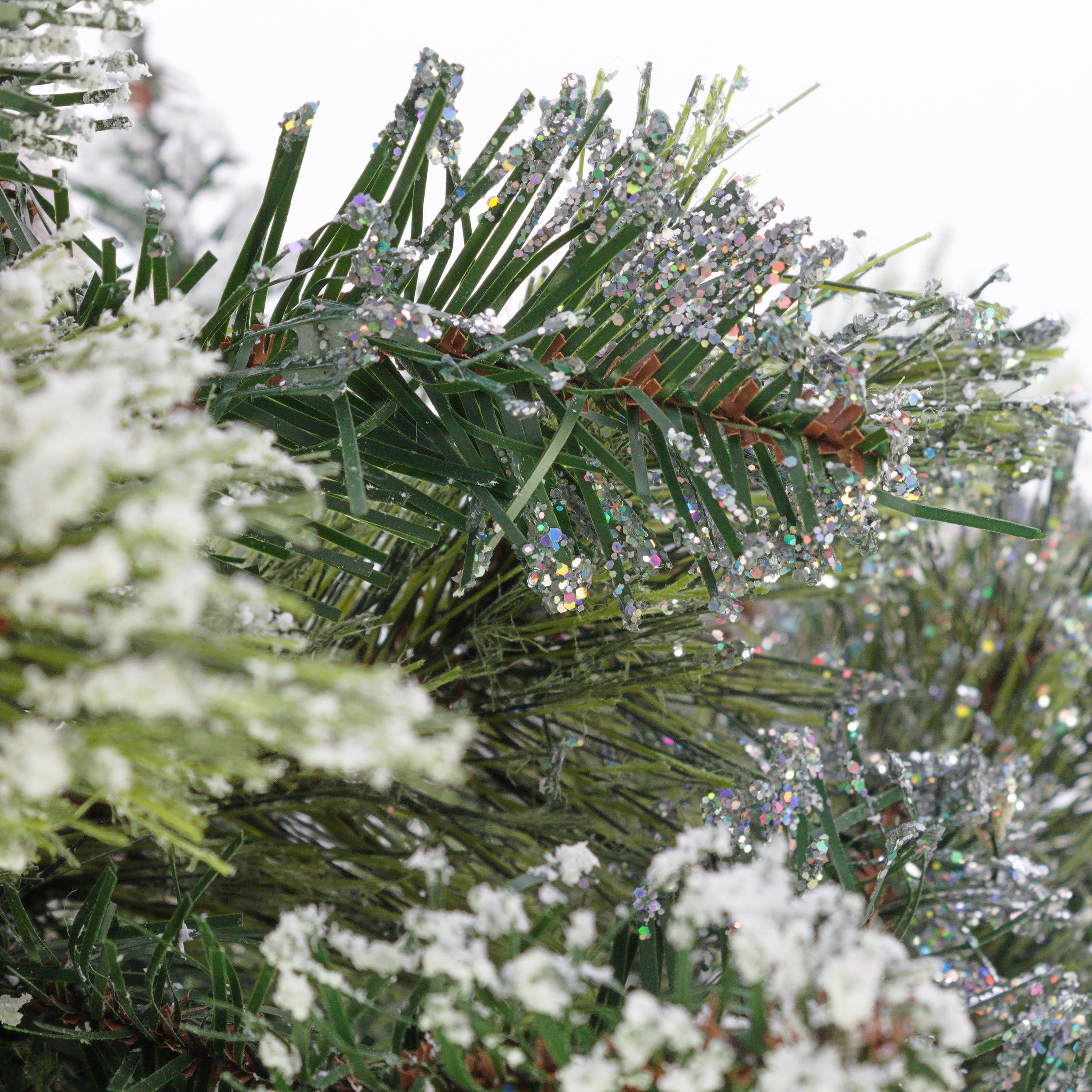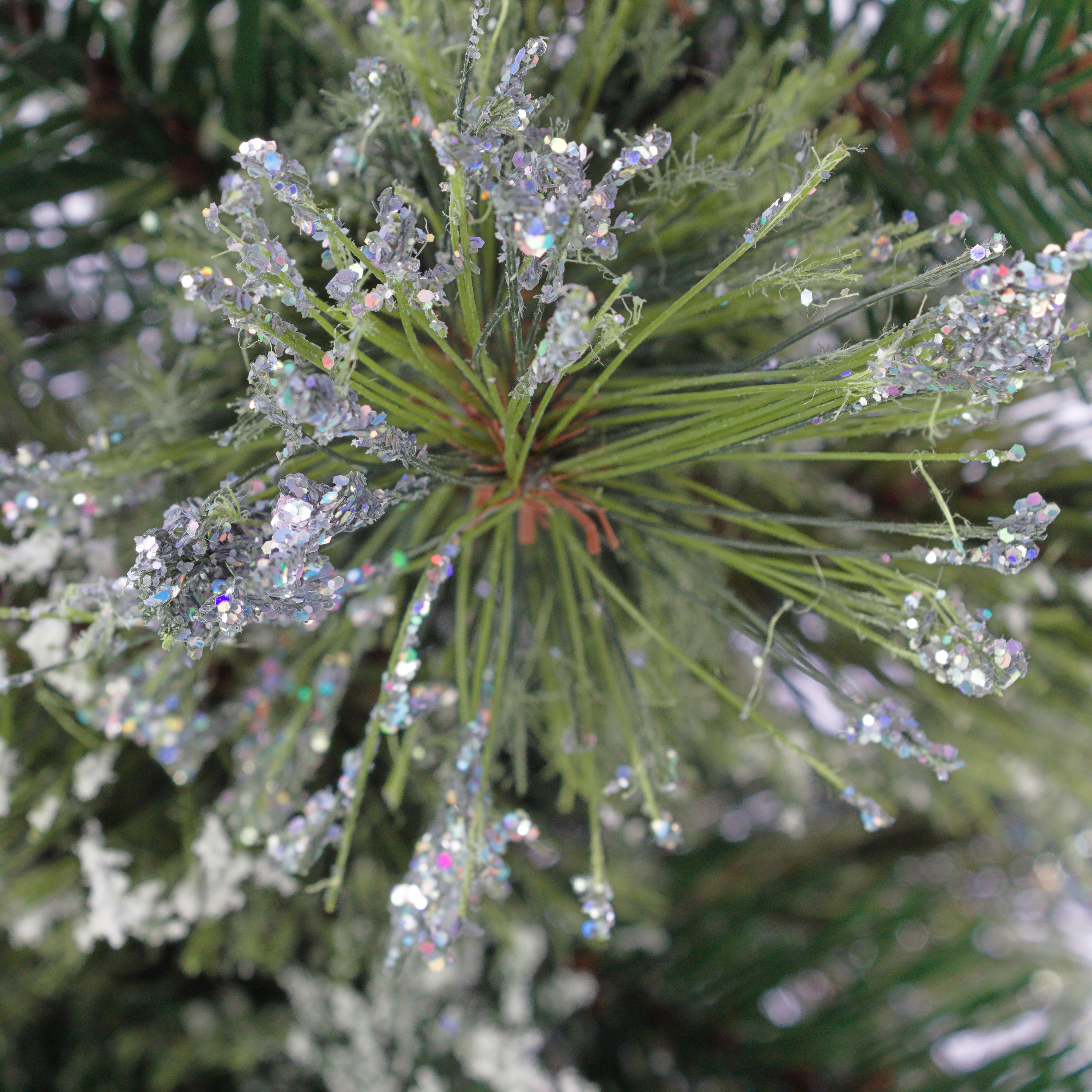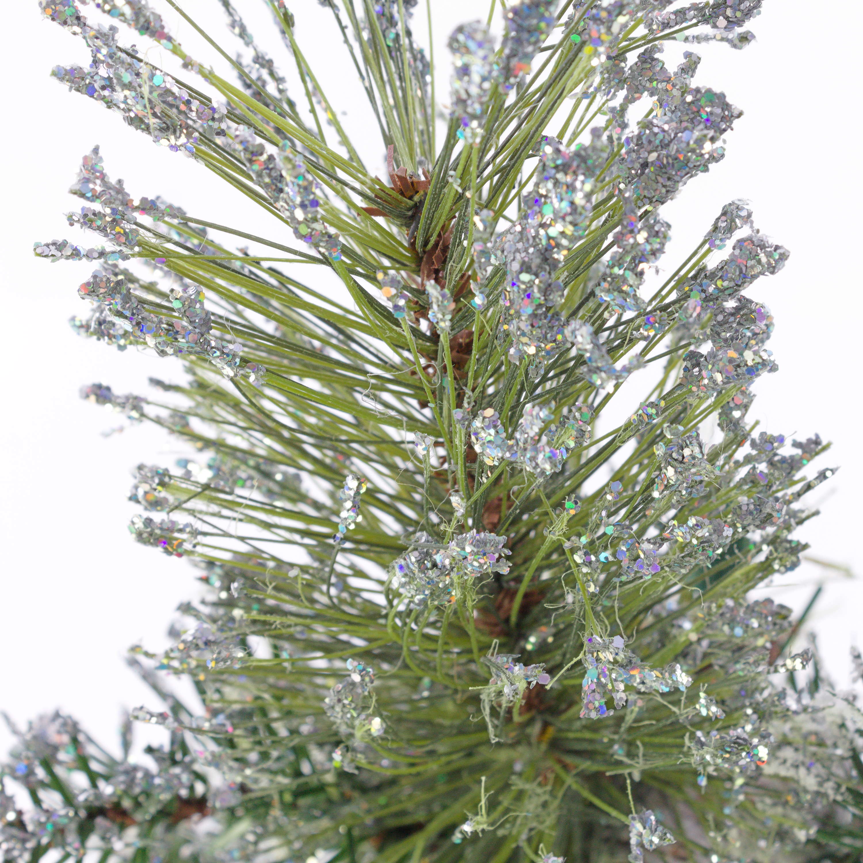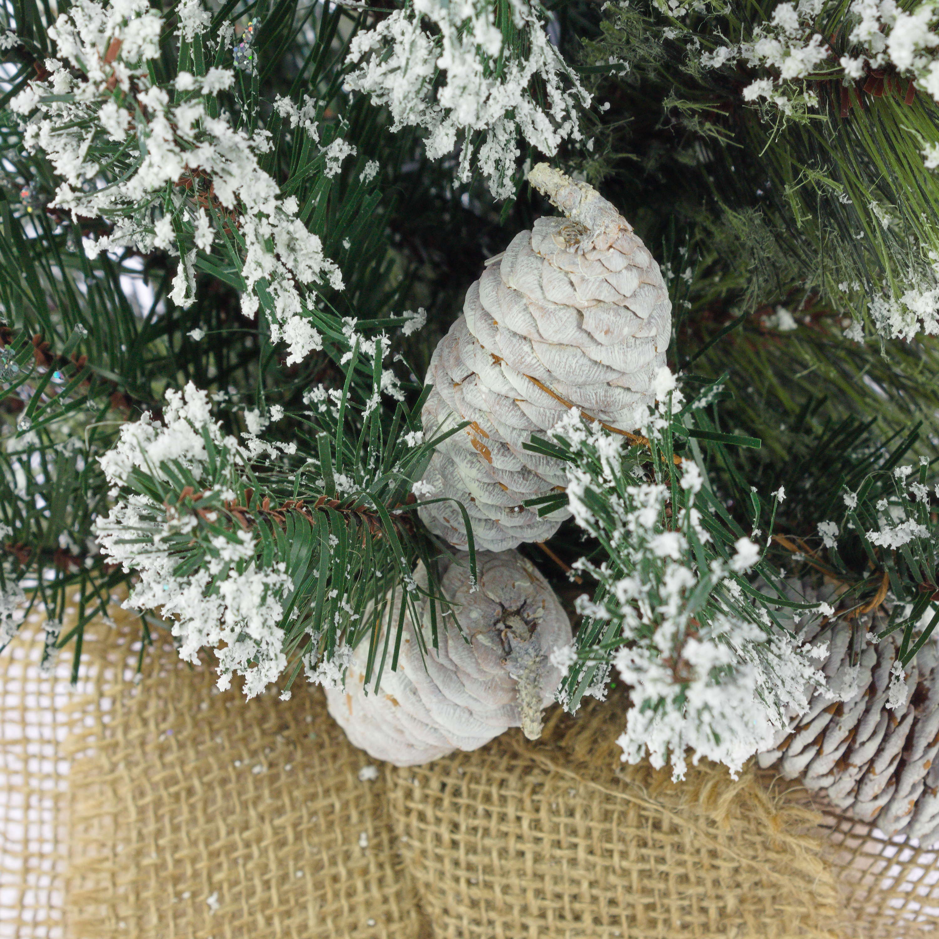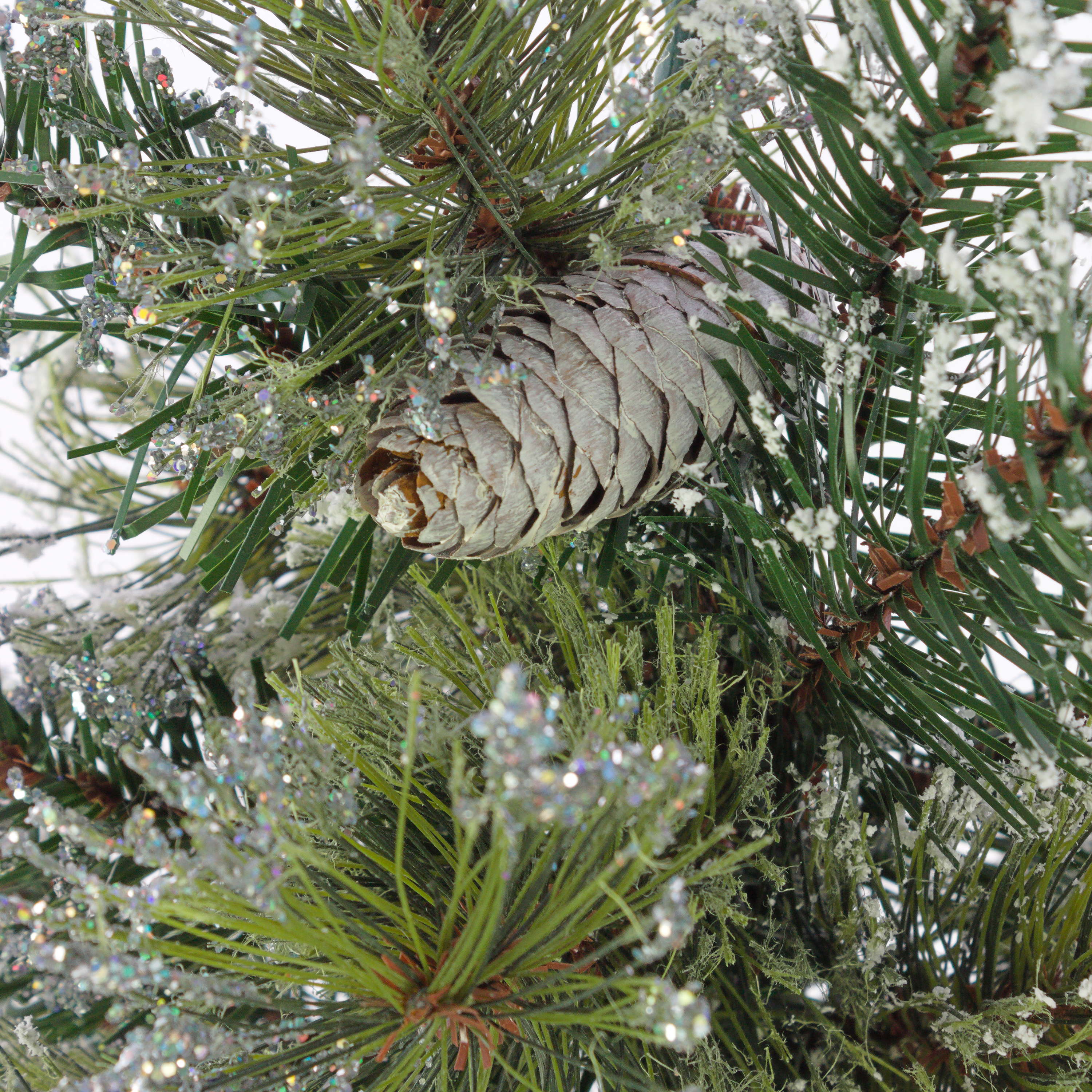 - Ca. 56 grüne Kunstzweige mit vielen Tannenzapfen und Glitzer, fest fixiert am Stamm