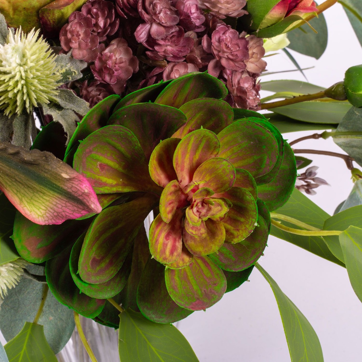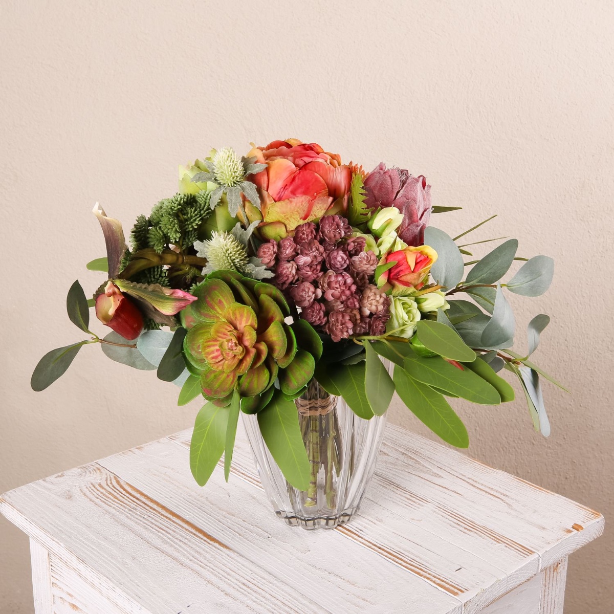Der stilvolle Blumenstrauß mit Sukkulenten ist ein echtes Statement-Piece. Die perfekt aufeinander abgestimmten Elemente des Straußes wirken modern, mutig und kunstvoll zugleich. Die Sukkulenten schaffen einen spannenden Kontrast zu den üppigen Blüten, eine außergewöhnliche Kombination, die sich von klassischen Blumensträußen abhebt. Als Geschenk oder bei einer Feier ist dieser zudem ein perfekter Gesprächsstarter.