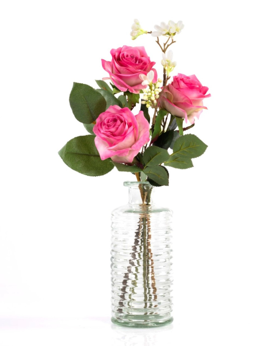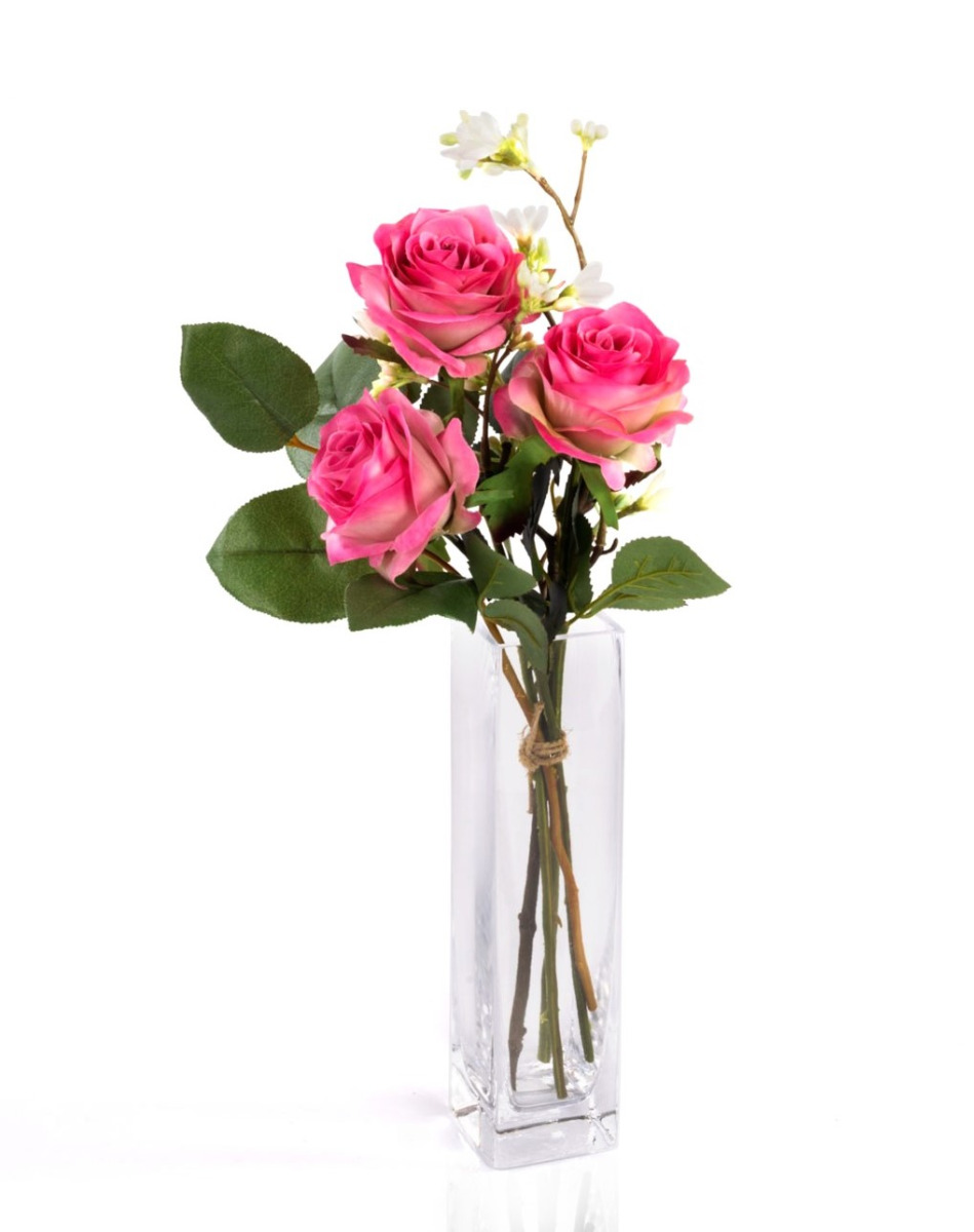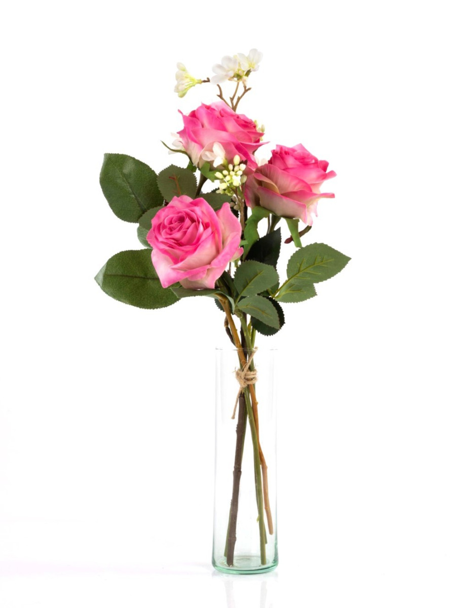 In Deutschland handgebundener, kleiner Rosen Strauß SIMONY aus 3 rosa-pink farbigen Rosen. Das künstliche Arrangement wird von der Blume Sieben Söhne des Himmels umspielt und durch frisches Grün des Apfelblattzweiges ergänzt. Der Kunst Blumenstrauß dekoriert Ihre Tischvase zu verschiedenen Tafel Anlässen wie z.B. Valentinstag, Jahrestag oder als Beigabe zu einem Geburtstagsgeschenk, uvm. Das Blumenensemble kann auch wunderbar zu einem üppigen Strauß erweitert werden, ergänzen Sie einfach noch weitere SIMONY-Sträuße ob Farbgleich oder buntgemischt, lassen Sie Ihrer Fantasie freien Lauf.