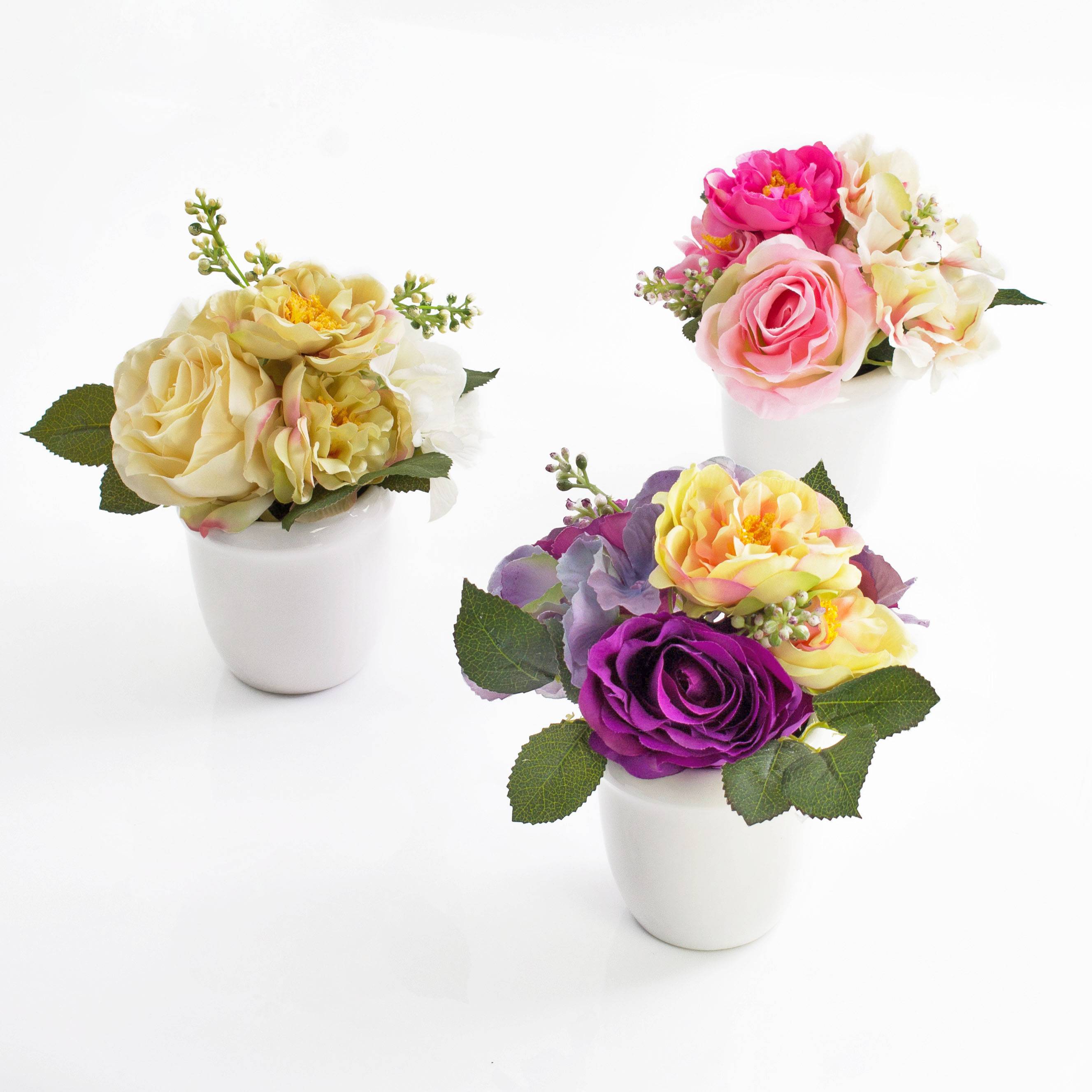 Künstliches Arrangement FELINE aus Kunstrosen und Hortensien im Keramiktopf