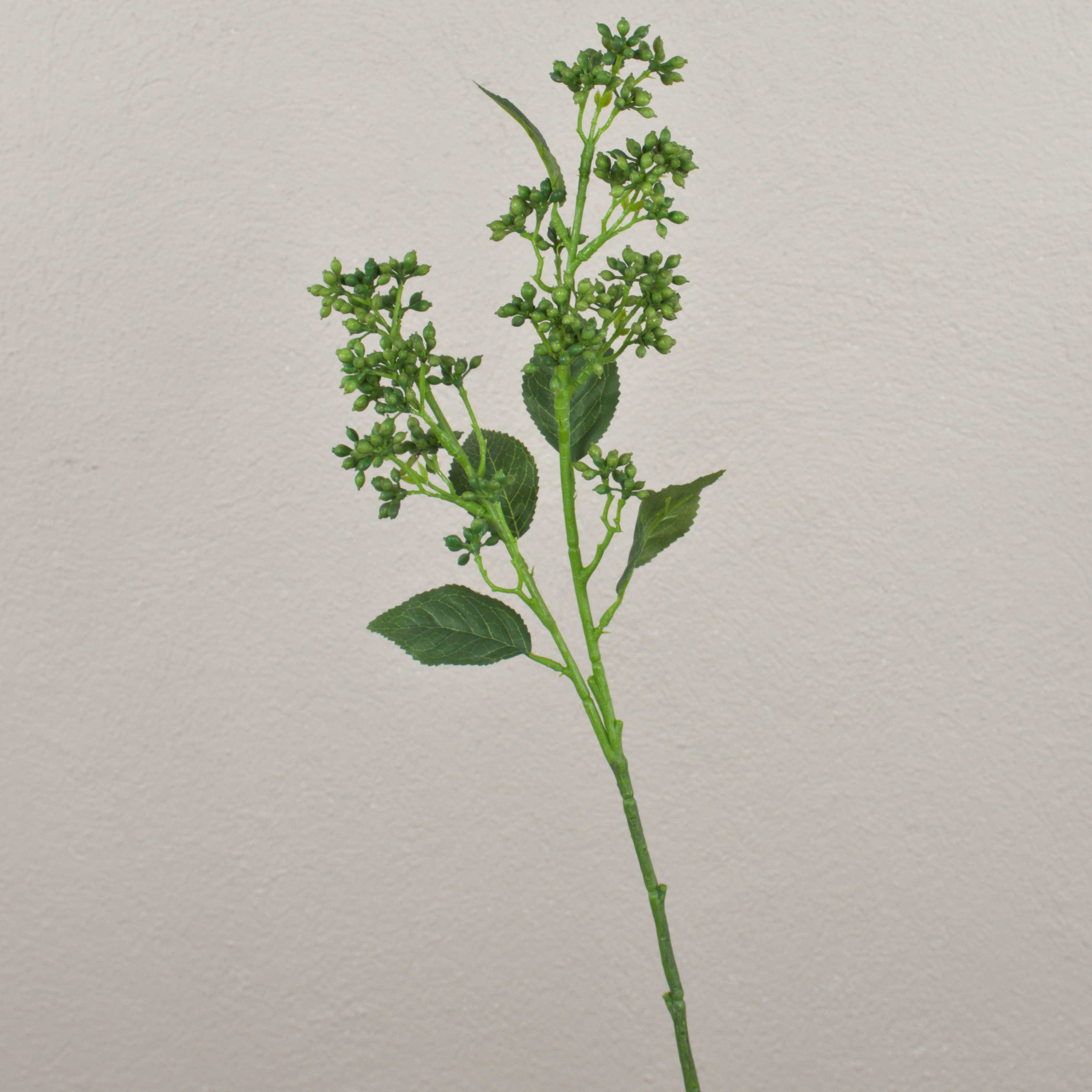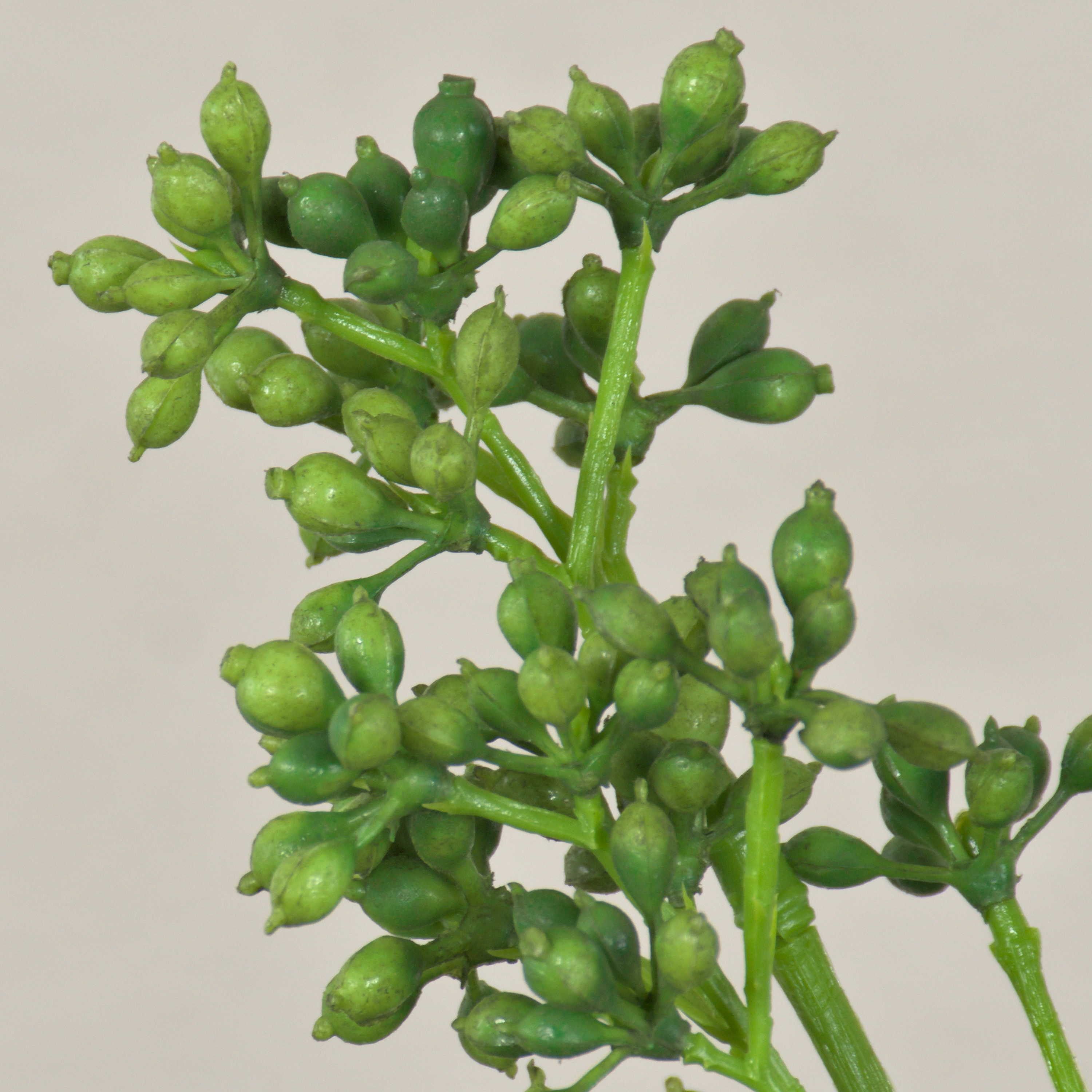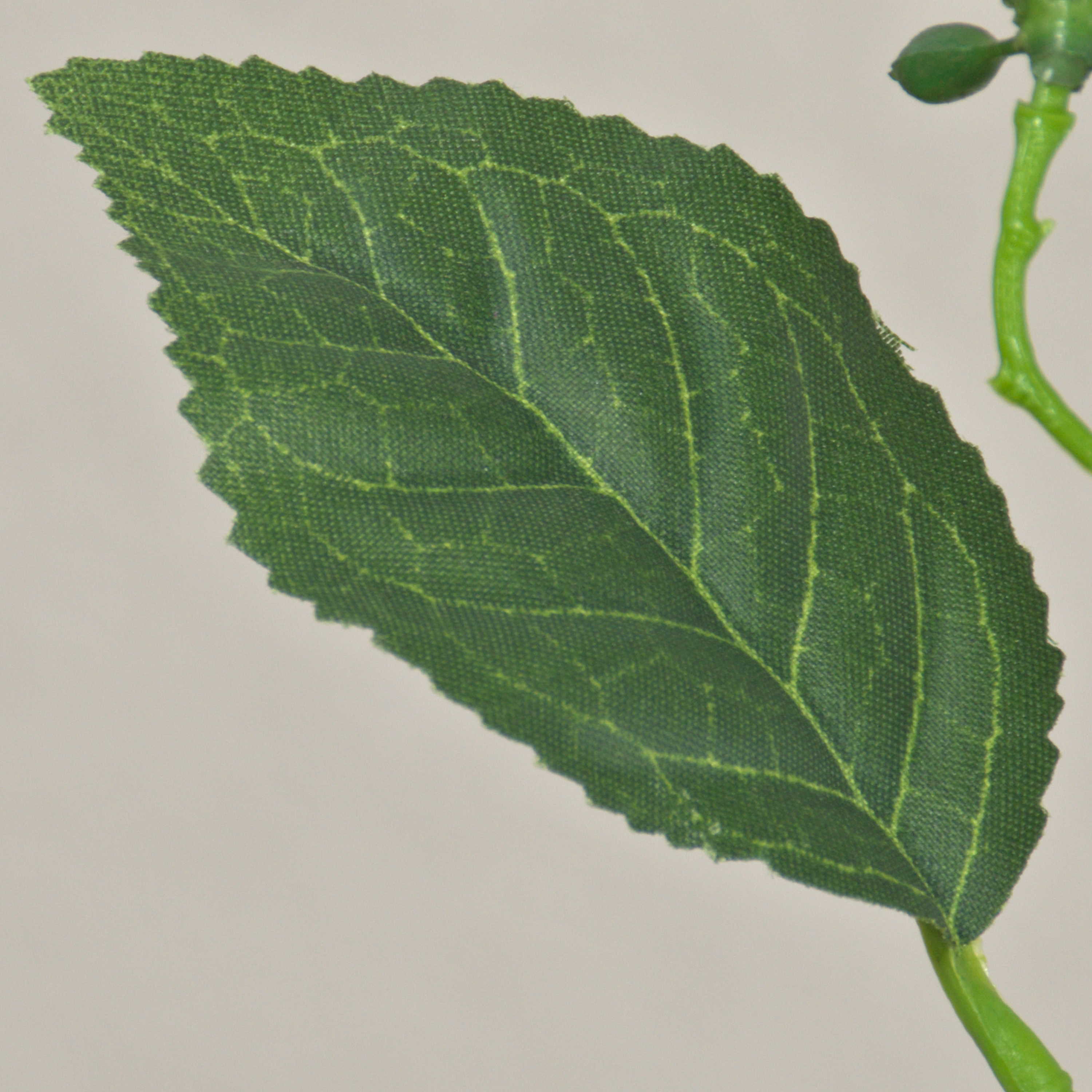- Der Kunststoff Stiel verzweigt sich nach oben hin, die Kunststoff Knospen sind in Form einer Dolde angeordnet, die grünen Textilblätter haben eine deutliche Aderung