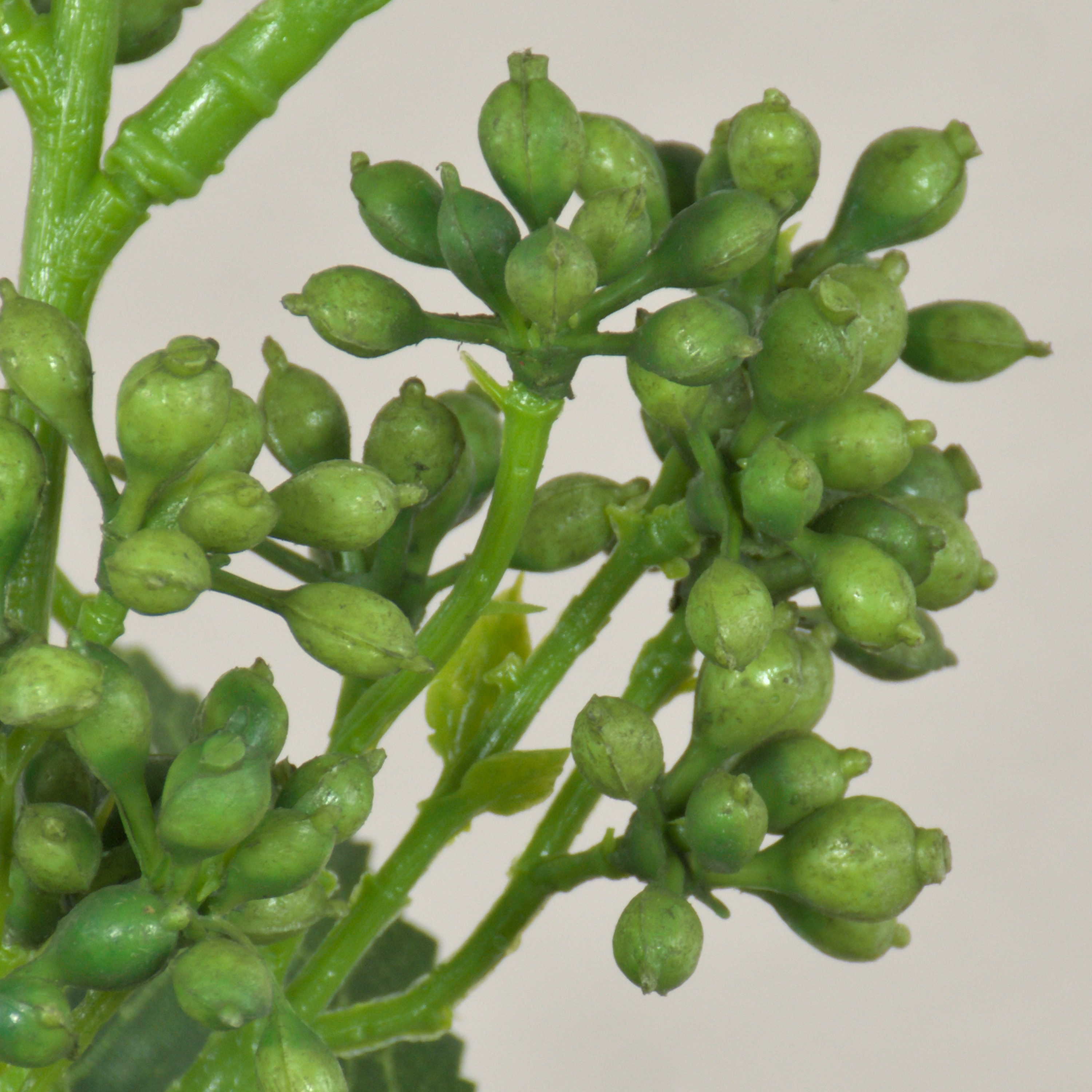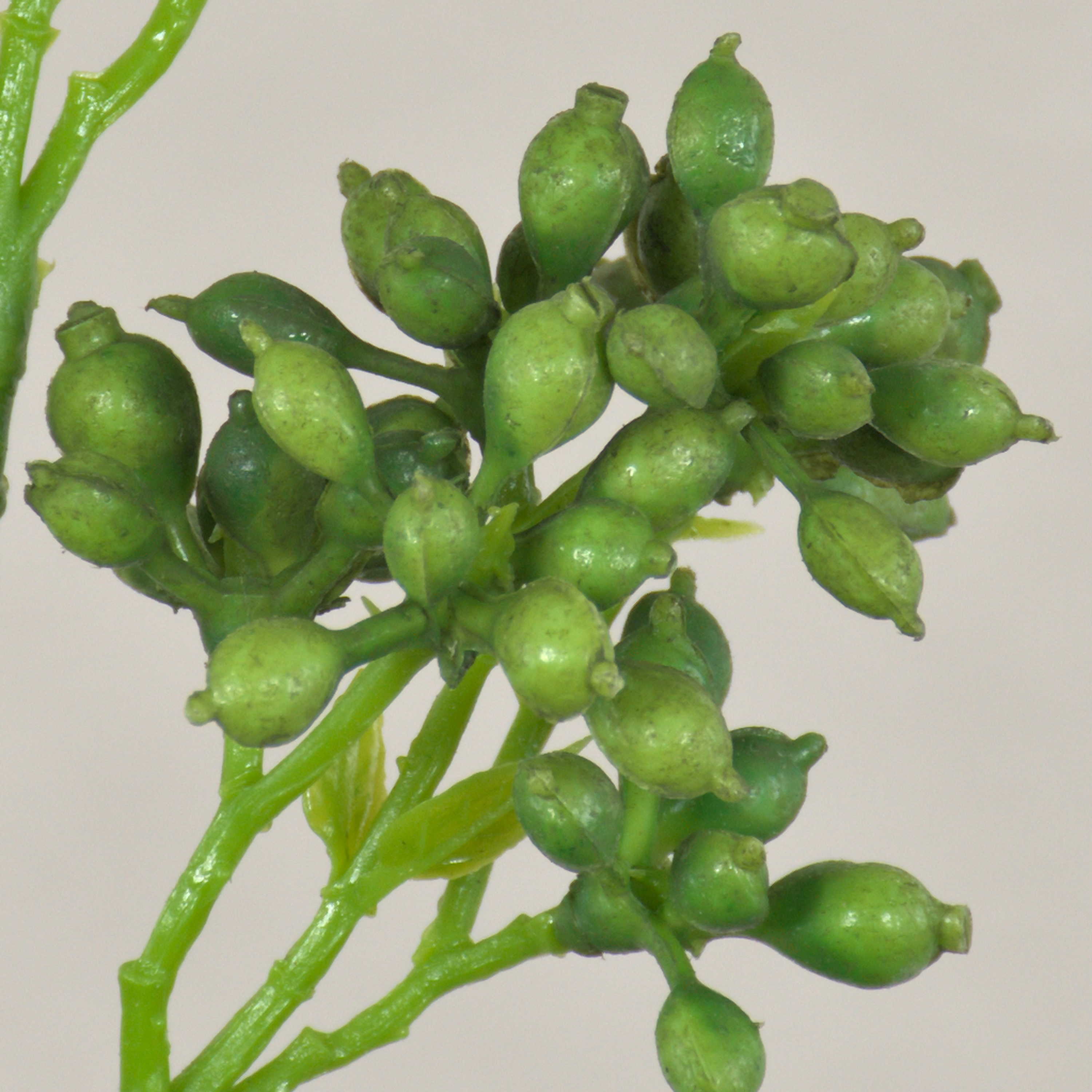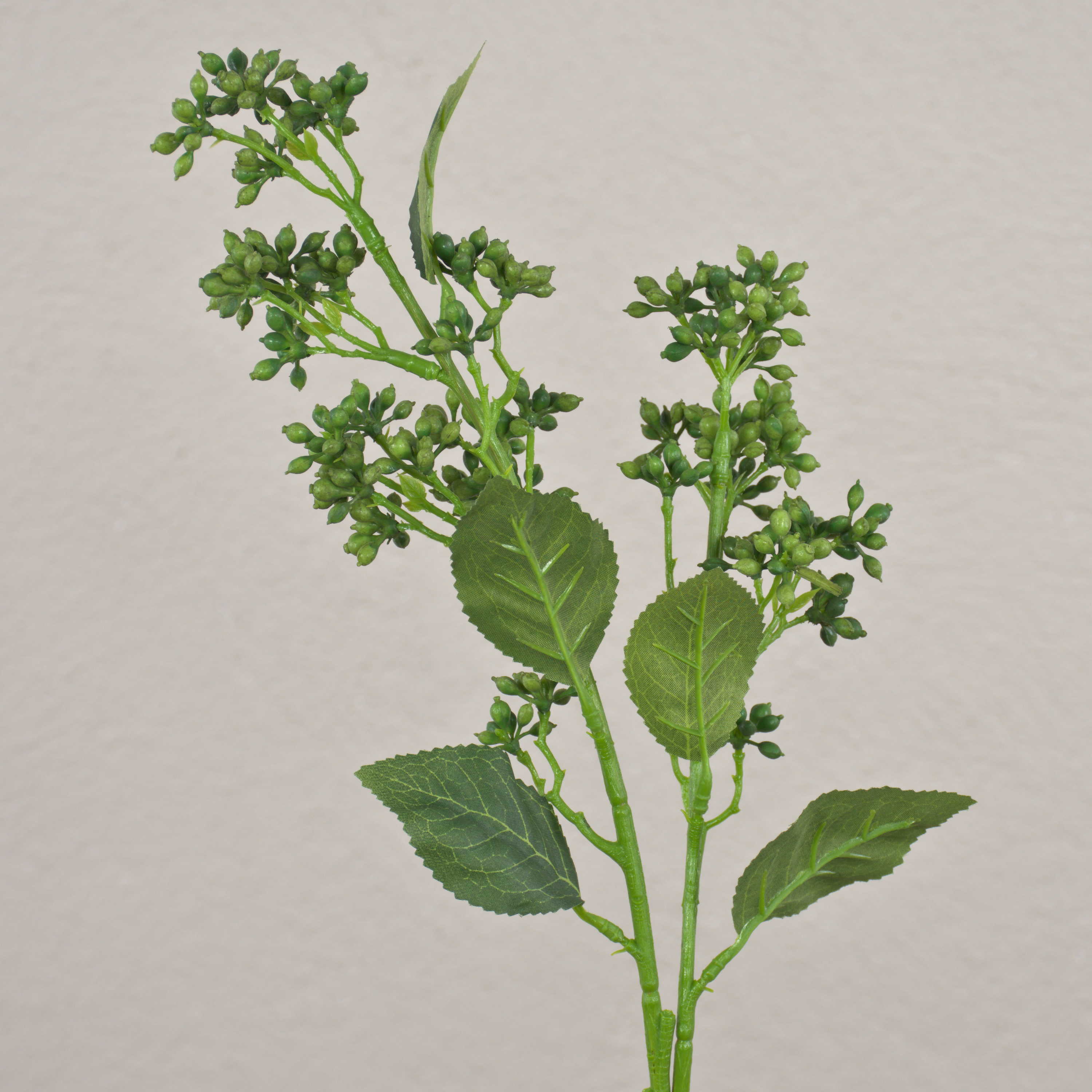 - Der Kunststoff Stiel verzweigt sich nach oben hin, die Kunststoff Knospen sind in Form einer Dolde angeordnet, die grünen Textilblätter haben eine deutliche Aderung