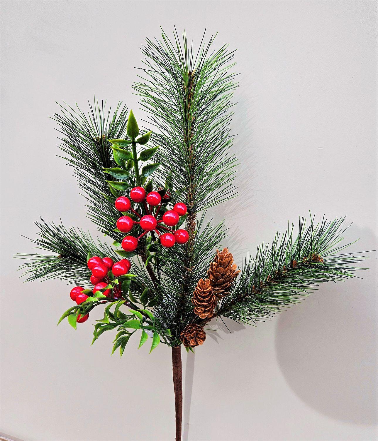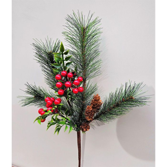 Kunst Zweig FREDEGONDA, Kiefer, Vogelbeeren, Zapfen, rot-grün, 65cm