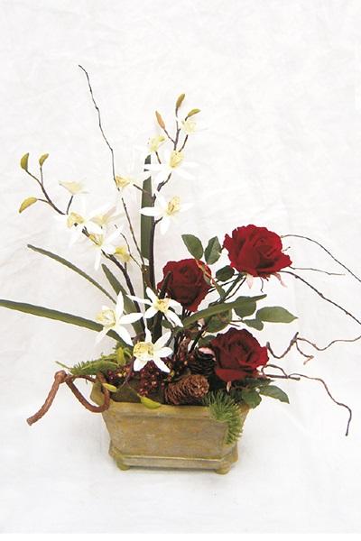 - Mit Rosen, Dendrobium Orchidee, Korkenzieherweide, Tanne, Zapfen und Beeren